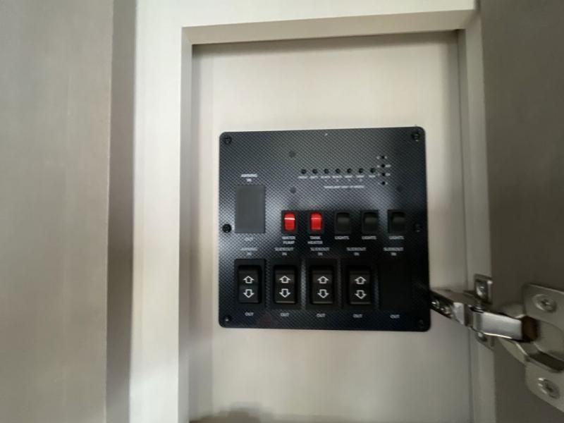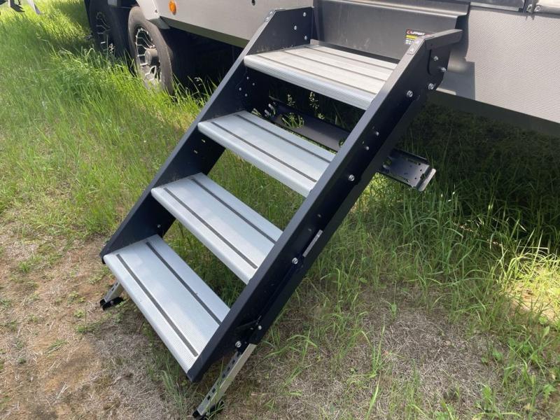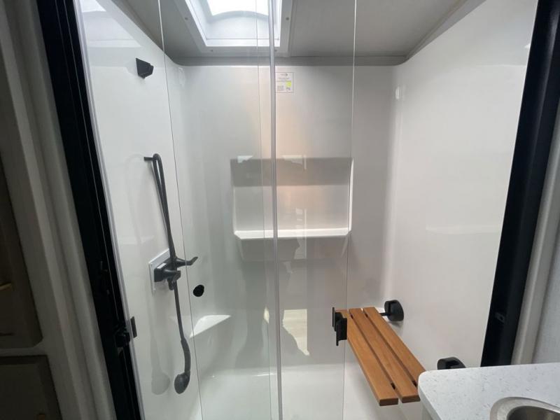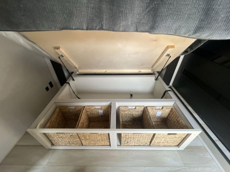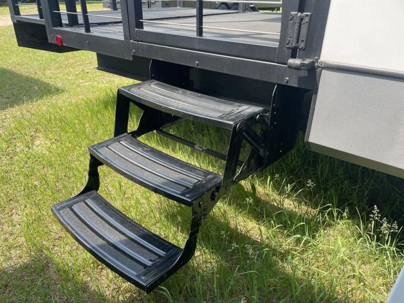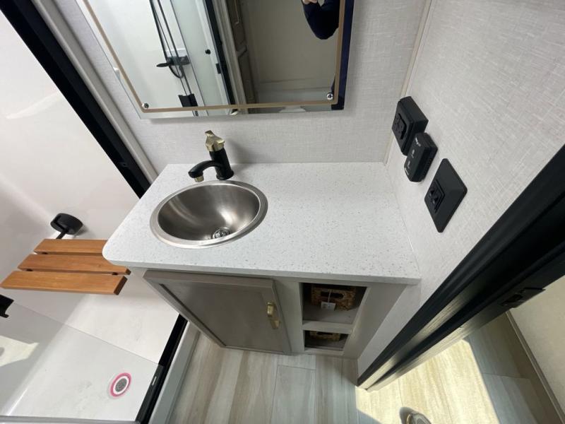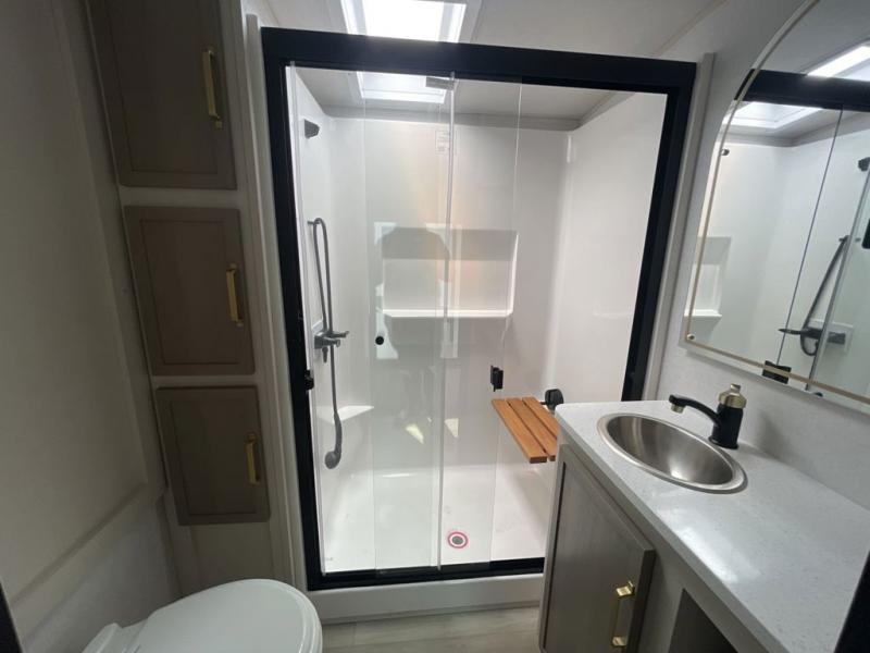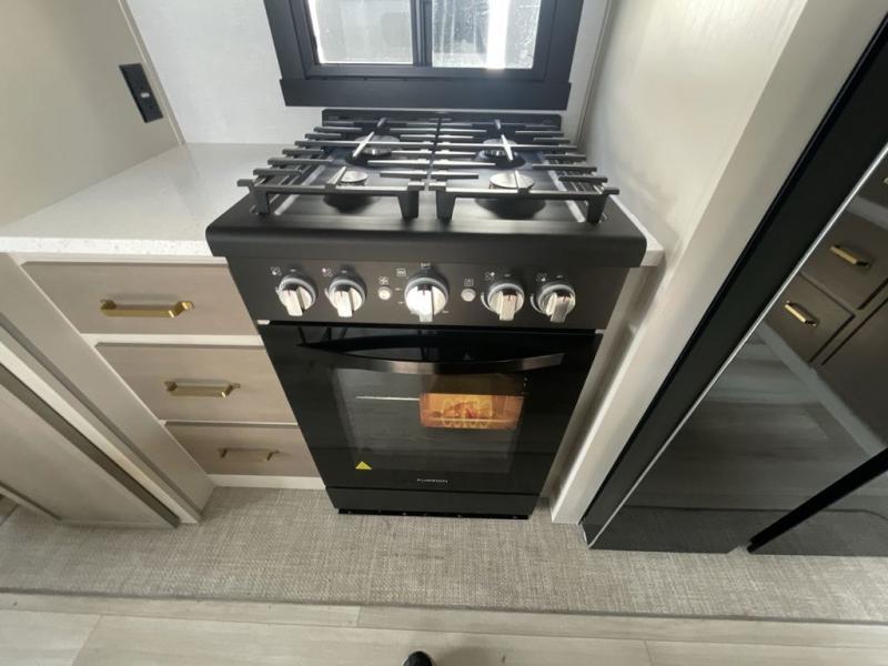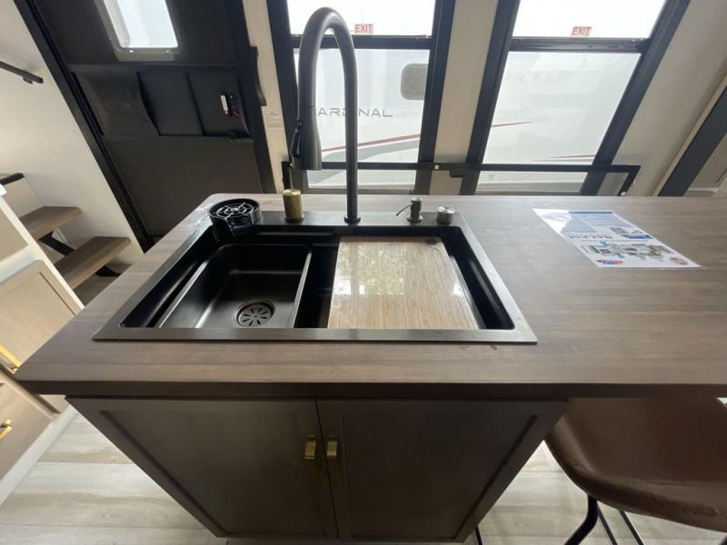 Camping trips and extended stays just got sweeter in this spacious fifth wheel! The rear veranda/porch with a kitchen lets you grill up some burgers as you visit in your camp chairs with friends. Once you head inside, you can make it a movie night since there is a sectional sofa with an ottoman across from the 65" TV and fireplace. A kitchen island with four chairs provides a place to dine together, and there is plenty of food storage between the pantry and 16 cu. ft. 12V refrigerator. You'll love having a custom king bed slide in the front bedroom, along with a dresser and a bench, a wardrobe, plus washer and dryer prep!