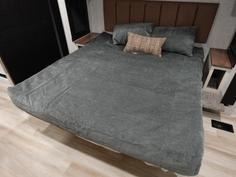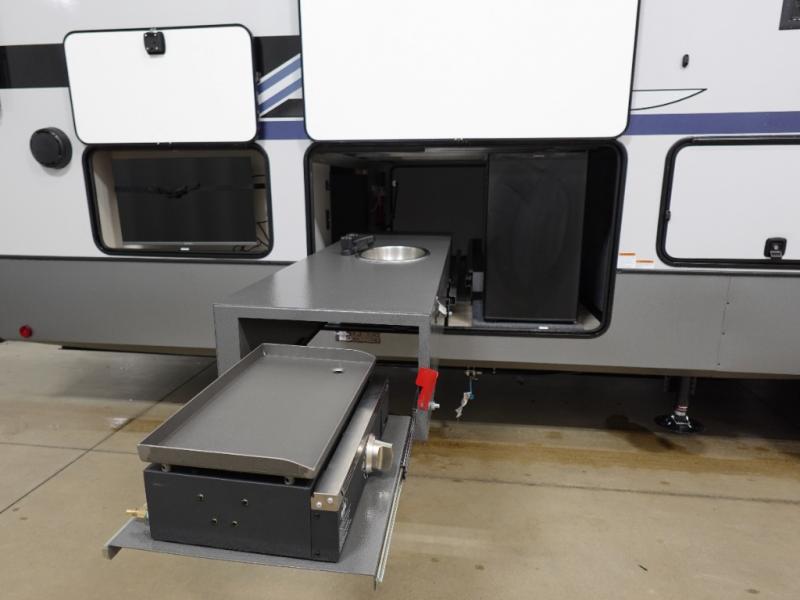 With each Forest River Salem Hemisphere Elite fifth wheel, there are laminated "Aluma Frame" sidewalls and floor with block foam insulation and a full-profile wrap-around front cap. There are also power stabilizer jacks and landing gear outside, along with back up camera prep and Lippert On-The-Go ladder prep, plus an AccessiBelly Underbelly for added protection against the elements. The included Elevated Value Package features high-end solid surface countertops, a JBL sound system, and an RV Airflow mechanism, which provides a minimum of 25% better airflow. You'll find even more amenities within the Expedition Package, such as an in-line water filtration system, a king bed in the master bedrooms, a spacious 20 cu. ft. refrigerator, a 24" four burner "turkey-sized" gas range, and more residential features!
