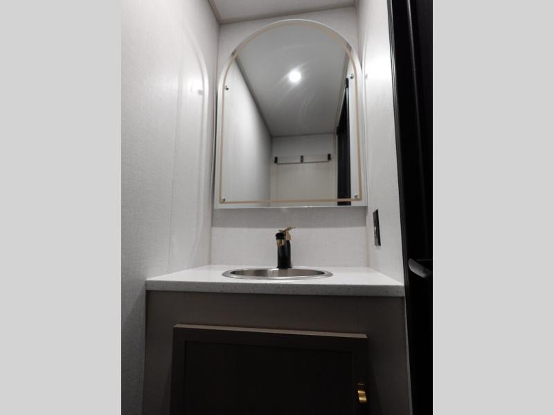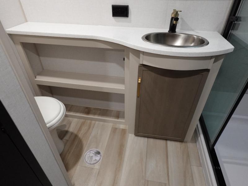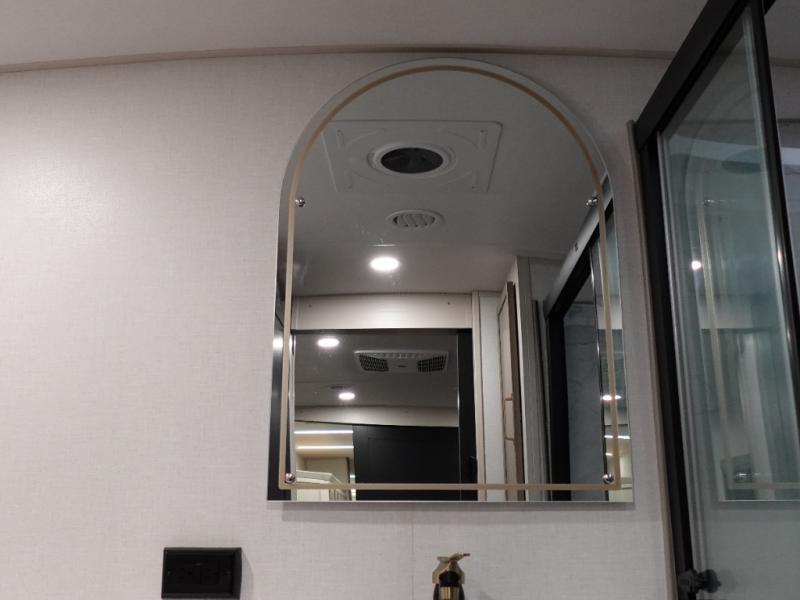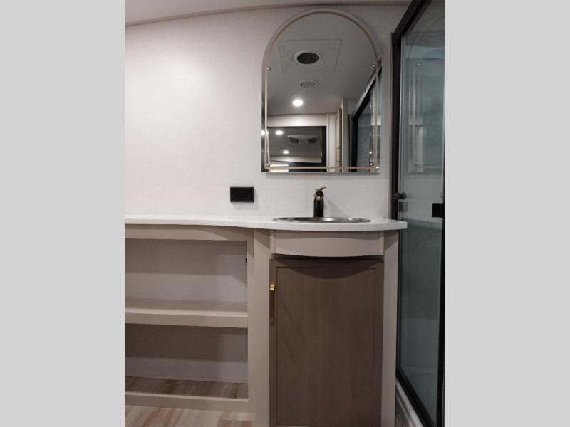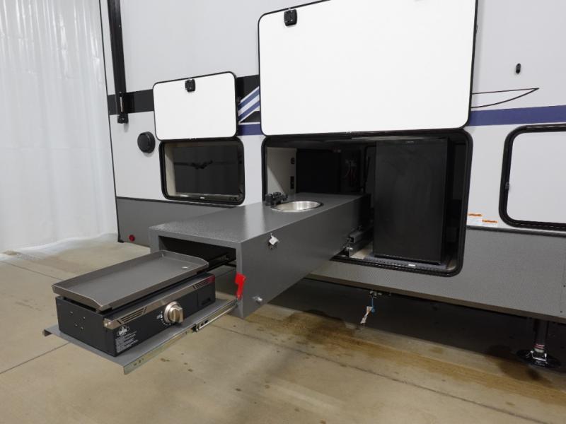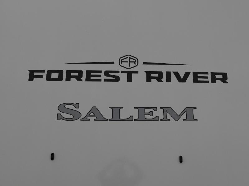 This Salem Hemisphere Elite fifth wheel is quite literally going to amaze you! The exterior has an extensive amount of storage space with its three pass-through storage compartments. The interior also has many storage locations, like the pantry for your dry and canned goods, 20-cubic foot refrigerator, additional storage over the half bath, linen closet, bedroom dresser, and bathroom wardrobe. In the master suite, you'll find extra space with an extra-wide bed slide, and the residential walk-in shower with skylight is going to make morning routines enjoyable. Each day you can sit down in one of the swivel bar stools at the breakfast bar and take in the beautiful views from the panoramic windows. You'll also love to spend your time at the front in the separate living room relaxing on one of the two tri-fold sofas or on the theater seating.
