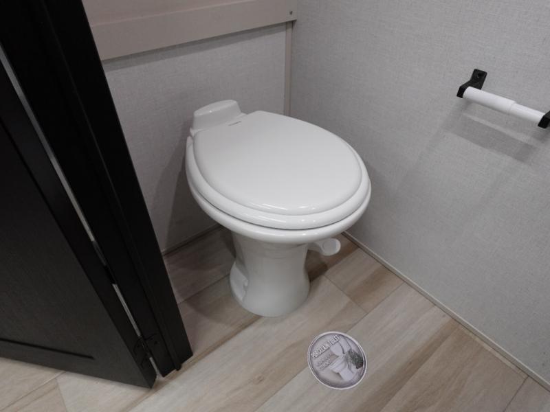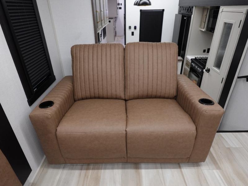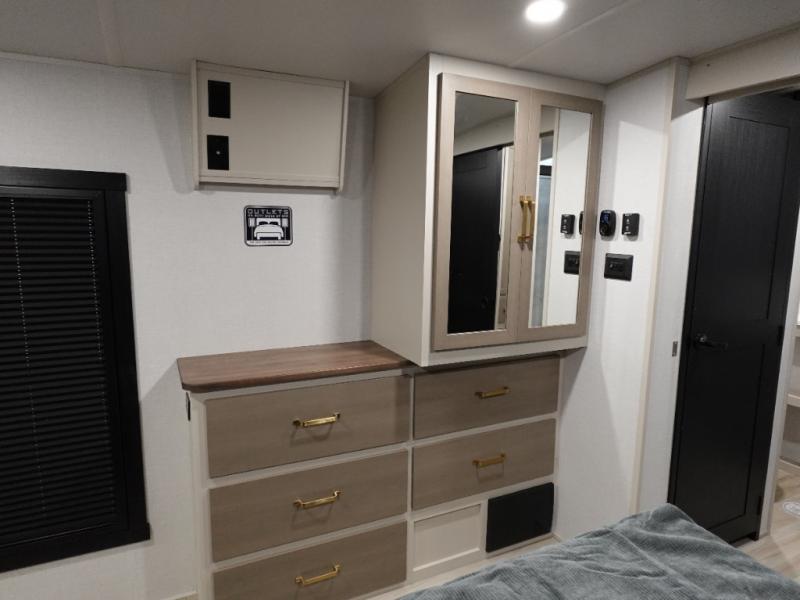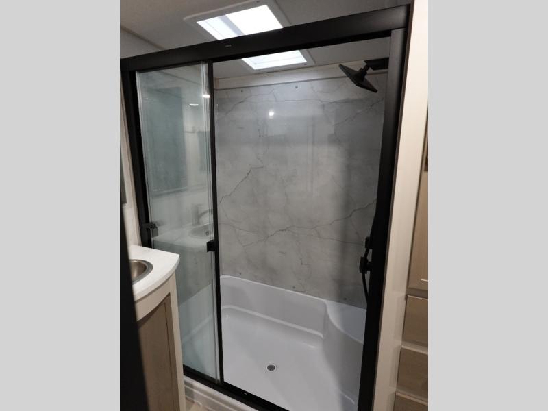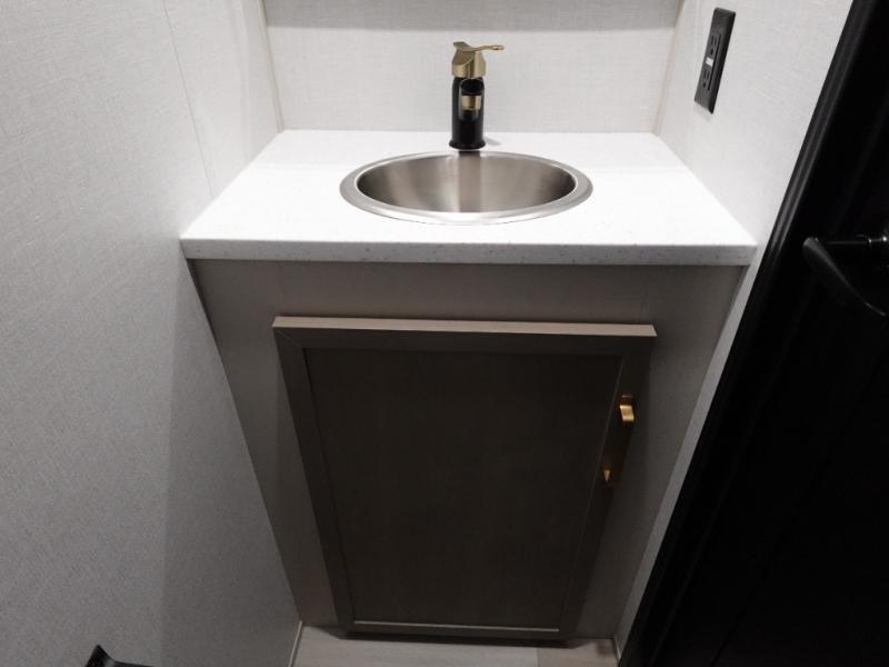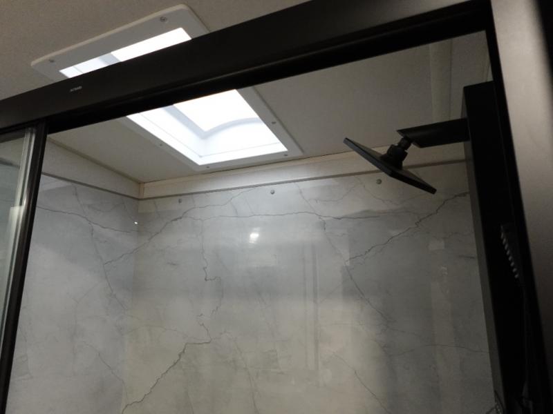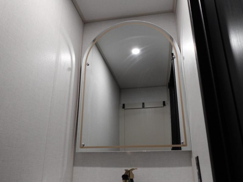 This Salem Hemisphere Elite fifth wheel is quite literally going to amaze you! The exterior has an extensive amount of storage space with its three pass-through storage compartments. The interior also has many storage locations, like the pantry for your dry and canned goods, 20-cubic foot refrigerator, additional storage over the half bath, linen closet, bedroom dresser, and bathroom wardrobe. In the master suite, you'll find extra space with an extra-wide bed slide, and the residential walk-in shower with skylight is going to make morning routines enjoyable. Each day you can sit down in one of the swivel bar stools at the breakfast bar and take in the beautiful views from the panoramic windows. You'll also love to spend your time at the front in the separate living room relaxing on one of the two tri-fold sofas or on the theater seating.