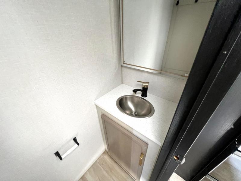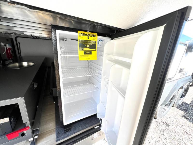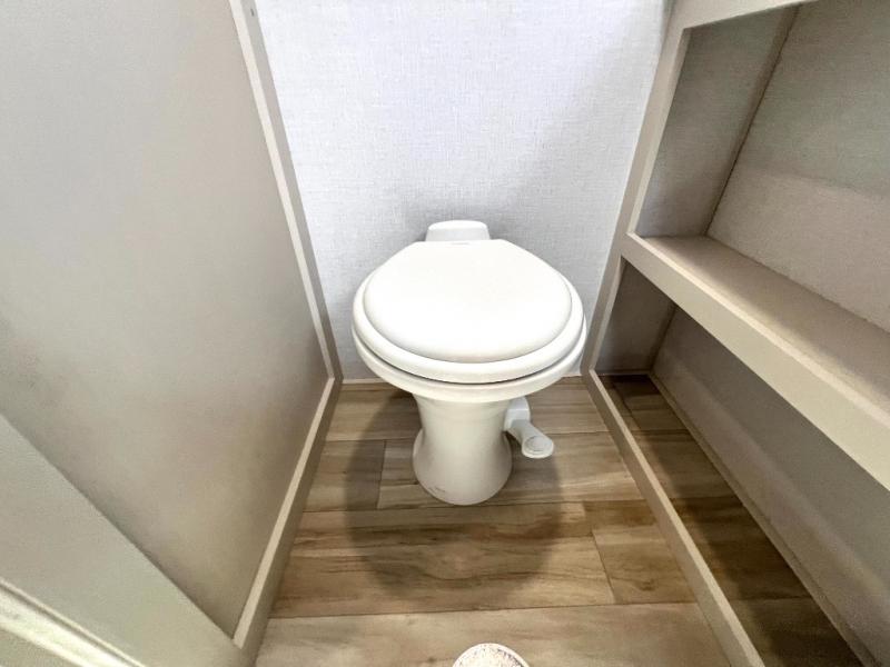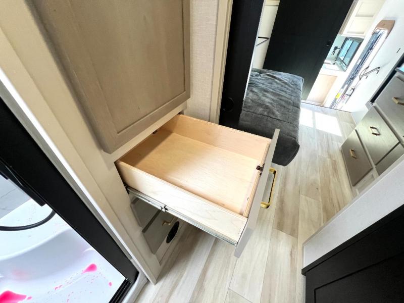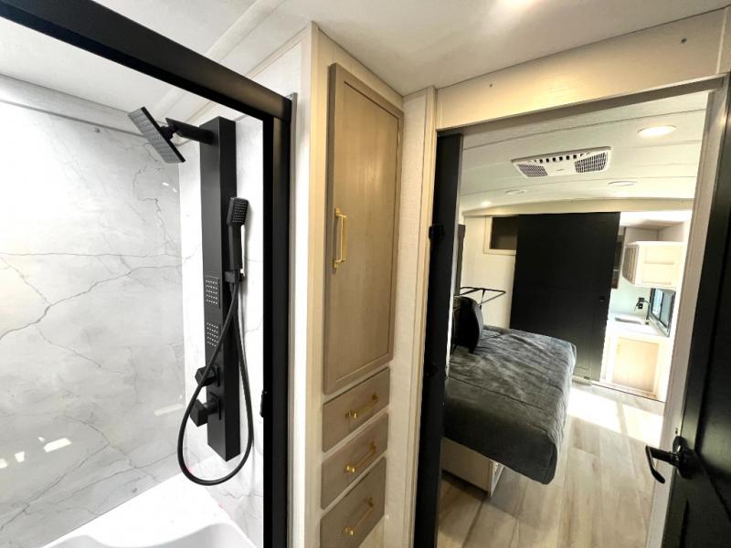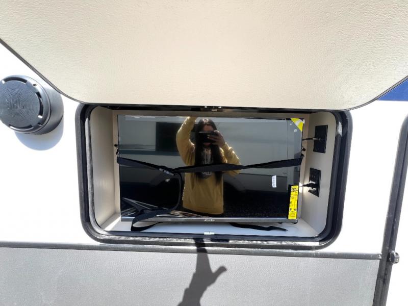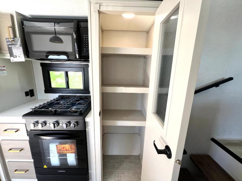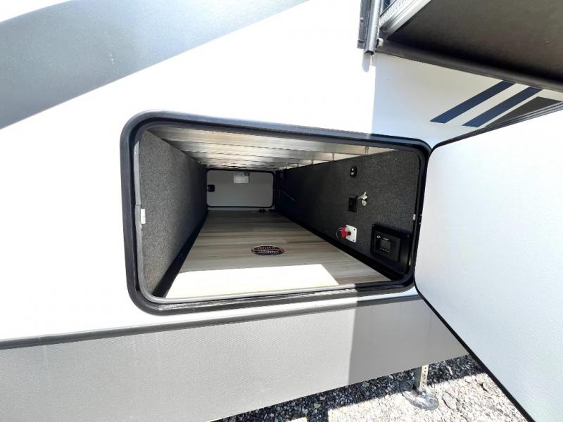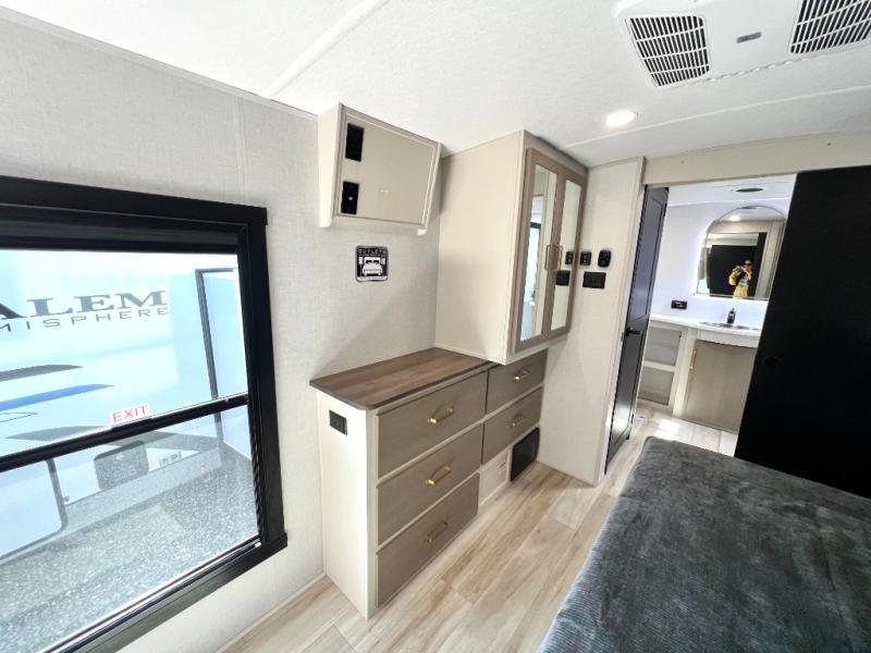 This Salem Hemisphere Elite fifth wheel is quite literally going to amaze you! The exterior has an extensive amount of storage space with its three pass-through storage compartments. The interior also has many storage locations, like the pantry for your dry and canned goods, 20-cubic foot refrigerator, additional storage over the half bath, linen closet, bedroom dresser, and bathroom wardrobe. In the master suite, you'll find extra space with an extra-wide bed slide, and the residential walk-in shower with skylight is going to make morning routines enjoyable. Each day you can sit down in one of the swivel bar stools at the breakfast bar and take in the beautiful views from the panoramic windows. You'll also love to spend your time at the front in the separate living room relaxing on one of the two tri-fold sofas or on the theater seating.