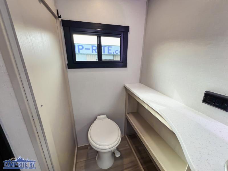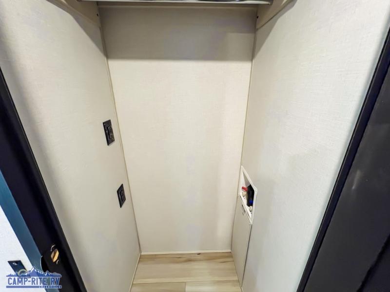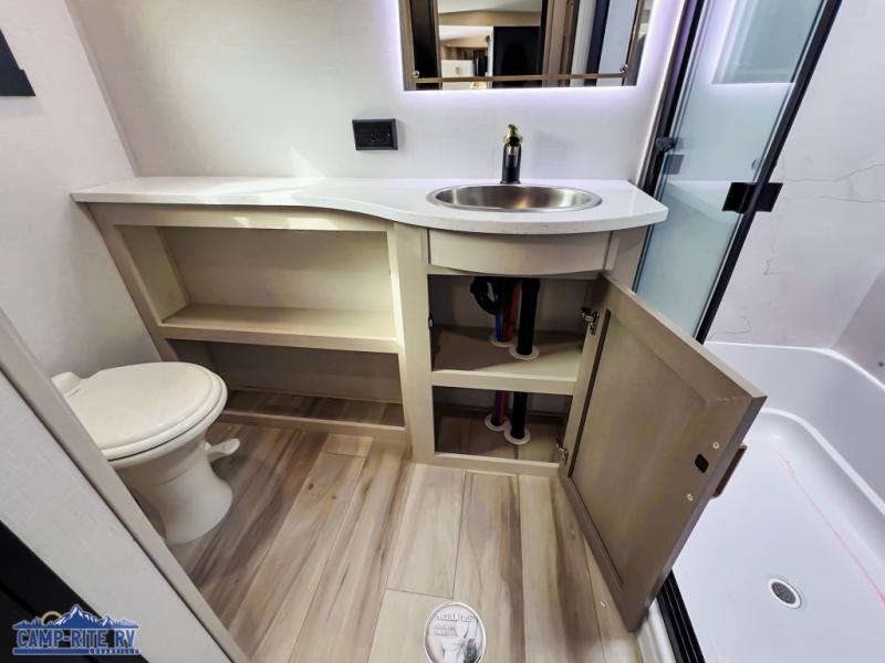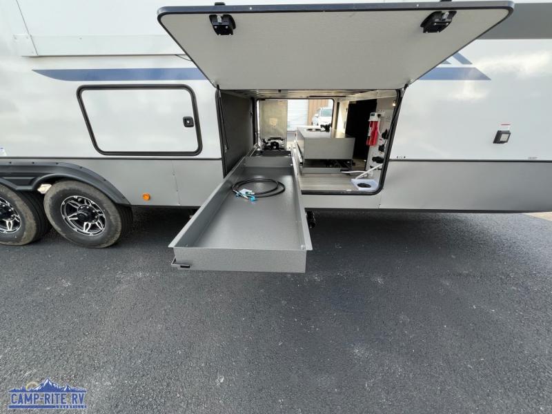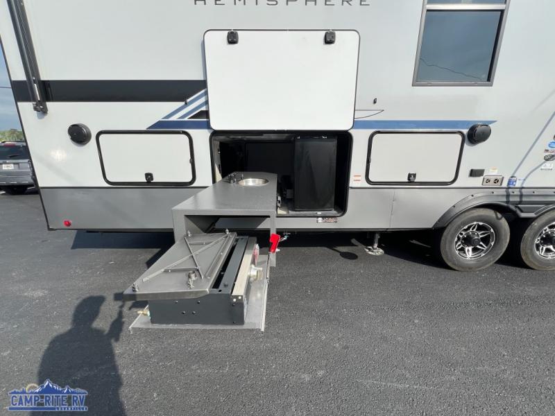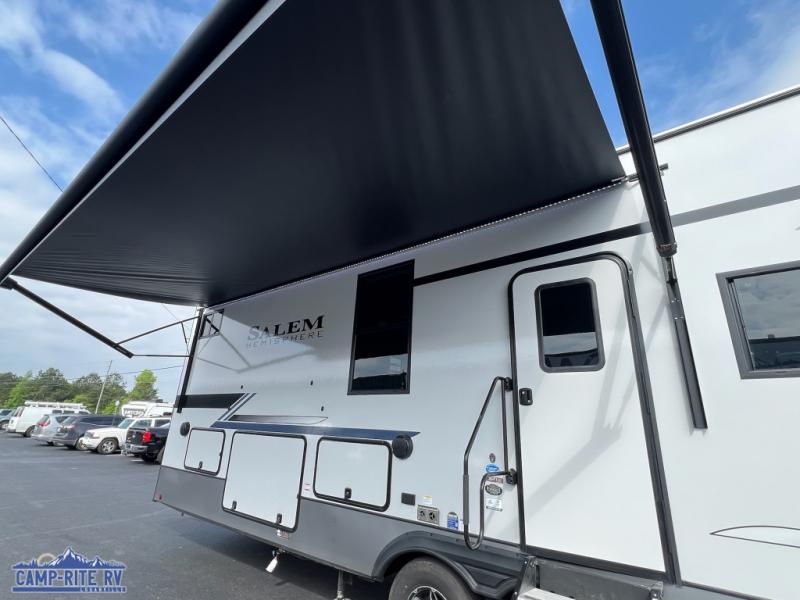 This Salem Hemisphere Elite fifth wheel is quite literally going to amaze you! The exterior has an extensive amount of storage space with its three pass-through storage compartments. The interior also has many storage locations, like the pantry for your dry and canned goods, 20-cubic foot refrigerator, additional storage over the half bath, linen closet, bedroom dresser, and bathroom wardrobe. In the master suite, you'll find extra space with an extra-wide bed slide, and the residential walk-in shower with skylight is going to make morning routines enjoyable. Each day you can sit down in one of the swivel bar stools at the breakfast bar and take in the beautiful views from the panoramic windows. You'll also love to spend your time at the front in the separate living room relaxing on one of the two tri-fold sofas or on the theater seating.