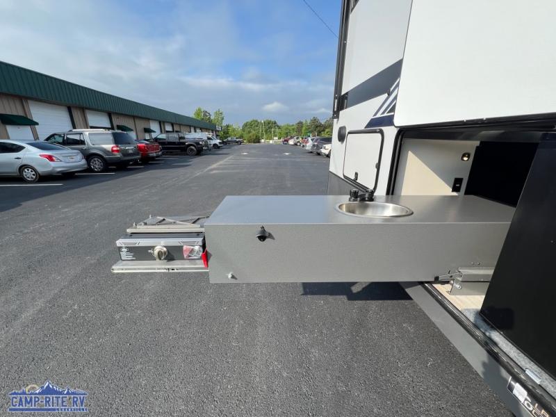 With each Forest River Salem Hemisphere Elite fifth wheel, there are laminated "Aluma Frame" sidewalls and floor with block foam insulation and a full-profile wrap-around front cap. There are also power stabilizer jacks and landing gear outside, along with back up camera prep and Lippert On-The-Go ladder prep, plus an AccessiBelly Underbelly for added protection against the elements. The included Elevated Value Package features high-end solid surface countertops, a JBL sound system, and an RV Airflow mechanism, which provides a minimum of 25% better airflow. You'll find even more amenities within the Expedition Package, such as an in-line water filtration system, a king bed in the master bedrooms, a spacious 20 cu. ft. refrigerator, a 24" four burner "turkey-sized" gas range, and more residential features!