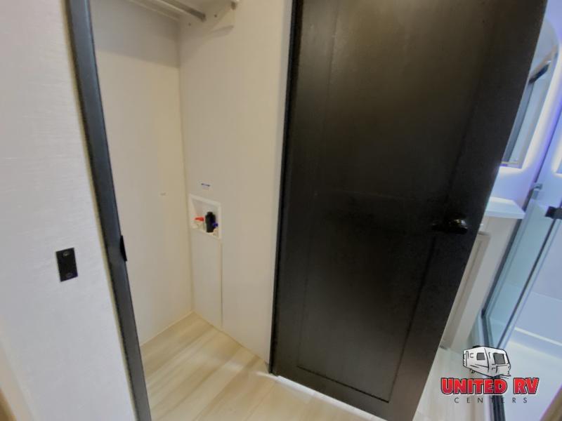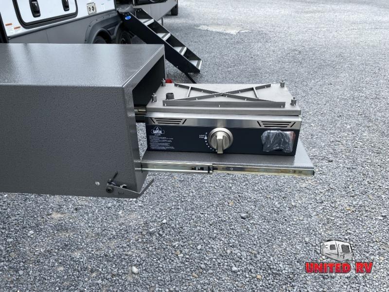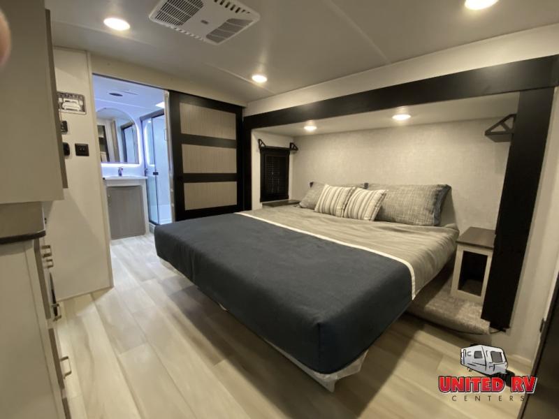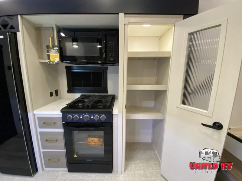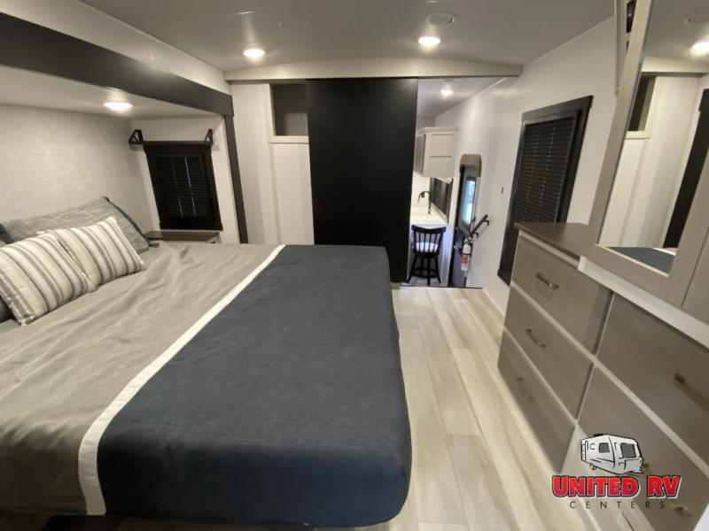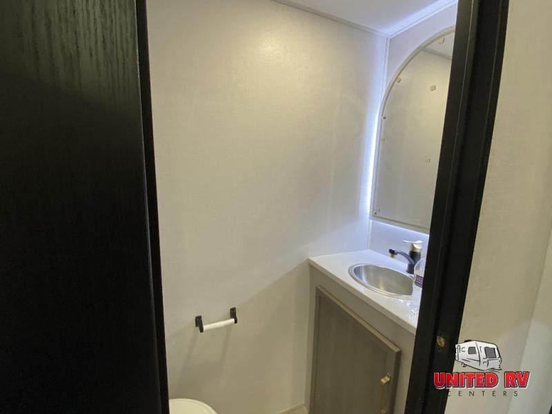 This Salem Hemisphere Elite fifth wheel is quite literally going to amaze you! The exterior has an extensive amount of storage space with its three pass-through storage compartments. The interior also has many storage locations, like the pantry for your dry and canned goods, 20-cubic foot refrigerator, additional storage over the half bath, linen closet, bedroom dresser, and bathroom wardrobe. In the master suite, you'll find extra space with an extra-wide bed slide, and the residential walk-in shower with skylight is going to make morning routines enjoyable. Each day you can sit down in one of the swivel bar stools at the breakfast bar and take in the beautiful views from the panoramic windows. You'll also love to spend your time at the front in the separate living room relaxing on one of the two tri-fold sofas or on the theater seating.