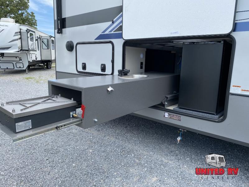 With each Forest River Salem Hemisphere Elite fifth wheel, there are laminated "Aluma Frame" sidewalls and floor with block foam insulation and a full-profile wrap-around front cap. There are also power stabilizer jacks and landing gear outside, along with back up camera prep and Lippert On-The-Go ladder prep, plus an AccessiBelly Underbelly for added protection against the elements. The included Elevated Value Package features high-end solid surface countertops, a JBL sound system, and an RV Airflow mechanism, which provides a minimum of 25% better airflow. You'll find even more amenities within the Expedition Package, such as an in-line water filtration system, a king bed in the master bedrooms, a spacious 20 cu. ft. refrigerator, a 24" four burner "turkey-sized" gas range, and more residential features!