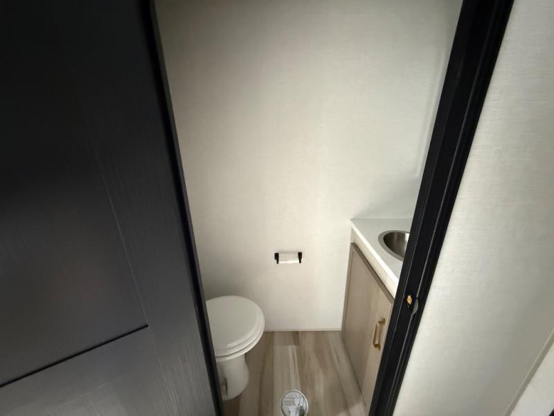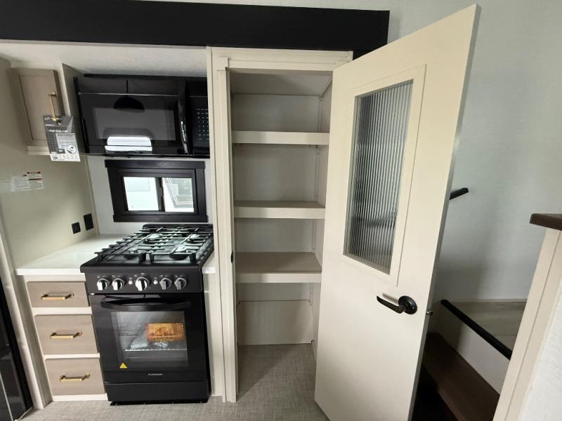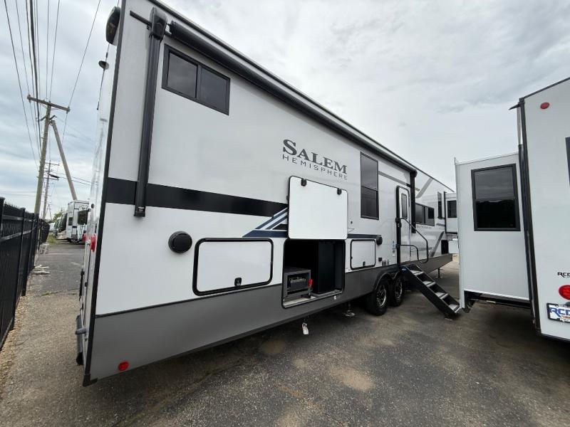 This Salem Hemisphere Elite fifth wheel is quite literally going to amaze you! The exterior has an extensive amount of storage space with its three pass-through storage compartments. The interior also has many storage locations, like the pantry for your dry and canned goods, 20-cubic foot refrigerator, additional storage over the half bath, linen closet, bedroom dresser, and bathroom wardrobe. In the master suite, you'll find extra space with an extra-wide bed slide, and the residential walk-in shower with skylight is going to make morning routines enjoyable. Each day you can sit down in one of the swivel bar stools at the breakfast bar and take in the beautiful views from the panoramic windows. You'll also love to spend your time at the front in the separate living room relaxing on one of the two tri-fold sofas or on the theater seating.