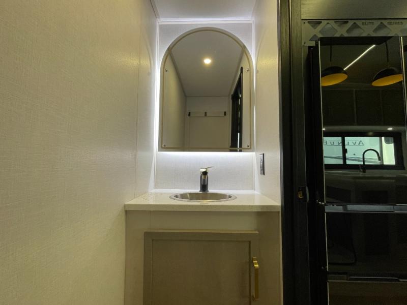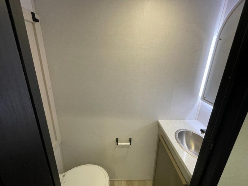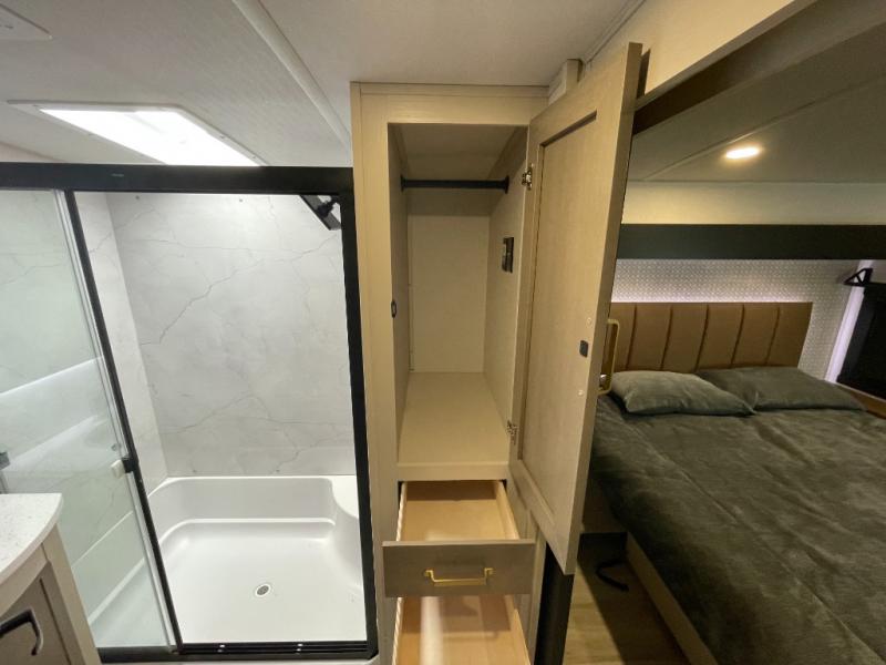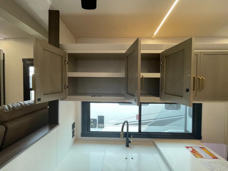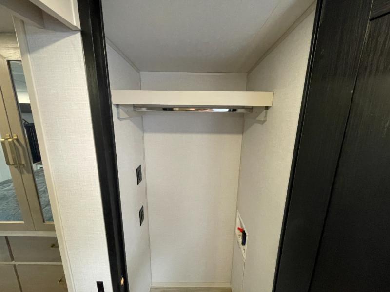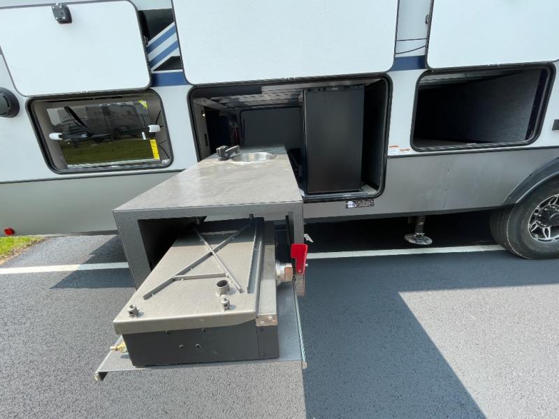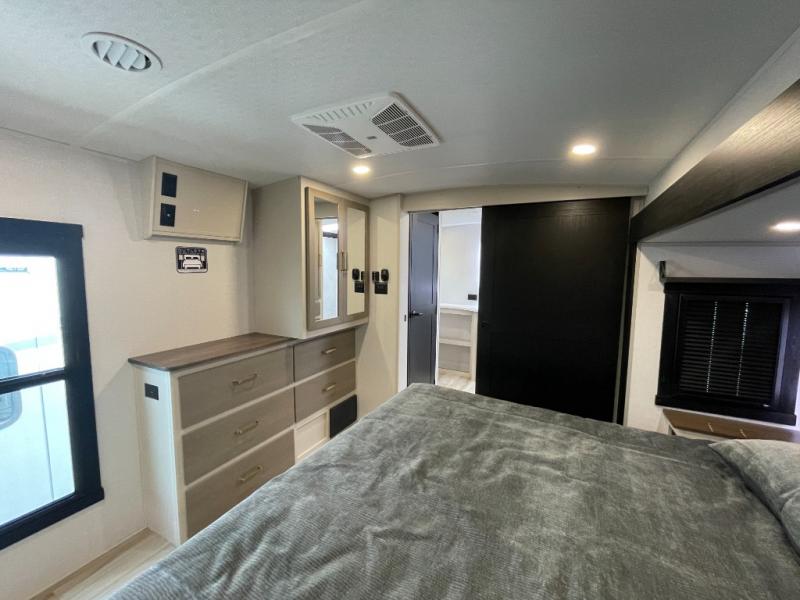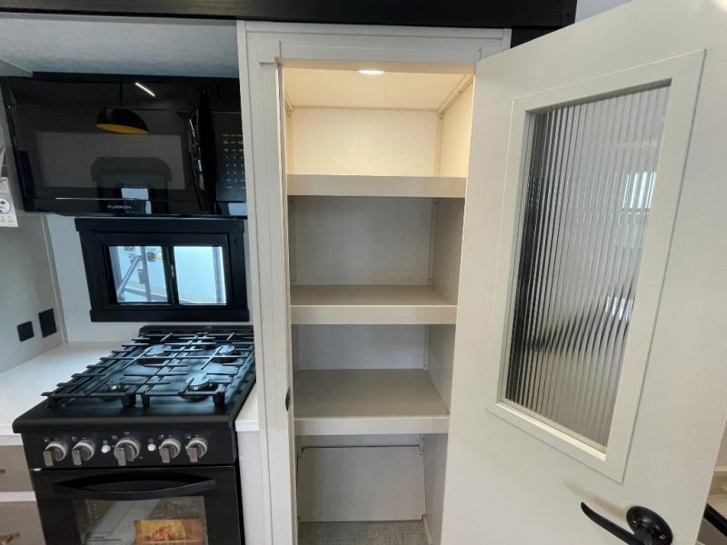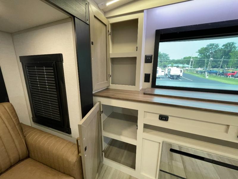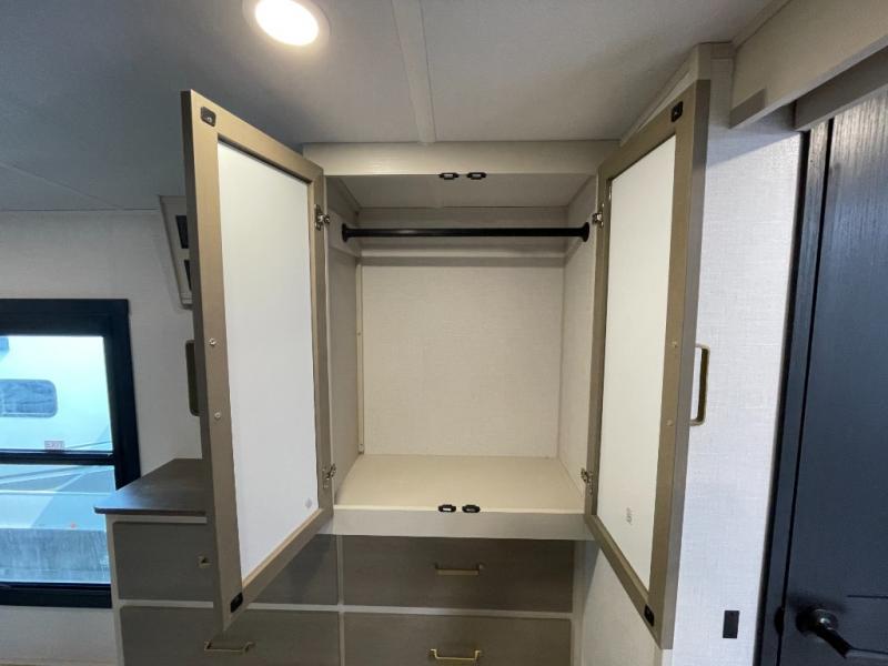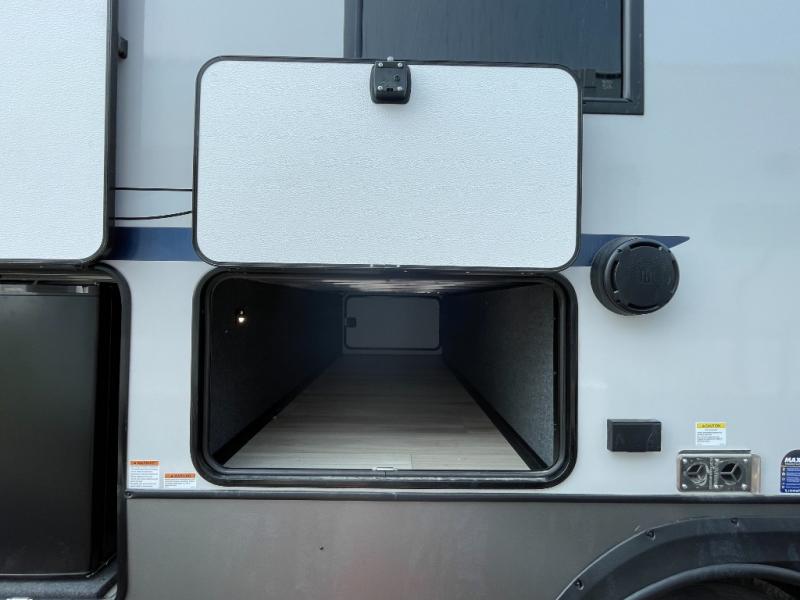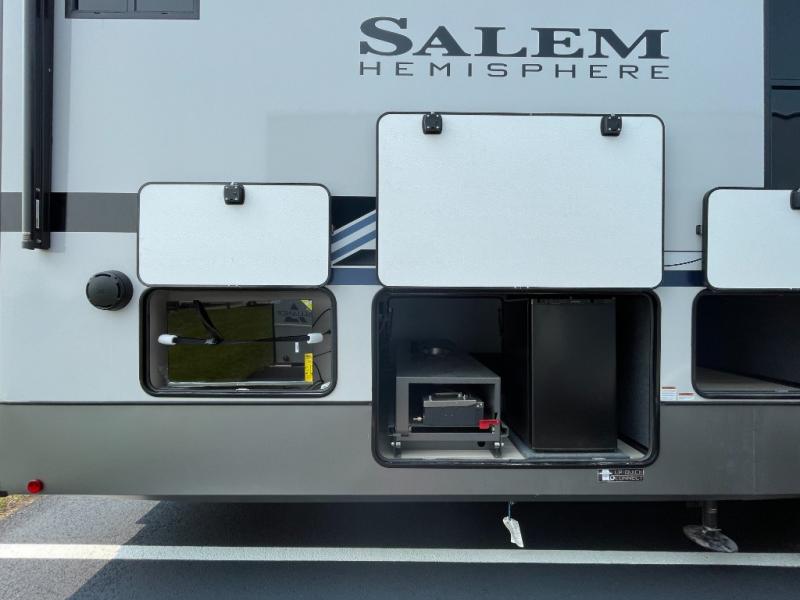 This Salem Hemisphere Elite fifth wheel is quite literally going to amaze you! The exterior has an extensive amount of storage space with its three pass-through storage compartments. The interior also has many storage locations, like the pantry for your dry and canned goods, 20-cubic foot refrigerator, additional storage over the half bath, linen closet, bedroom dresser, and bathroom wardrobe. In the master suite, you'll find extra space with an extra-wide bed slide, and the residential walk-in shower with skylight is going to make morning routines enjoyable. Each day you can sit down in one of the swivel bar stools at the breakfast bar and take in the beautiful views from the panoramic windows. You'll also love to spend your time at the front in the separate living room relaxing on one of the two tri-fold sofas or on the theater seating.
