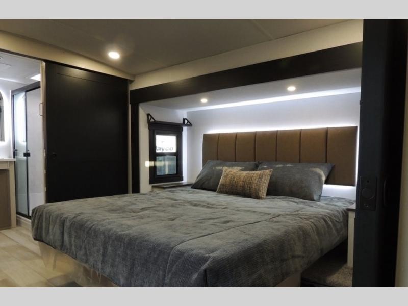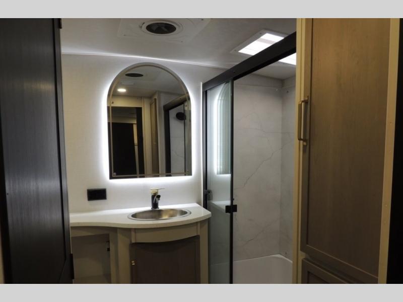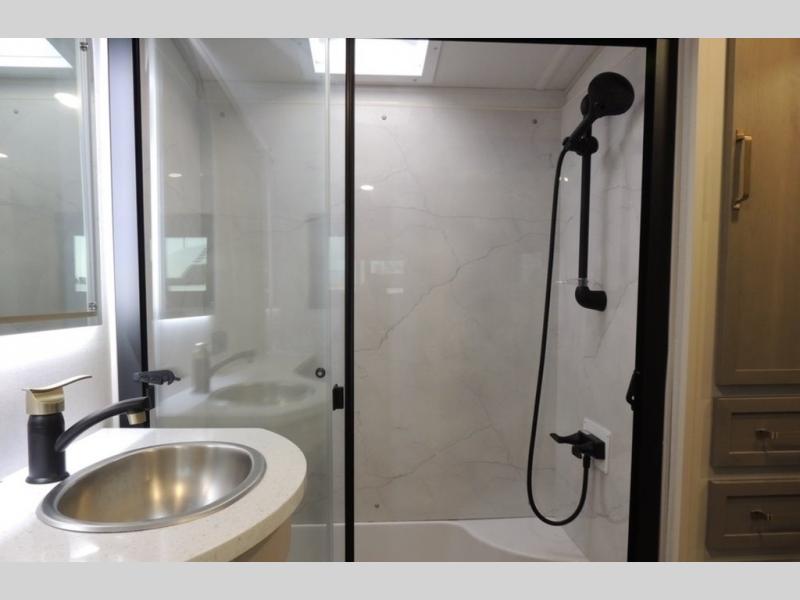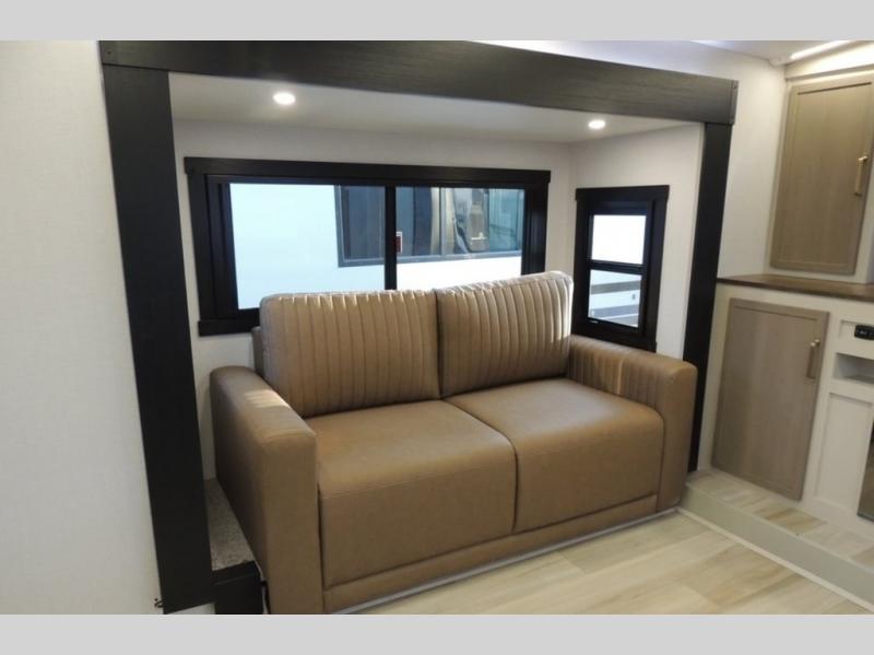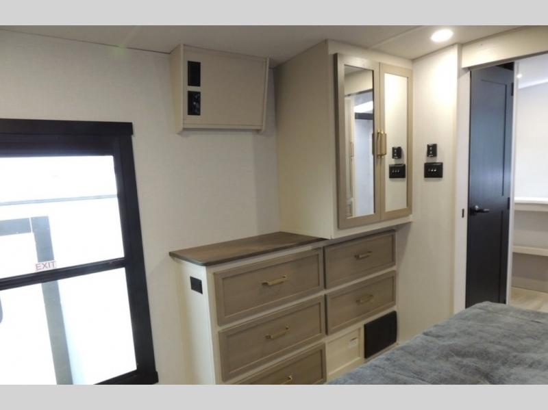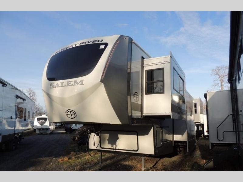 This Salem Hemisphere Elite fifth wheel is quite literally going to amaze you! The exterior has an extensive amount of storage space with its three pass-through storage compartments. The interior also has many storage locations, like the pantry for your dry and canned goods, 20-cubic foot refrigerator, additional storage over the half bath, linen closet, bedroom dresser, and bathroom wardrobe. In the master suite, you'll find extra space with an extra-wide bed slide, and the residential walk-in shower with skylight is going to make morning routines enjoyable. Each day you can sit down in one of the swivel bar stools at the breakfast bar and take in the beautiful views from the panoramic windows. You'll also love to spend your time at the front in the separate living room relaxing on one of the two tri-fold sofas or on the theater seating.