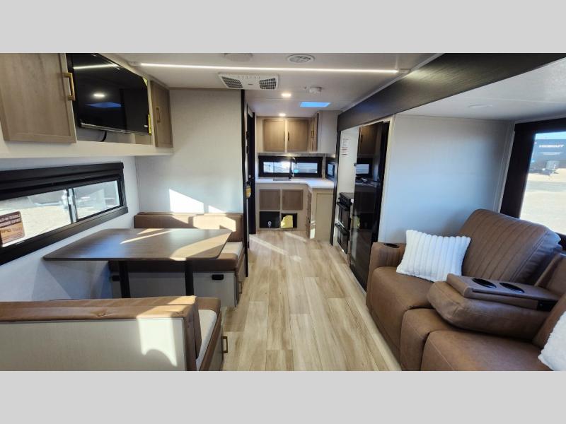 This Salem Hemisphere Hyper-Lyte trailer is perfect for a couple or even three or four if you don't mind converting the dinette for added sleeping space. And the large slide will provide more space to stretch out. Snuggle up each night on the queen bed with Versa-Tilt for a great night's rest and enjoy the 30" x 36" shower with skylight as you wake. A 16' awning provides added living space and protection from the elements if you want to enjoy as much time outdoors as possible. No worries about packing all of your fun games both inside and out; with the Texas size pass-through storage you can bring it all along!