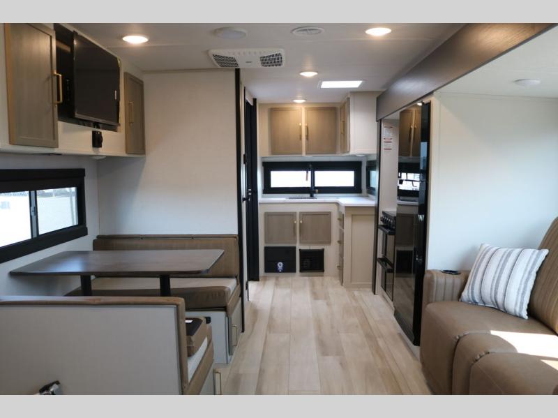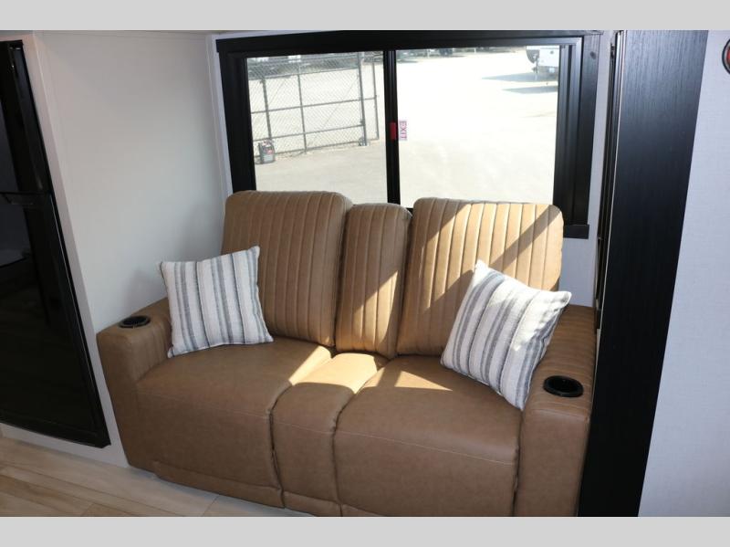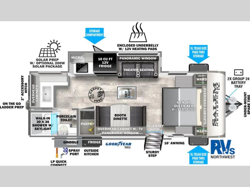 This Salem Hemisphere Hyper-Lyte trailer is perfect for a couple or even three or four if you don't mind converting the dinette for added sleeping space. And the large slide will provide more space to stretch out. Snuggle up each night on the queen bed with Versa-Tilt for a great night's rest and enjoy the 30" x 36" walk-in shower with skylight as you wake. A 16' awning provides added living space and protection from the elements if you want to enjoy as much time outdoors as possible, even cooking can be done with the outside kitchen including a refrigerator, griddle, and spray port for cleaning up. No worries about packing all of your fun games both inside and out; with the Texas size pass-through storage you can bring it all along!