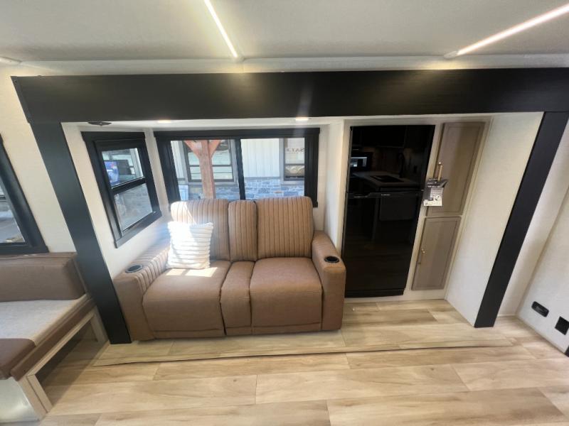 This dual entry travel trailer is perfect for your family or group of four! There is a front master bedroom up front with its own exterior entry door so you can slip out in the morning to go fish. You'll also find a queen bed with Versa-Tilt, dual bedroom wardrobes, and easy access to the walk-through bath. Any guests you have can sleep on the U-shaped dinette in the back, and in the morning, everyone can enjoy breakfast here before heading out for the day. You can prepare lunch in the full kitchen that includes a countertop extension for convenience, plus a 12V refrigerator and a pantry for food storage. If the weather is nice, you might just want to cook on the exterior griddle, and the outdoor refrigerator will let you store cold drinks! On the rainy days you can plan to relax on the theater seating within the slide out and watch a movie on the 40" LED TV. There is even a fireplace for a more cozy feel.
