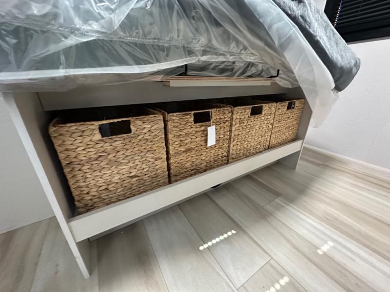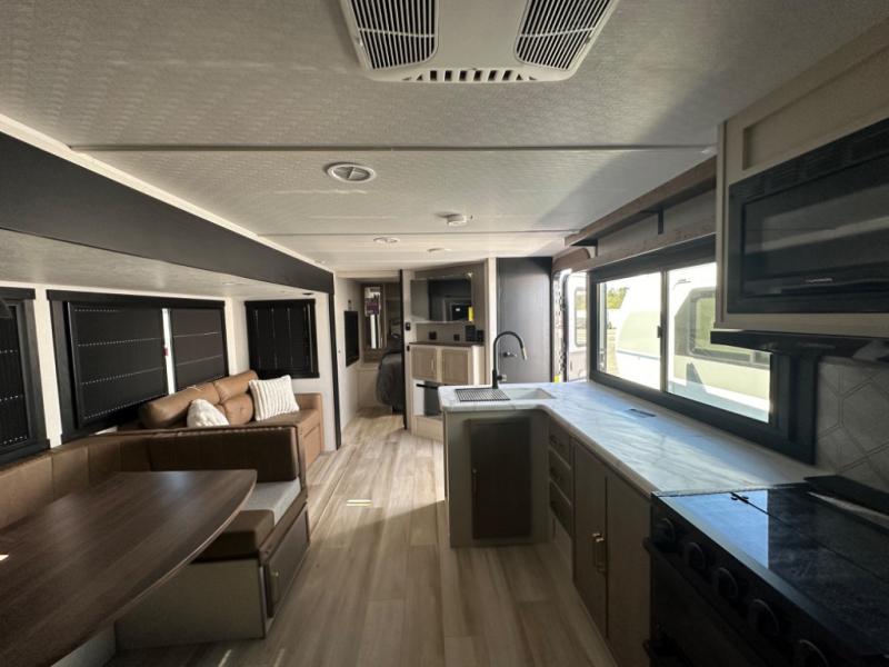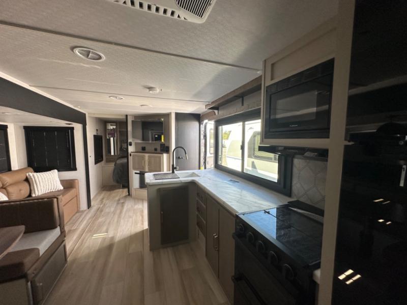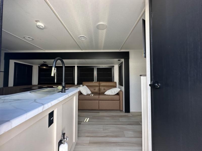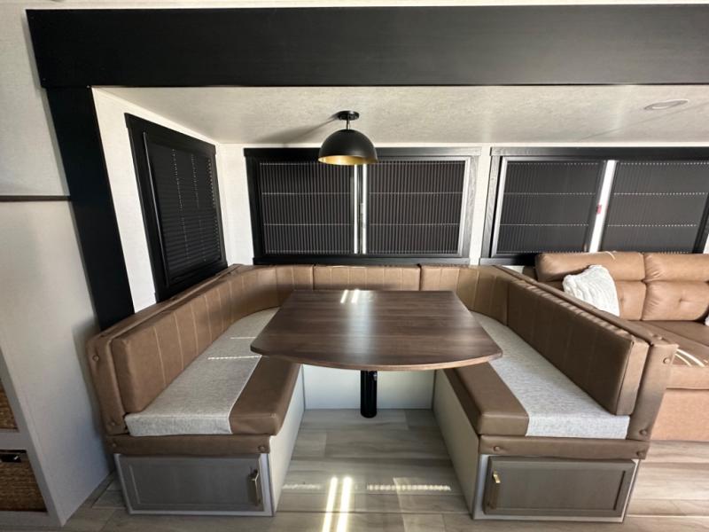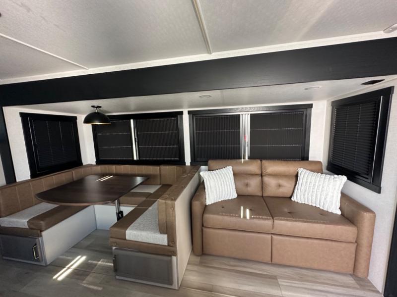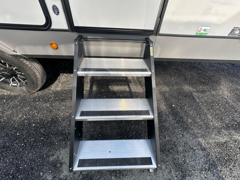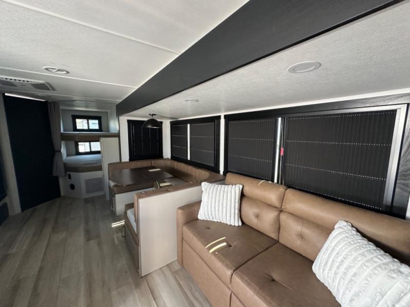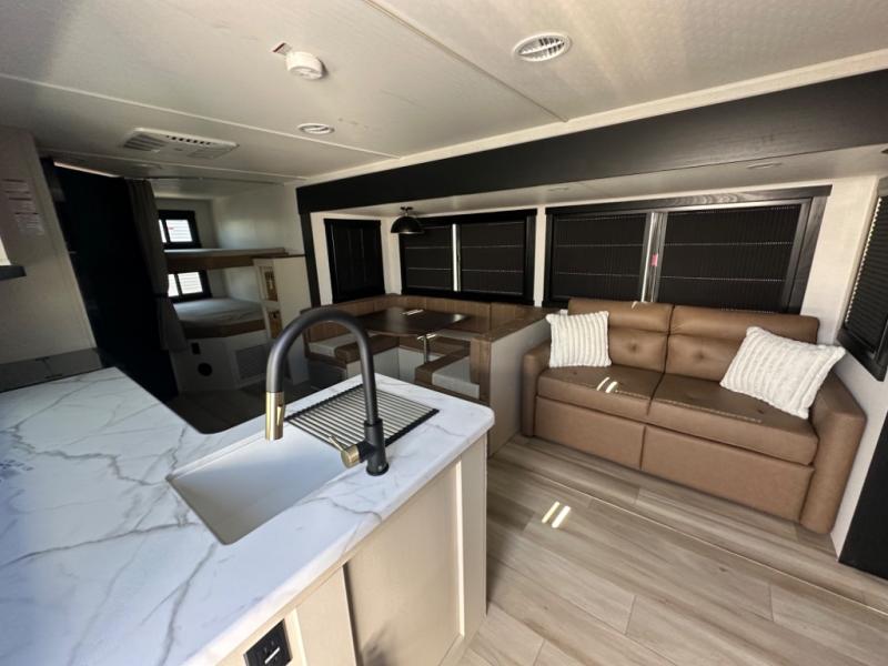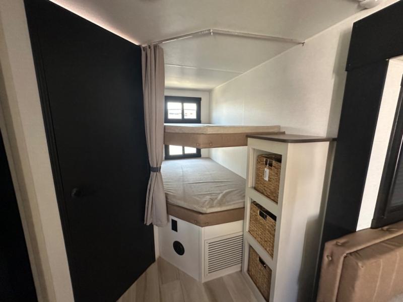 The whole gang will love camping in this bunkhouse model! Since the double-size bunks are right beside the full bath, the little ones can easily use it at night, plus you'll find the second entry door here for added convenience! The combined kitchen and living area includes a U-shaped dinette and tri-fold sofa in great view of the entertainment center with a TV and fireplace. A front private bedroom will provide you with your own space at night, and you're sure to sleep great on the queen bed with Versa Tilt. Head outdoors to enjoy the 20' awning with LED lights and the camp kitchen!