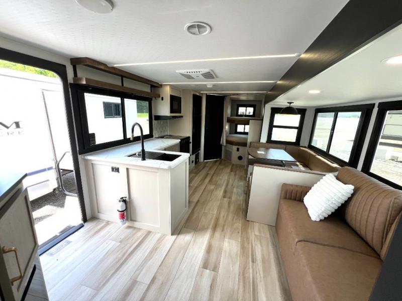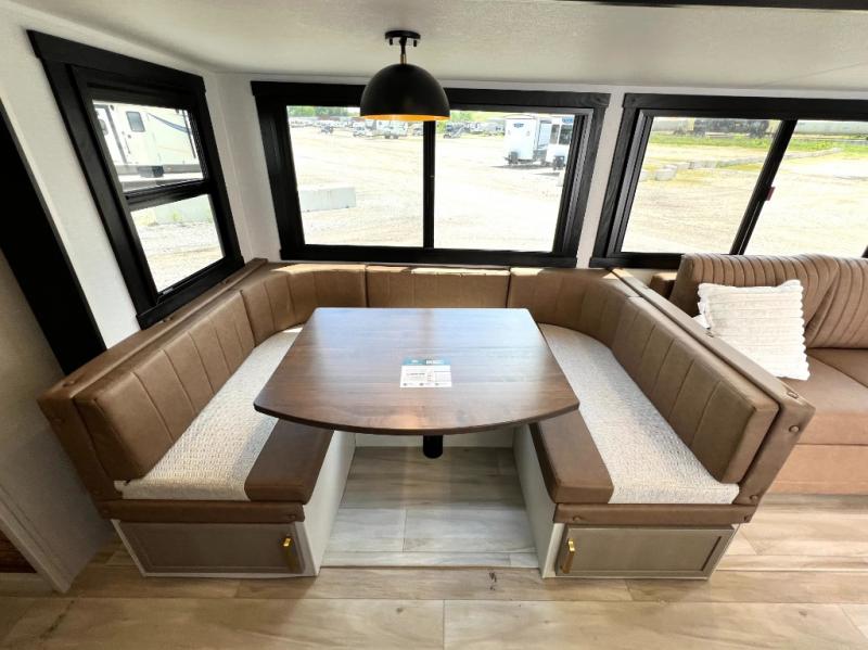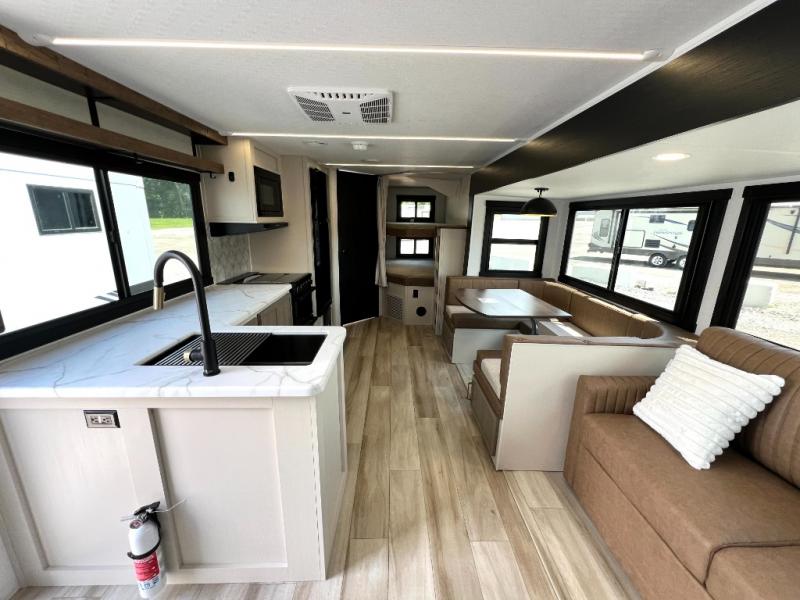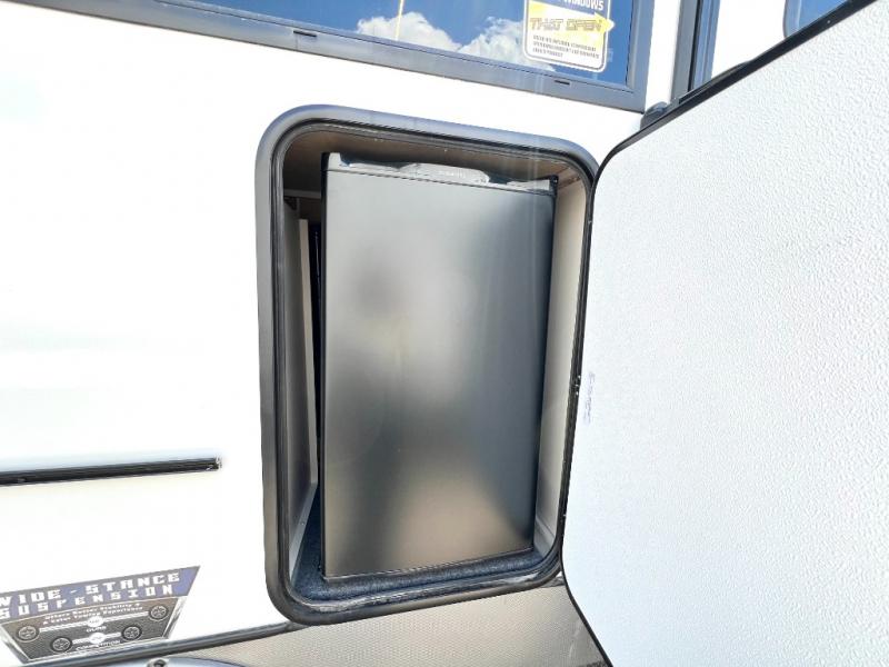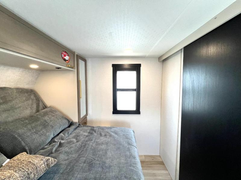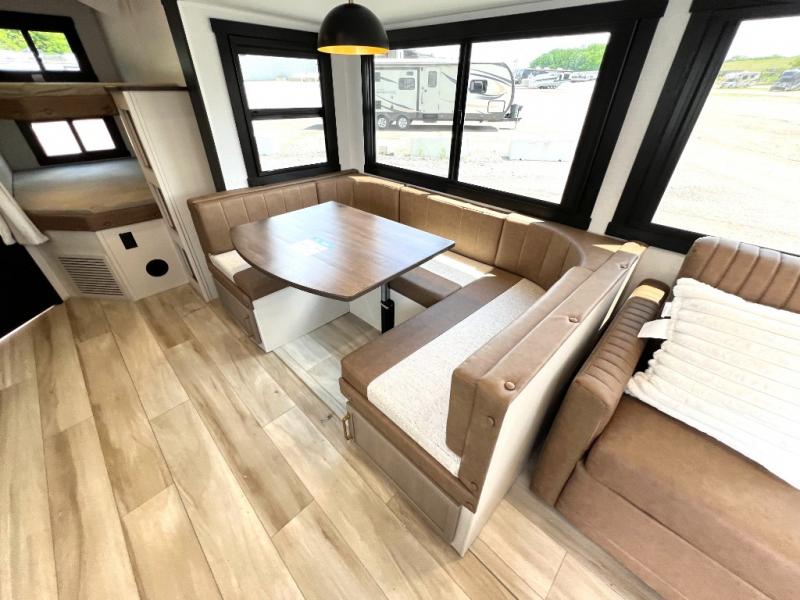 The whole gang will love camping in this bunkhouse model! Since the double-size bunks are right beside the full bath, the little ones can easily use it at night, plus you'll find the second entry door here for added convenience! The combined kitchen and living area includes a U-shaped dinette and tri-fold sofa in great view of the entertainment center with a TV and fireplace. A front private bedroom will provide you with your own space at night, and you're sure to sleep great on the queen bed with Versa Tilt. Head outdoors to enjoy the 20' awning with LED lights and the camp kitchen!