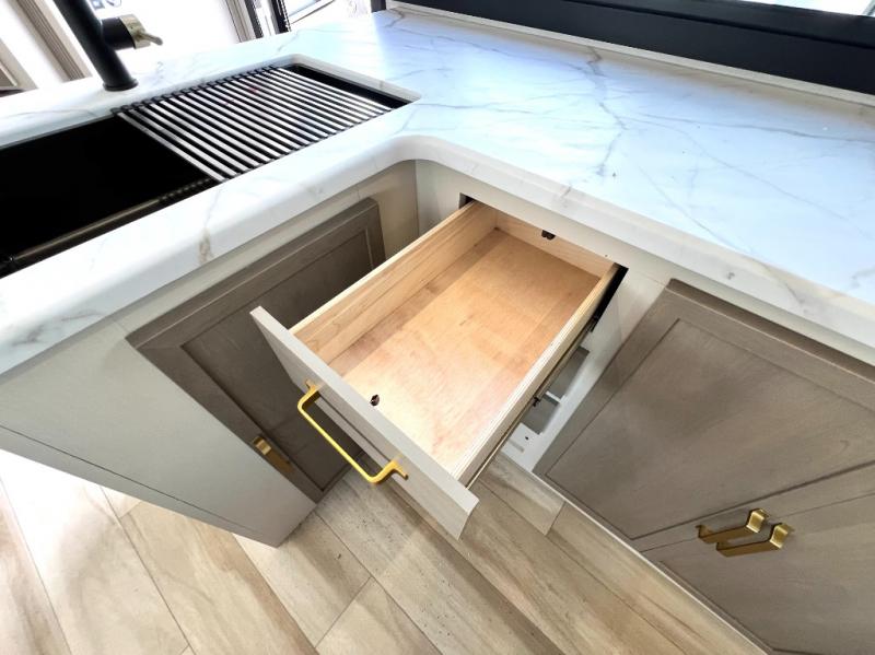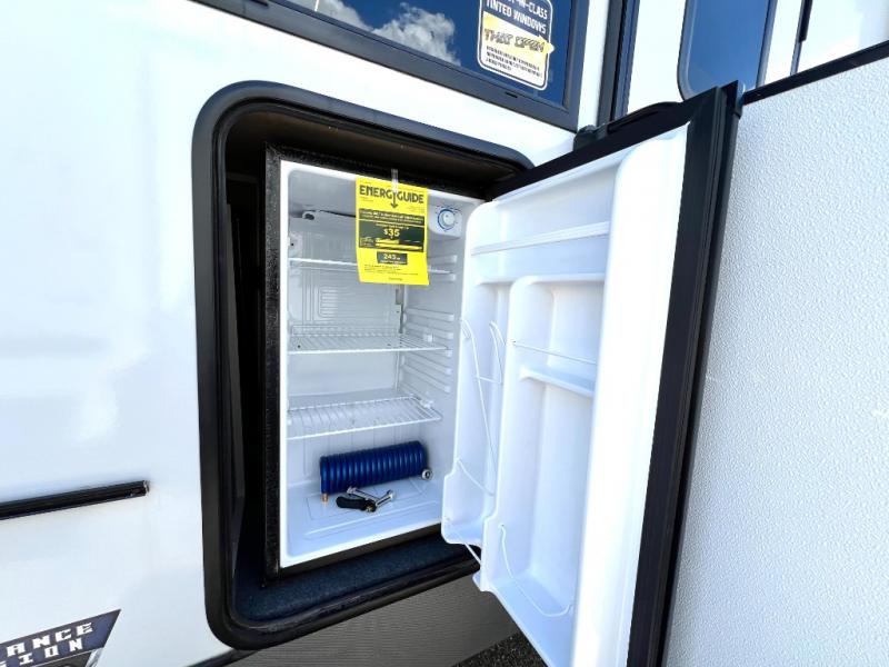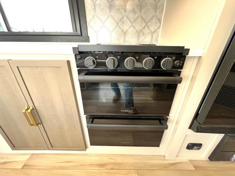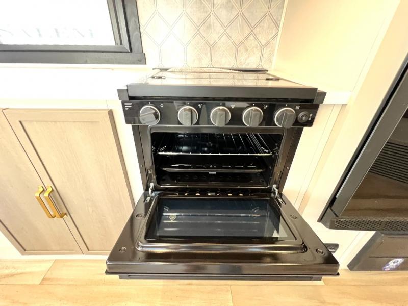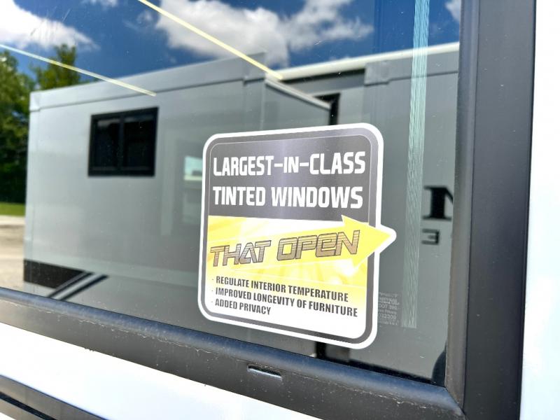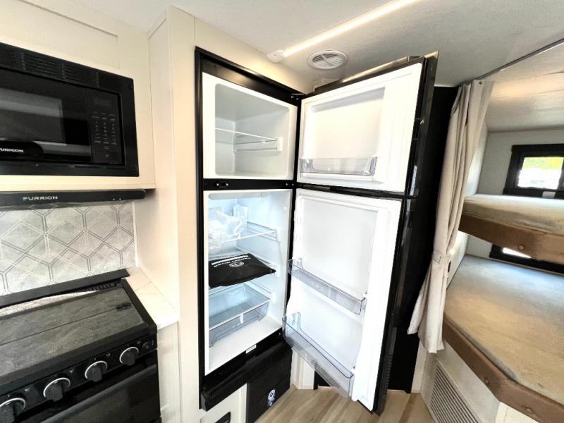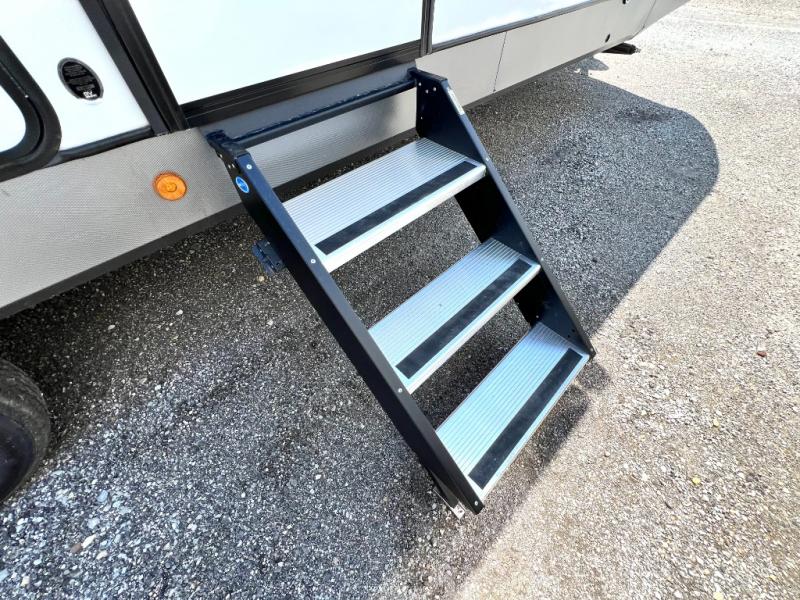 The whole gang will love camping in this bunkhouse model! Since the double-size bunks are right beside the full bath, the little ones can easily use it at night, plus you'll find the second entry door here for added convenience! The combined kitchen and living area includes a U-shaped dinette and tri-fold sofa in great view of the entertainment center with a TV and fireplace. A front private bedroom will provide you with your own space at night, and you're sure to sleep great on the queen bed with Versa Tilt. Head outdoors to enjoy the 20' awning with LED lights and the camp kitchen!