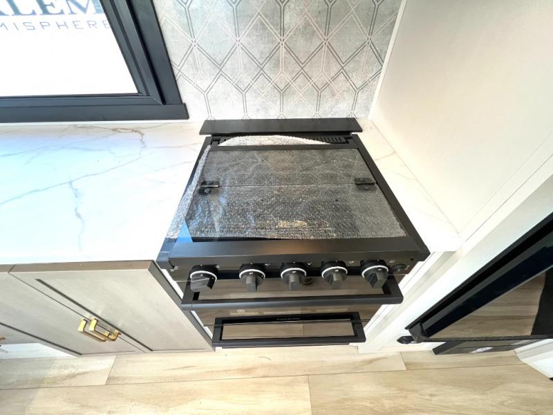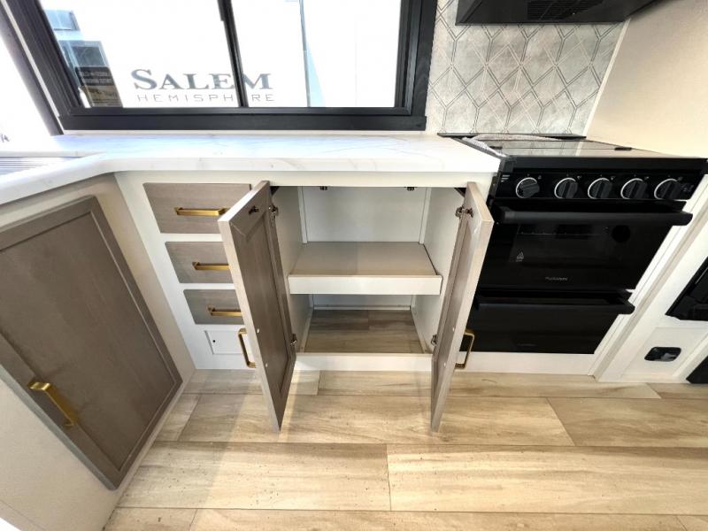 With any Salem Hemisphere Hyper-Lyte travel trailer by Forest River, you will appreciate a wide stance axle and Maxxis radial tires for smooth towing, plus laminated "Aluma Frame" sidewalls and floor for added durability. There are also square windows with built-in shades with reflecting thermal-foil backing to help keep your trailer cool during the summer. The 2" accessory hitch receiver will allow you to bring along more camp gear and the tankless water heater is a feature you won't want to camp without! Inside, you'll find Temple Cherry cabinetry, wood door casings in place of plastic, a residential single bowl undermount sink, and many more comforts. Outside, your furry friend will be happy with the shaded pet tether and security hook, and there is even an outside shower with hot and cold water to fill the dogs water bowl and wash off hiking boots!