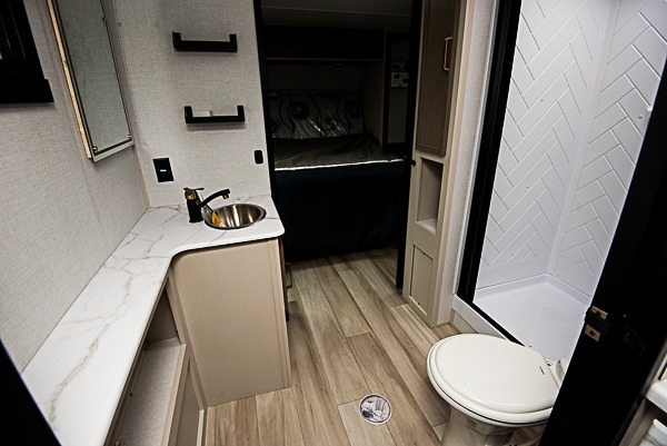 With any Salem Hemisphere Hyper-Lyte travel trailer by Forest River, you will appreciate a wide stance axle and Goodyear radial tires for smooth towing, plus vacuum bonded "Aluma Frame" sidewalls and floor for added durability. There are also square windows with built-in shades with reflecting thermal-foil backing and painted hardwood trim to help keep your trailer cool during the summer. The 2" accessory hitch receiver will allow you to bring along more camp gear and the tankless water heater is a feature you won't want to camp without! Nordic Marble countertops throughout and corresponding Frozen Nordic backsplash will give your space a more modern look, and the LED TV and Furrion soundbar will wash away rainy day blues. Outside, your furry friend will be happy with the shaded pet tether and security hook, and there is even an outside shower with hot and cold water to fill the dogs water bowl and wash off hiking boots!