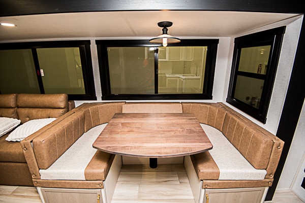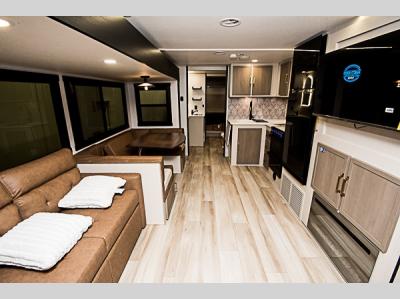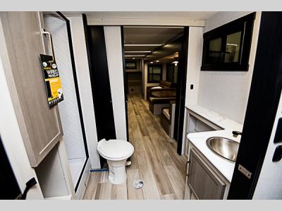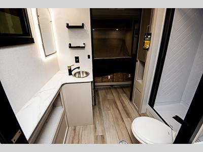 With any Salem Hemisphere Hyper-Lyte travel trailer by Forest River, you will appreciate a wide stance axle and Goodyear radial tires for smooth towing, plus vacuum bonded "Aluma Frame" sidewalls and floor for added durability. There are also square windows with built-in shades with reflecting thermal-foil backing and painted hardwood trim to help keep your trailer cool during the summer. The 2" accessory hitch receiver will allow you to bring along more camp gear and the tankless water heater is a feature you won't want to camp without! Nordic Marble countertops throughout and corresponding Frozen Nordic backsplash will give your space a more modern look, and the LED TV and Furrion soundbar will wash away rainy day blues. Outside, your furry friend will be happy with the shaded pet tether and security hook, and there is even an outside shower with hot and cold water to fill the dogs water bowl and wash off hiking boots!