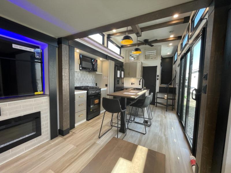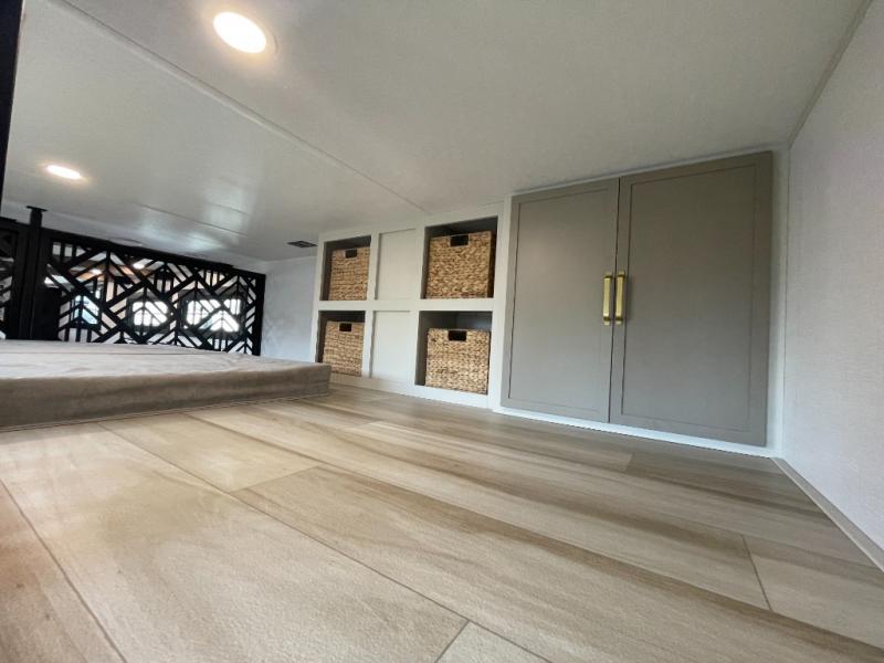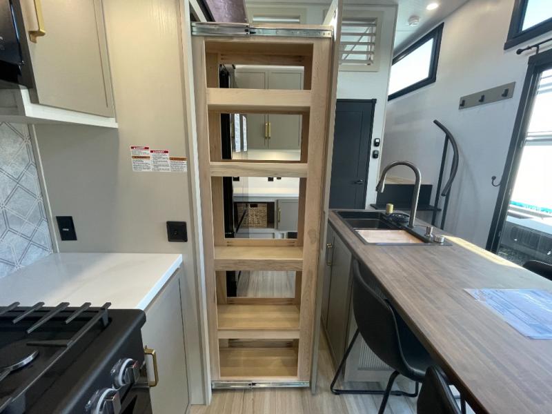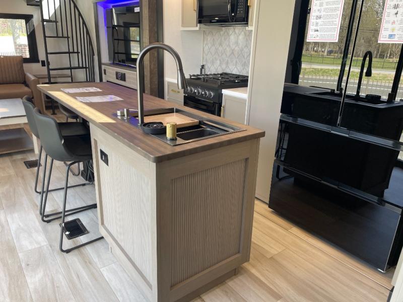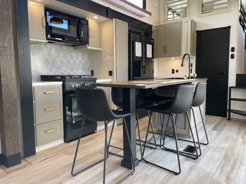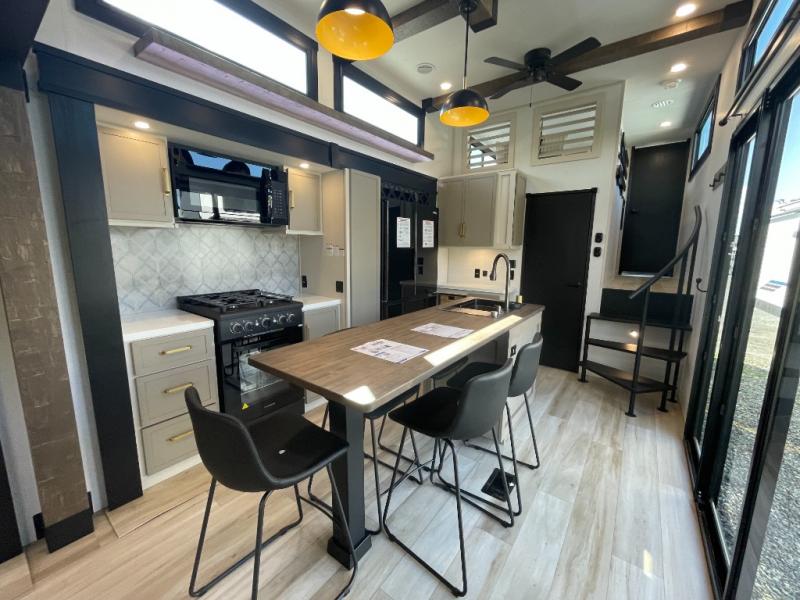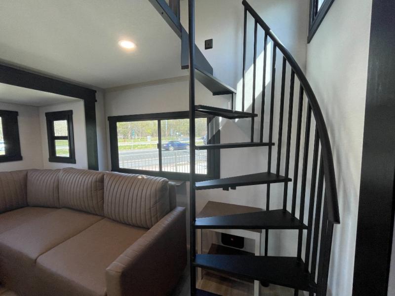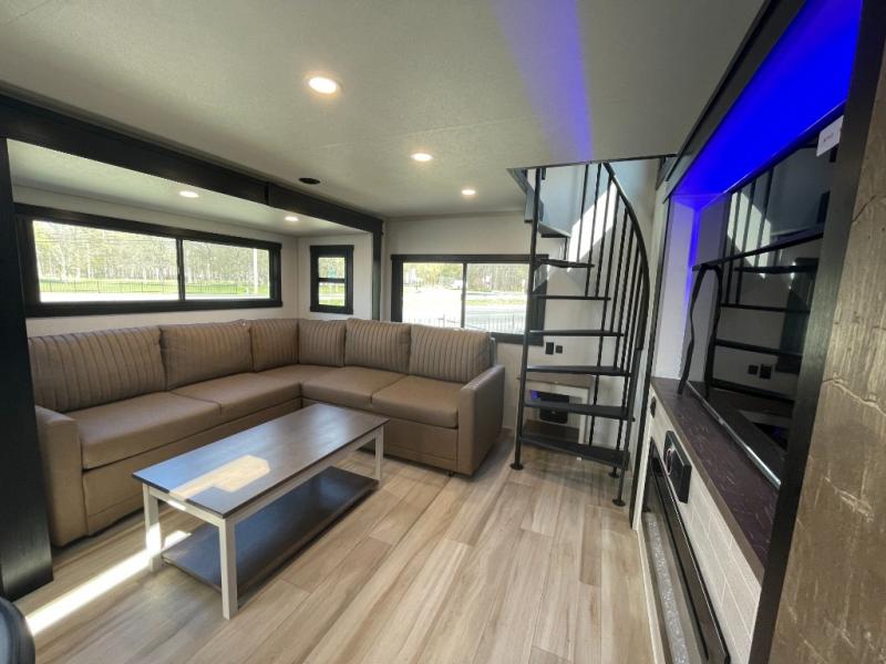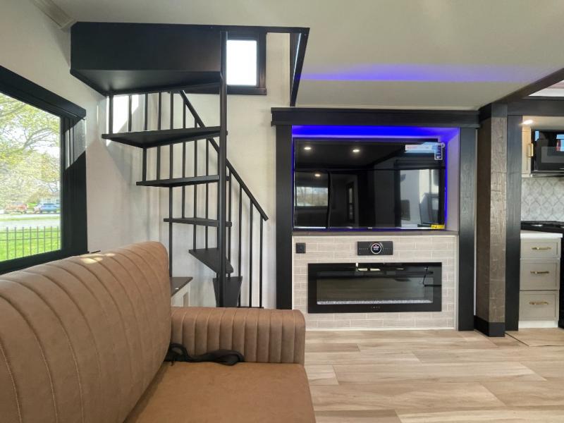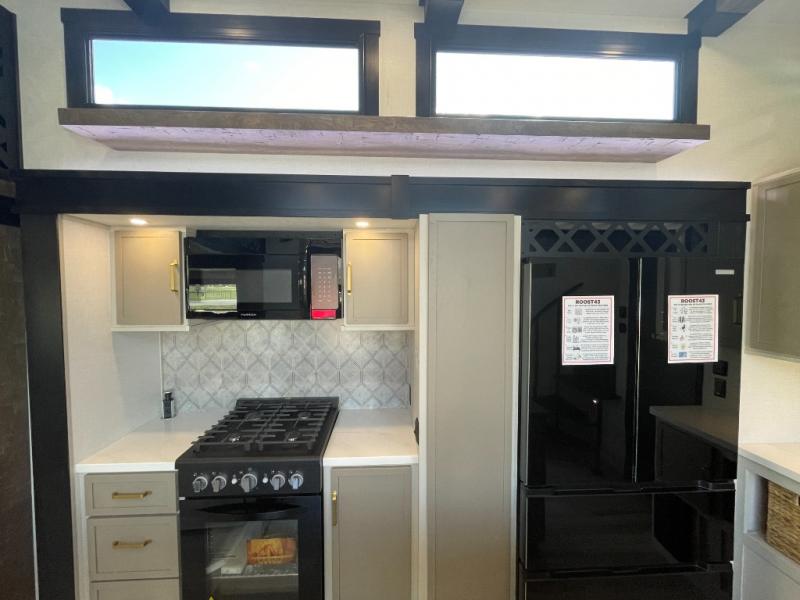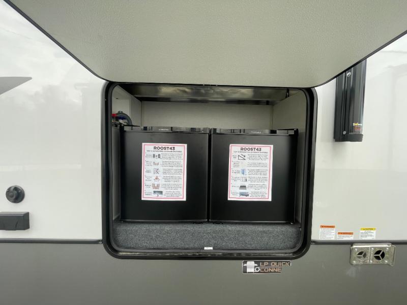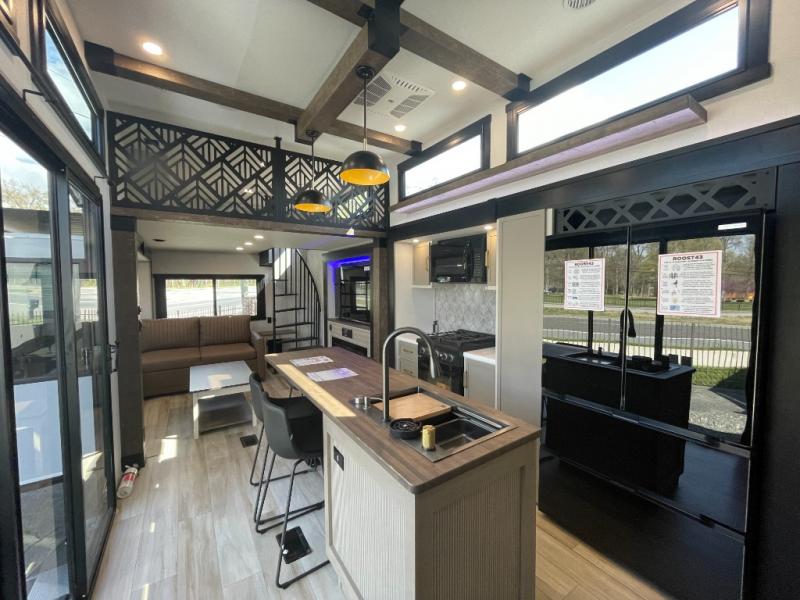 Introducing a new RV of its kind, the ROOST43 is a destination-style fifth wheel you are sure to love! There are two levels, making it feel more like home, and you can sleep six to eight each night. The master bedroom includes a custom king bed slide out, a 32" TV and fireplace, a desk/vanity, plus a half bath for convenience. A custom king-size bed is also found in the front loft, and there are storage cubbies plus a coax/110V outlet here to plug in chargers or a laptop. The second loft in the back includes spiral stairs, two bunk mats, a wardrobe, and cubby cubes here also for your guests' things. Some of the stand-out features you'll find on the first level are the sectional sofa with a coffee table, an entertainment center with a 65" TV, a kitchen island with five chairs, and a fully-equipped kitchen. The 20 cu. ft. 12V refrigerator and pull-out pantry will let you stock up on food, and the kitchen hutch will be perfect for nice dishes. The full bath on this model is one to remember; there is a one-piece fiberglass shower with a teak seat, a flip-up shelf and a washer/dryer, a backlit mirror, and more. And we haven't even touched on the exterior features, such as the pull-out tray, outdoor refrigerators, 20' awning, and more!