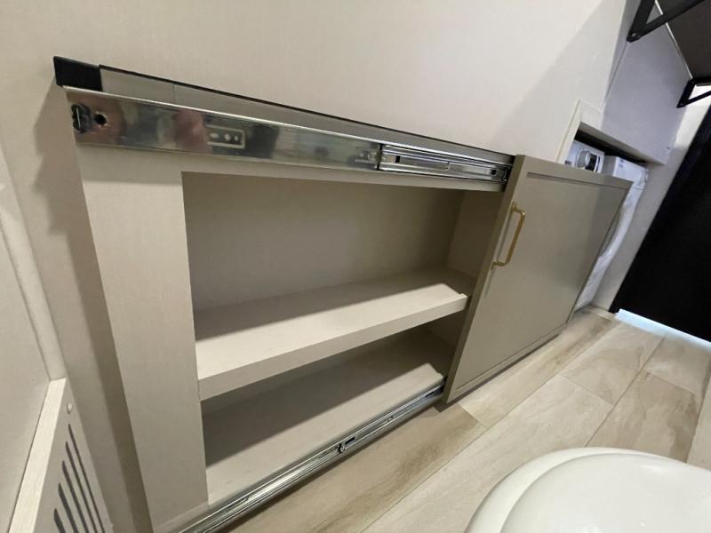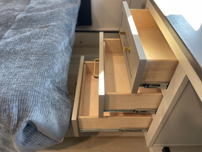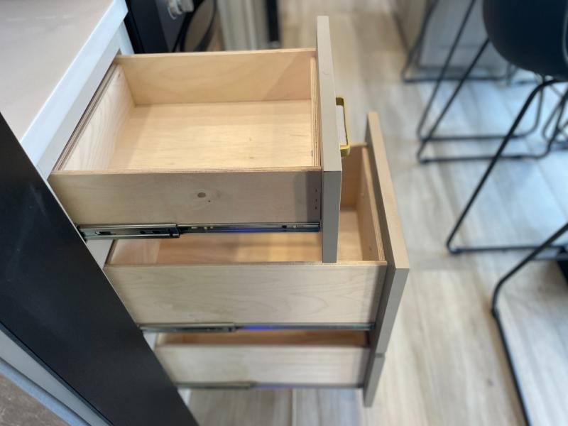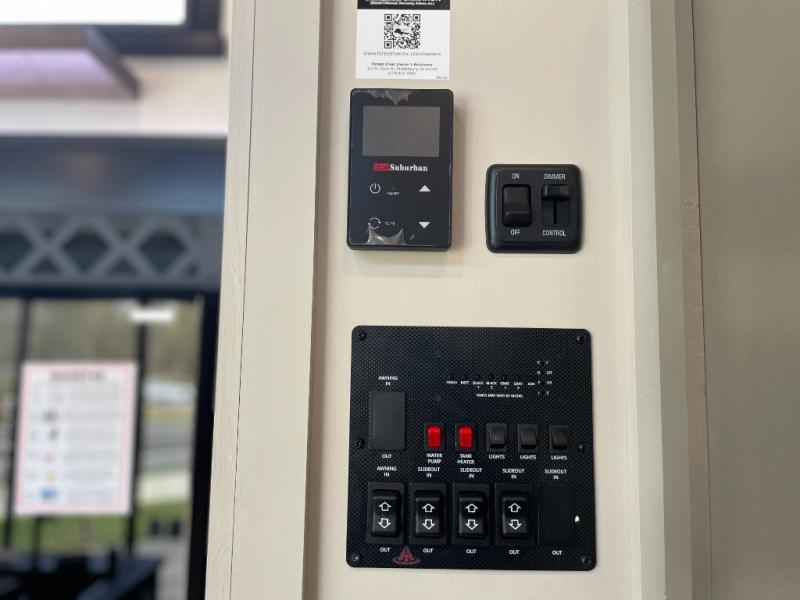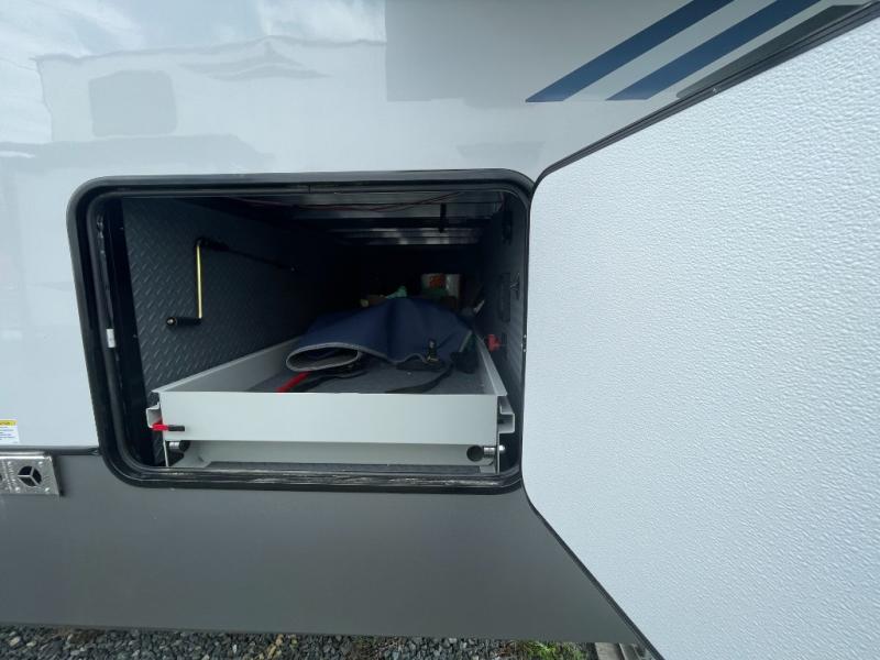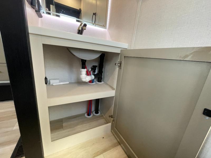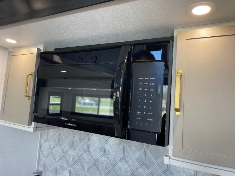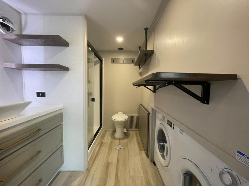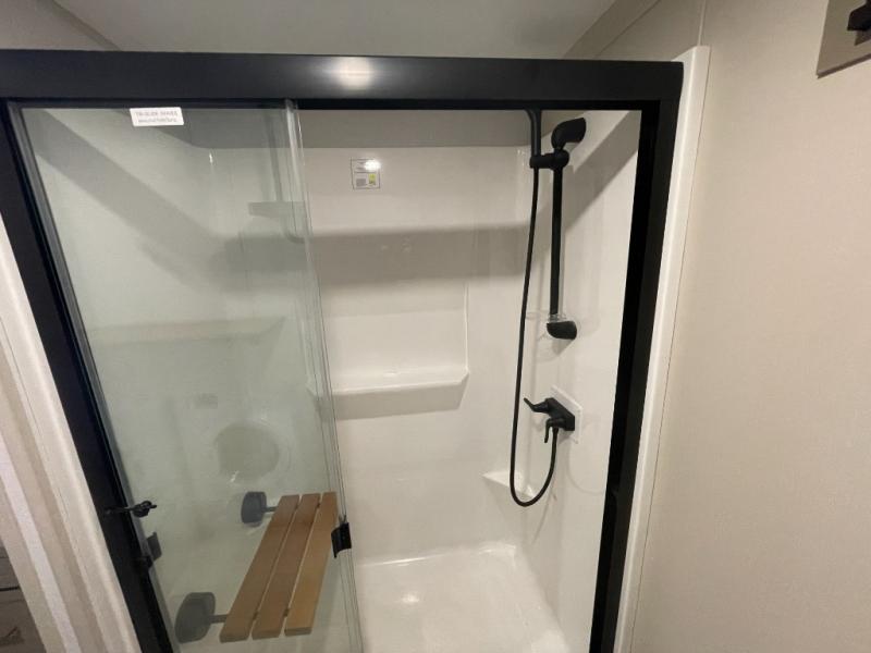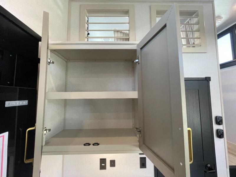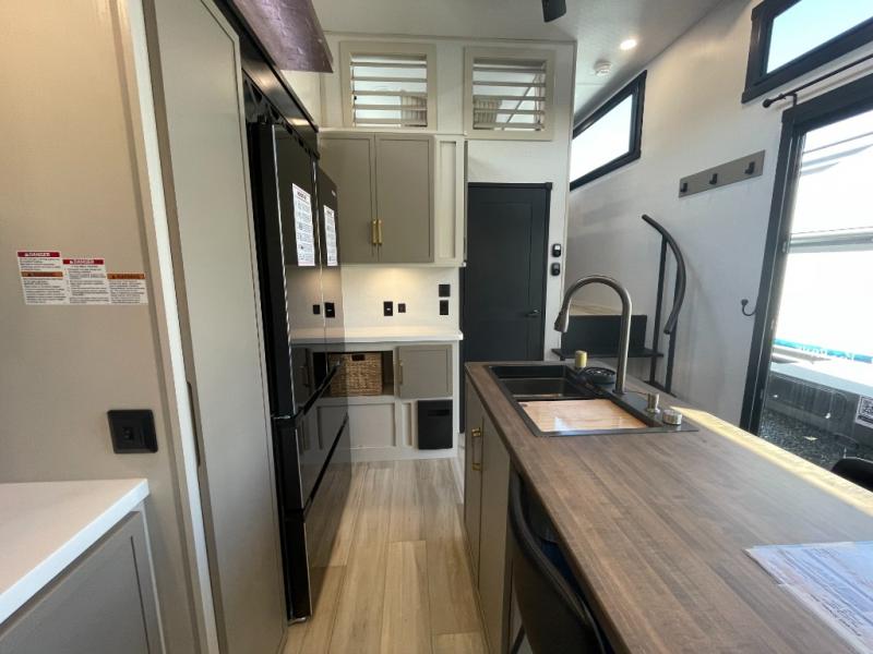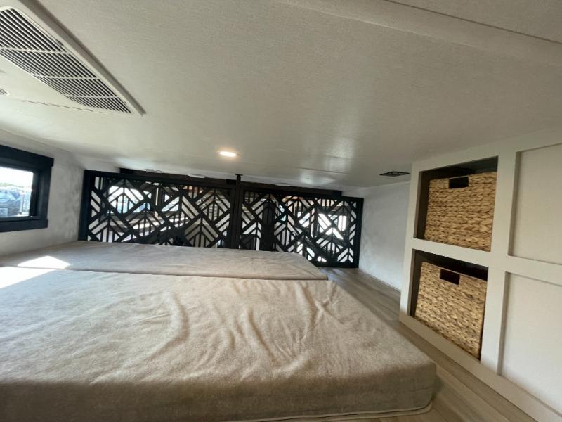 Introducing a new RV of its kind, the ROOST43 is a destination-style fifth wheel you are sure to love! There are two levels, making it feel more like home, and you can sleep six to eight each night. The master bedroom includes a custom king bed slide out, a 32" TV and fireplace, a desk/vanity, plus a half bath for convenience. A custom king-size bed is also found in the front loft, and there are storage cubbies plus a coax/110V outlet here to plug in chargers or a laptop. The second loft in the back includes spiral stairs, two bunk mats, a wardrobe, and cubby cubes here also for your guests' things. Some of the stand-out features you'll find on the first level are the sectional sofa with a coffee table, an entertainment center with a 65" TV, a kitchen island with five chairs, and a fully-equipped kitchen. The 20 cu. ft. 12V refrigerator and pull-out pantry will let you stock up on food, and the kitchen hutch will be perfect for nice dishes. The full bath on this model is one to remember; there is a one-piece fiberglass shower with a teak seat, a flip-up shelf and a washer/dryer, a backlit mirror, and more. And we haven't even touched on the exterior features, such as the pull-out tray, outdoor refrigerators, 20' awning, and more!