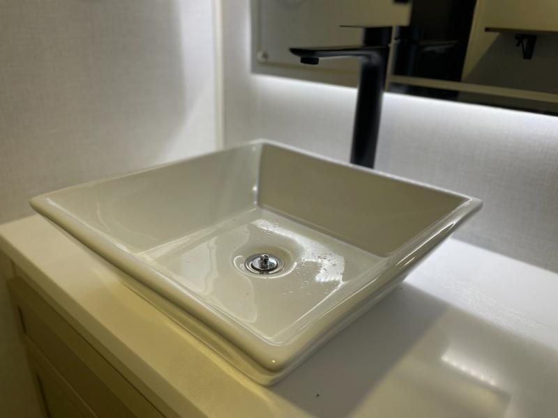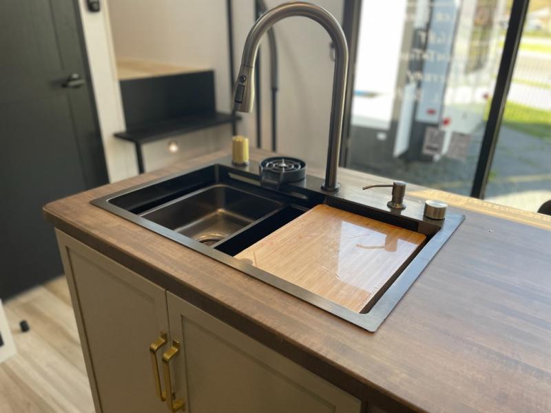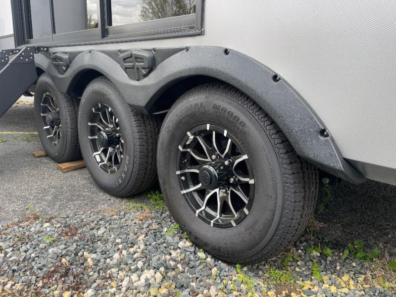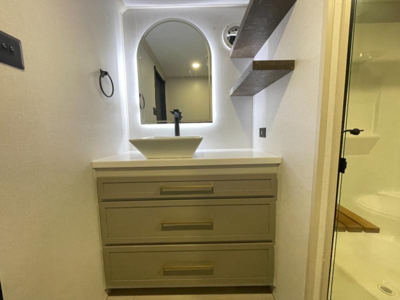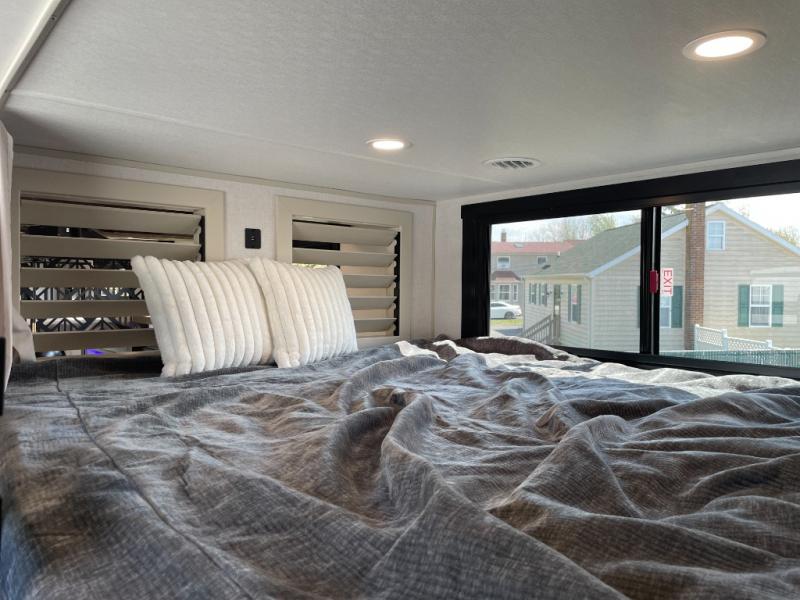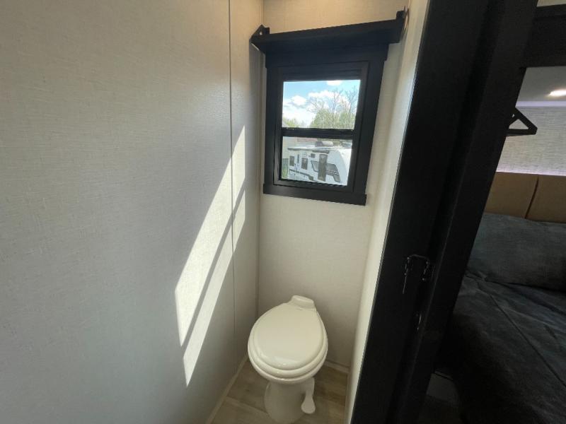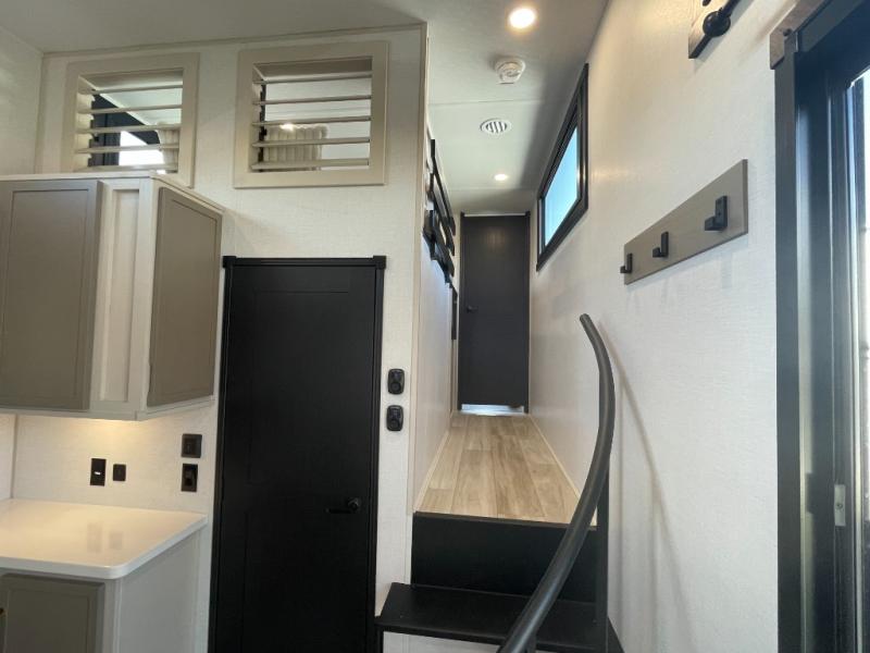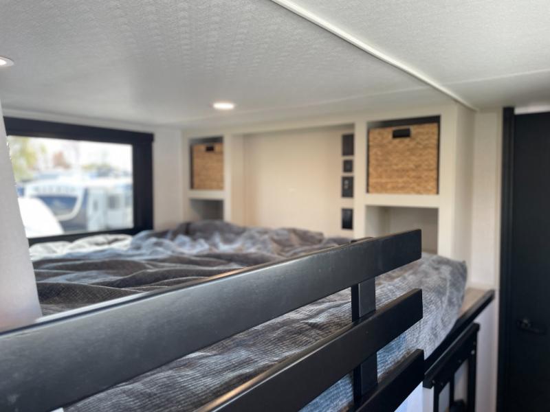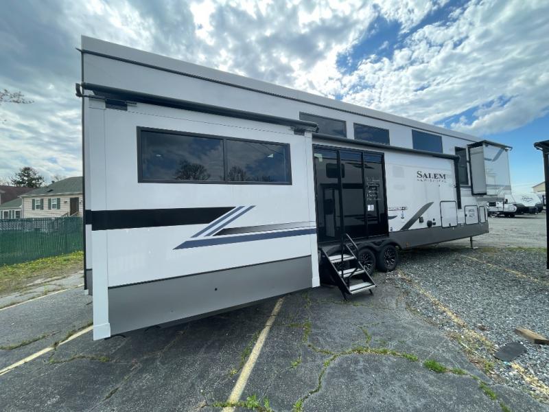 The Salem Hemisphere ROOST fifth wheels resemble a destination trailer that will be giving you residential vibes! The premium Alley Grey high-gloss gel coat fiberglass sidewalls are ultra sleek, and the flat pitched roof sheds water to the off-door side for added comfort. A Race Track A/C duct system provides maximum cooling, and the AccessiBelly underbelly with 12V tank heaters on all holding tanks will help extend your camping season. There are high-end solid surface and maple-stained wood countertops inside, along with residential-inspired wood door casings, and 6' 8" clearance in all rooms, excluding lofts. Additional features include a Gun Metal grey kitchen sink, backlit mirrors in the bathrooms, motion sensor lights by the spiral stair cases, and back up camera prep if you want the option to make parking easier than ever.