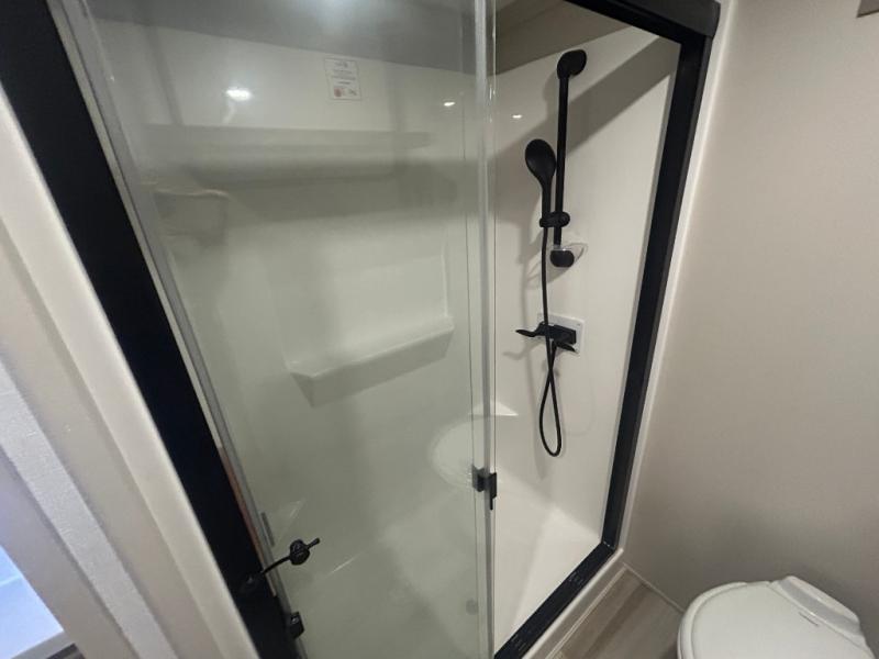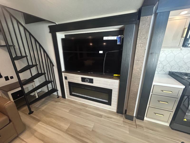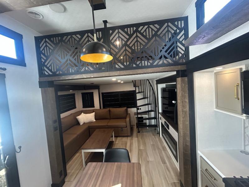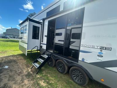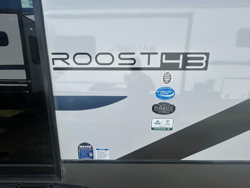 Introducing a new RV of its kind, the ROOST43 is a destination-style fifth wheel you are sure to love! There are two levels, making it feel more like home, and you can sleep six to eight each night. The master bedroom includes a custom king bed slide out, a 32" TV and fireplace, a desk/vanity, plus a half bath for convenience. A custom king-size bed is also found in the front loft, and there are storage cubbies plus a coax/110V outlet here to plug in chargers or a laptop. The second loft in the back includes spiral stairs, two bunk mats, a wardrobe, and cubby cubes here also for your guests' things. Some of the stand-out features you'll find on the first level are the sectional sofa with a coffee table, an entertainment center with a 65" TV, a kitchen island with five chairs, and a fully-equipped kitchen. The 20 cu. ft. 12V refrigerator and pull-out pantry will let you stock up on food, and the kitchen hutch will be perfect for nice dishes. The full bath on this model is one to remember; there is a one-piece fiberglass shower with a teak seat, a flip-up shelf and a washer/dryer, a backlit mirror, and more. And we haven't even touched on the exterior features, such as the pull-out tray, outdoor refrigerators, 20' awning, and more!