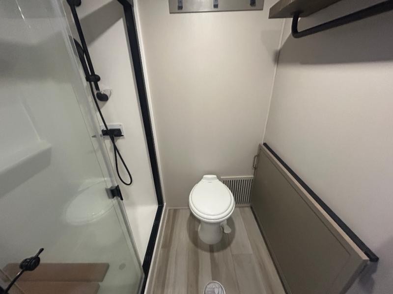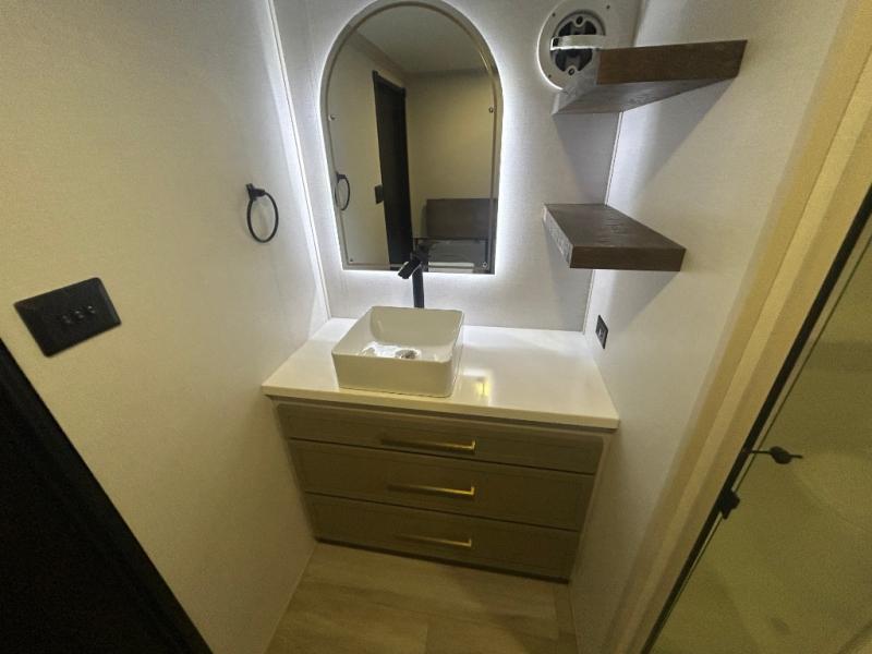 The Salem Hemisphere ROOST fifth wheels resemble a destination trailer that will be giving you residential vibes! The premium Alley Grey high-gloss gel coat fiberglass sidewalls are ultra sleek, and the flat pitched roof sheds water to the off-door side for added comfort. A Race Track A/C duct system provides maximum cooling, and the AccessiBelly underbelly with 12V tank heaters on all holding tanks will help extend your camping season. There are high-end solid surface and maple-stained wood countertops inside, along with residential-inspired wood door casings, and 6' 8" clearance in all rooms, excluding lofts. Additional features include a Gun Metal grey kitchen sink, backlit mirrors in the bathrooms, motion sensor lights by the spiral stair cases, and back up camera prep if you want the option to make parking easier than ever.