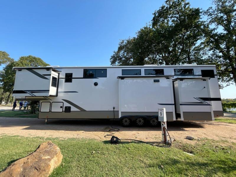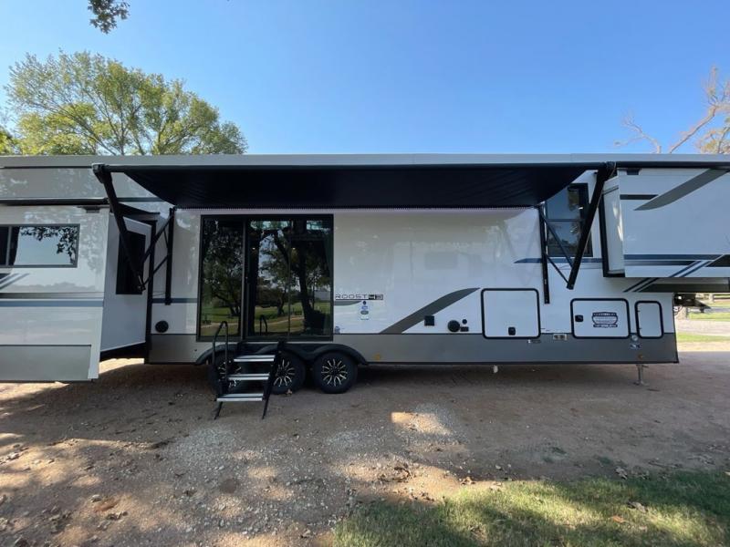 Introducing a new RV of its kind, the ROOST43 is a destination-style fifth wheel you are sure to love! There are two levels, making it feel more like home, and you can sleep six to eight each night. The master bedroom includes a custom king bed slide out, a 32" TV and fireplace, a desk/vanity, plus a half bath for convenience. A custom king-size bed is also found in the front loft, and there are storage cubbies plus a coax/110V outlet here to plug in chargers or a laptop. The second loft in the back includes spiral stairs, two bunk mats, a wardrobe, and cubby cubes here also for your guests' things. Some of the stand-out features you'll find on the first level are the sectional sofa with a coffee table, an entertainment center with a 65" TV, a kitchen island with five chairs, and a fully-equipped kitchen. The 20 cu. ft. 12V refrigerator and pull-out pantry will let you stock up on food, and the kitchen hutch will be perfect for nice dishes. The full bath on this model is one to remember; there is a one-piece fiberglass shower with a teak seat, a flip-up shelf and a washer/dryer, a backlit mirror, and more. And we haven't even touched on the exterior features, such as the pull-out tray, outdoor refrigerators, 20' awning, and more!