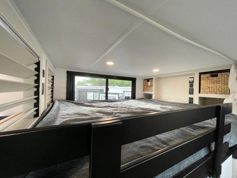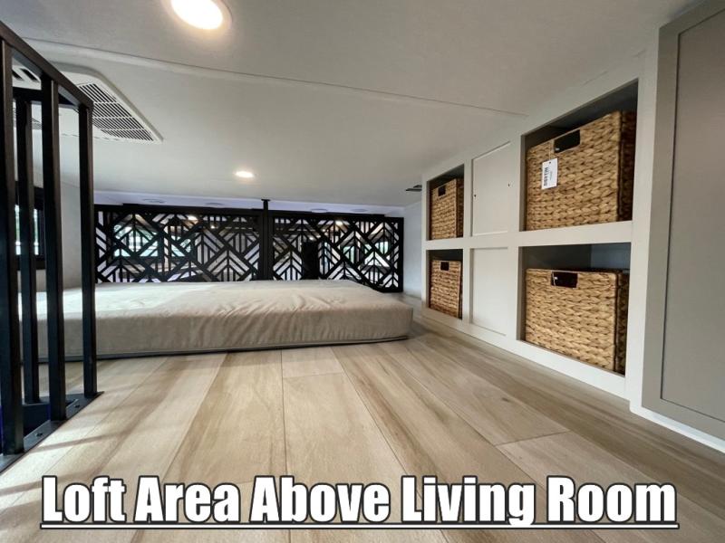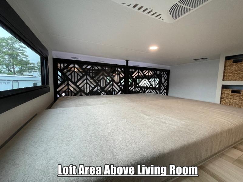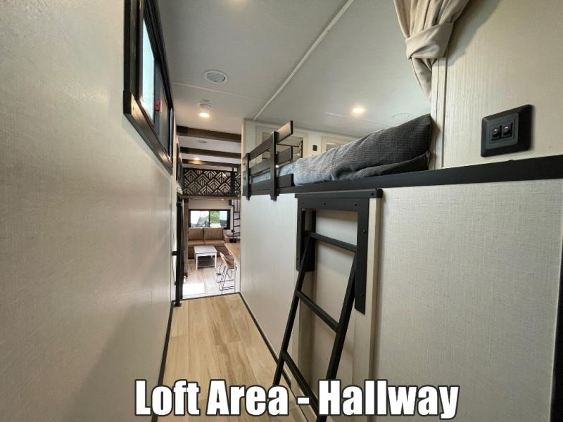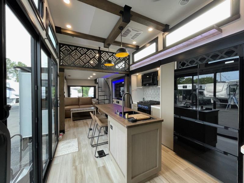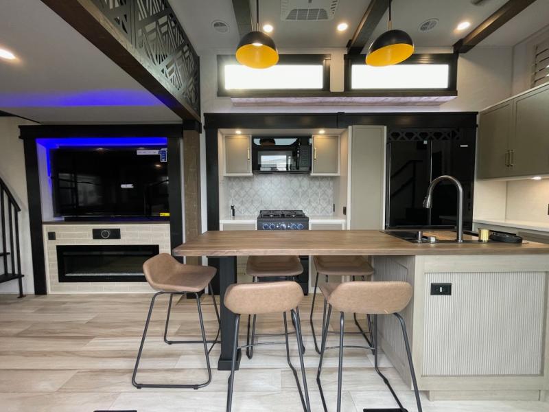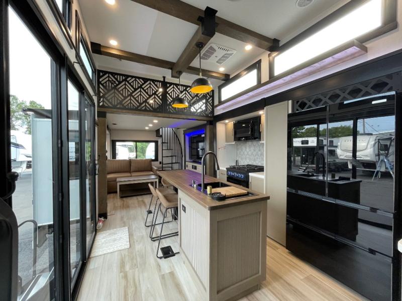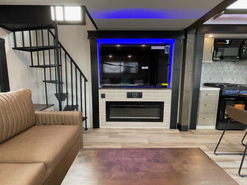 Introducing a new RV of its kind, the ROOST43 is a destination-style fifth wheel you are sure to love! There are two levels, making it feel more like home, and you can sleep six to eight each night. The master bedroom includes a custom king bed slide out, a 32" TV and fireplace, a desk/vanity, plus a half bath for convenience. A custom king-size bed is also found in the front loft, and there are storage cubbies plus a coax/110V outlet here to plug in chargers or a laptop. The second loft in the back includes spiral stairs, two bunk mats, a wardrobe, and cubby cubes here also for your guests' things. Some of the stand-out features you'll find on the first level are the sectional sofa with a coffee table, an entertainment center with a 65" TV, a kitchen island with five chairs, and a fully-equipped kitchen. The 20 cu. ft. 12V refrigerator and pull-out pantry will let you stock up on food, and the kitchen hutch will be perfect for nice dishes. The full bath on this model is one to remember; there is a one-piece fiberglass shower with a teak seat, a flip-up shelf and a washer/dryer, a backlit mirror, and more. And we haven't even touched on the exterior features, such as the pull-out tray, outdoor refrigerators, 20' awning, and more!
