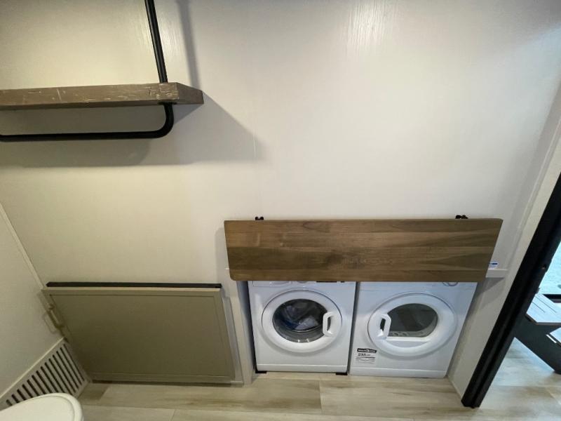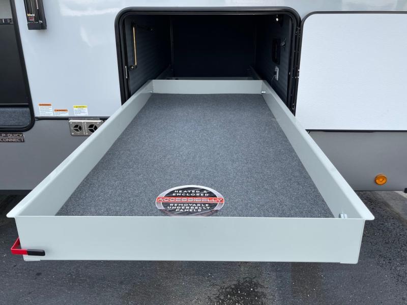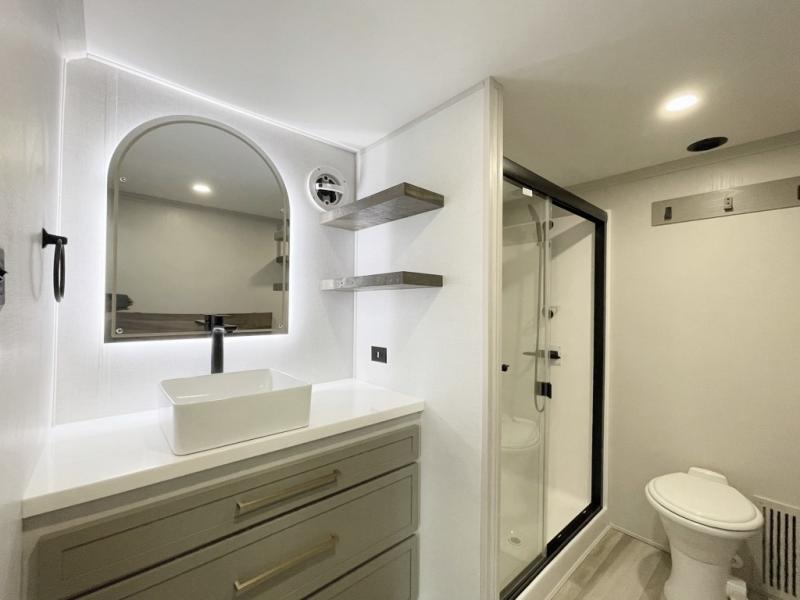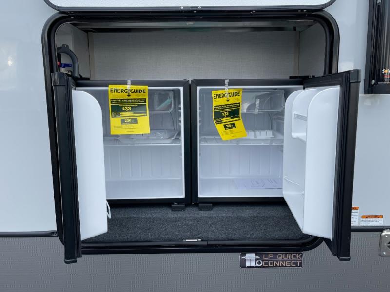 The Salem Hemisphere ROOST fifth wheels resemble a destination trailer that will be giving you residential vibes! The premium Alley Grey high-gloss gel coat fiberglass sidewalls are ultra sleek, and the flat pitched roof sheds water to the off-door side for added comfort. A Race Track A/C duct system provides maximum cooling, and the AccessiBelly underbelly with 12V tank heaters on all holding tanks will help extend your camping season. There are high-end solid surface and maple-stained wood countertops inside, along with residential-inspired wood door casings, and 6' 8" clearance in all rooms, excluding lofts. Additional features include a Gun Metal grey kitchen sink, backlit mirrors in the bathrooms, motion sensor lights by the spiral stair cases, and back up camera prep if you want the option to make parking easier than ever.