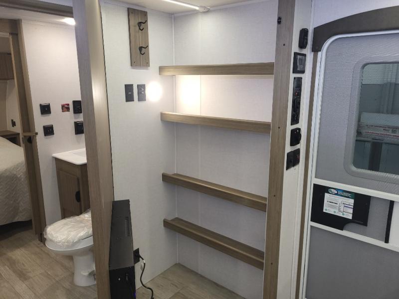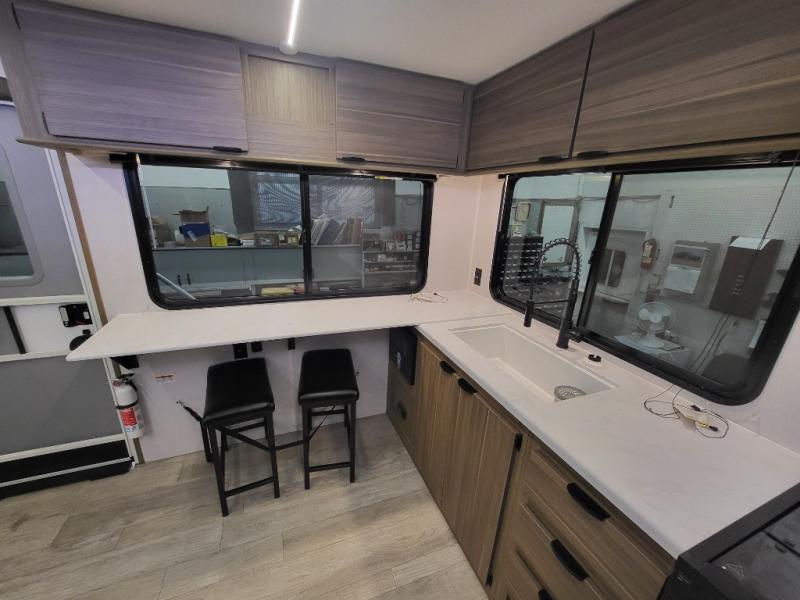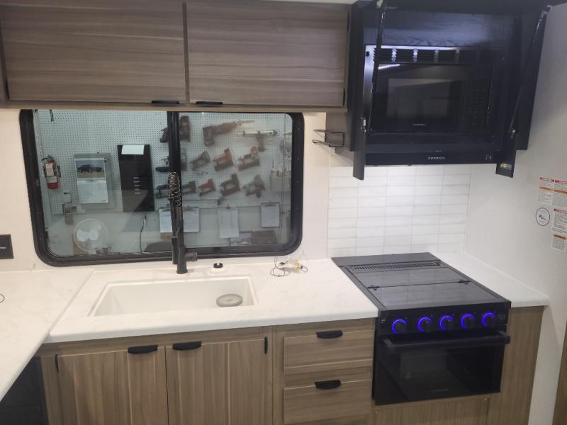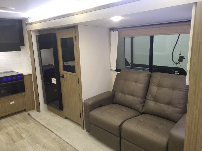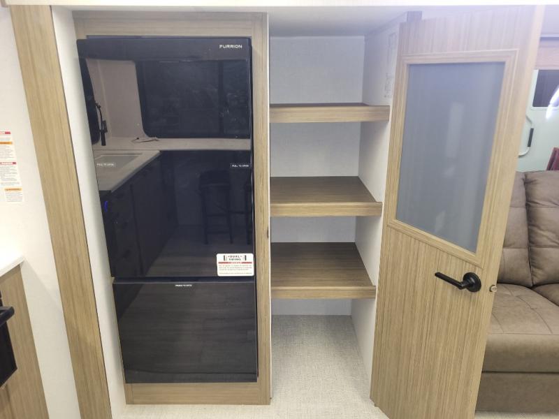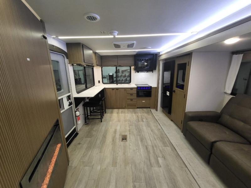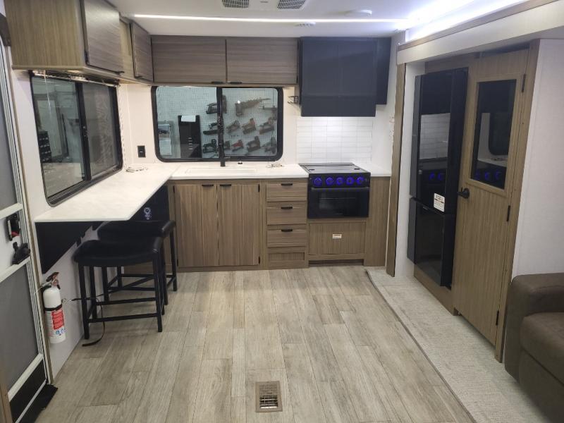 You're going to love cooking in the rear kitchen of this travel trailer! It has everything you need to prepare delicious home cooked meals including a large pantry and oversized fridge, plus there are two bar stools to sit on while you enjoy them. The theater seating is conveniently across from the swiveling entertainment center which has hidden shelves behind it for your games and movies. As you walk-through the bathroom, you will notice a walk-in shower to the left and a toilet and sink to the right. It leads directly into the front private bedroom which has a Versa-Tilt custom king bed to lay your head on at night and wardrobes/nightstands on either side for your items!