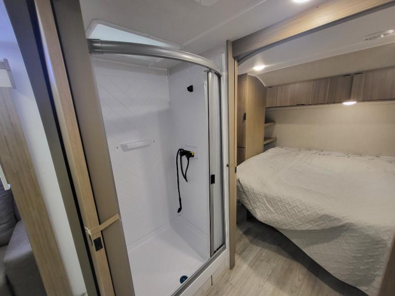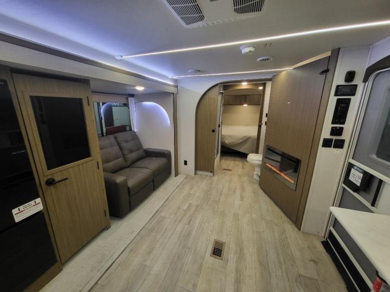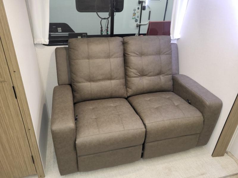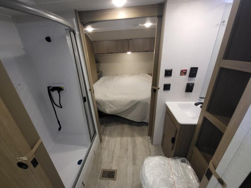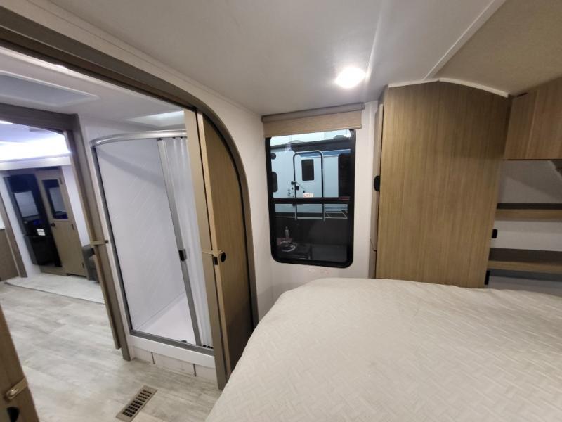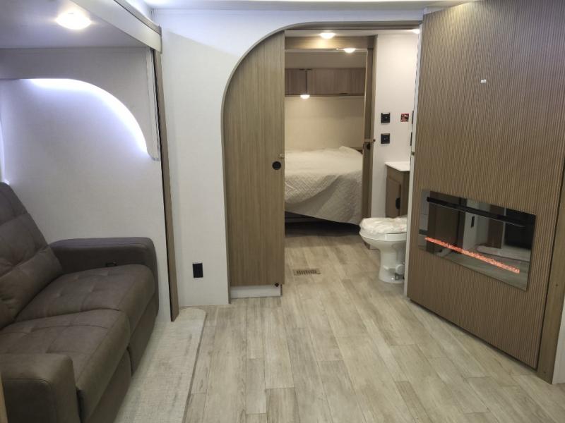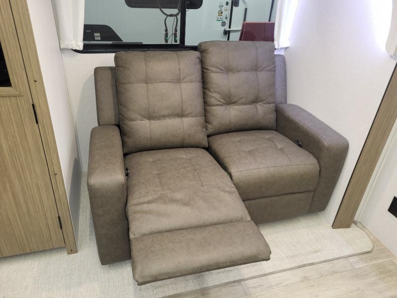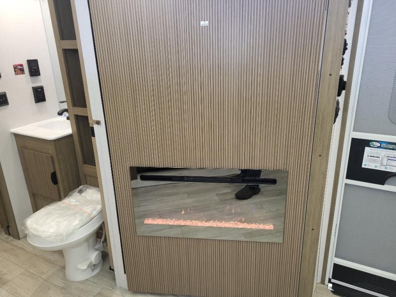 You're going to love cooking in the rear kitchen of this travel trailer! It has everything you need to prepare delicious home cooked meals including a large pantry and oversized fridge, plus there are two bar stools to sit on while you enjoy them. The theater seating is conveniently across from the swiveling entertainment center which has hidden shelves behind it for your games and movies. As you walk-through the bathroom, you will notice a walk-in shower to the left and a toilet and sink to the right. It leads directly into the front private bedroom which has a Versa-Tilt custom king bed to lay your head on at night and wardrobes/nightstands on either side for your items!