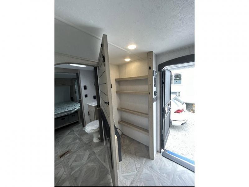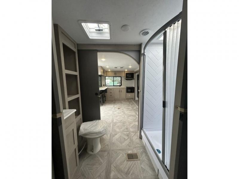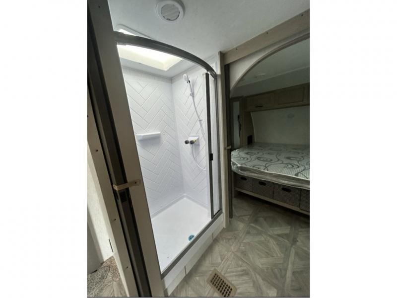 The walk-through bathroom offers a split layout with a walk-in shower on one side and a toilet and sink on the other, leading to a private front bedroom. Here, you'll find a comfortable Versa-Tilt king bed, dual wardrobes, and nightstands to keep your essentials within reach.