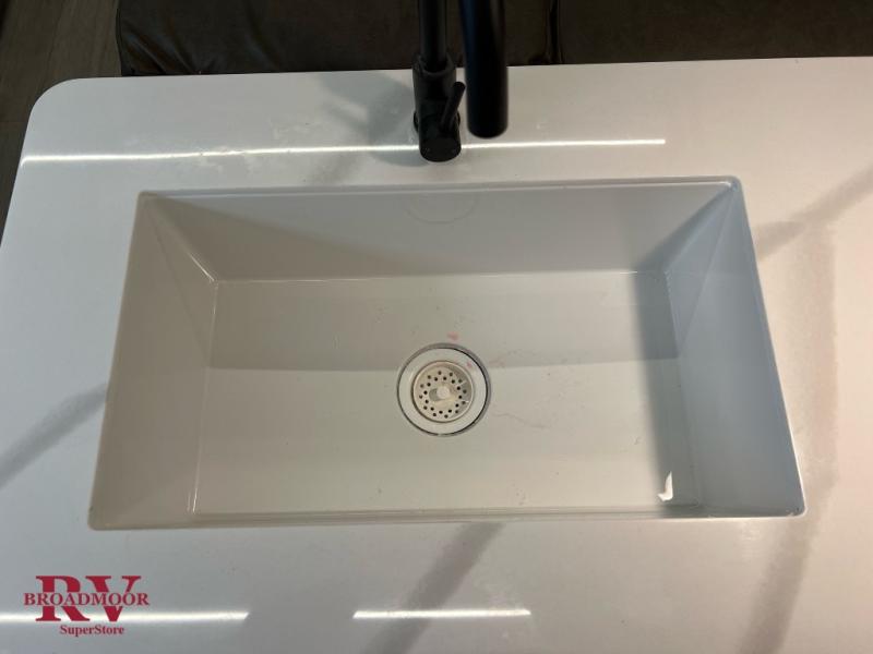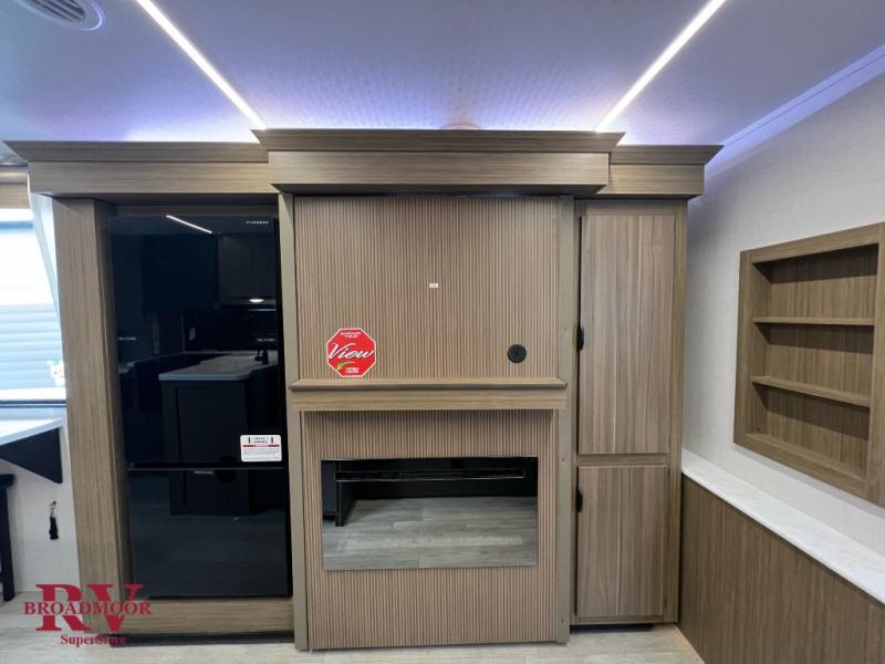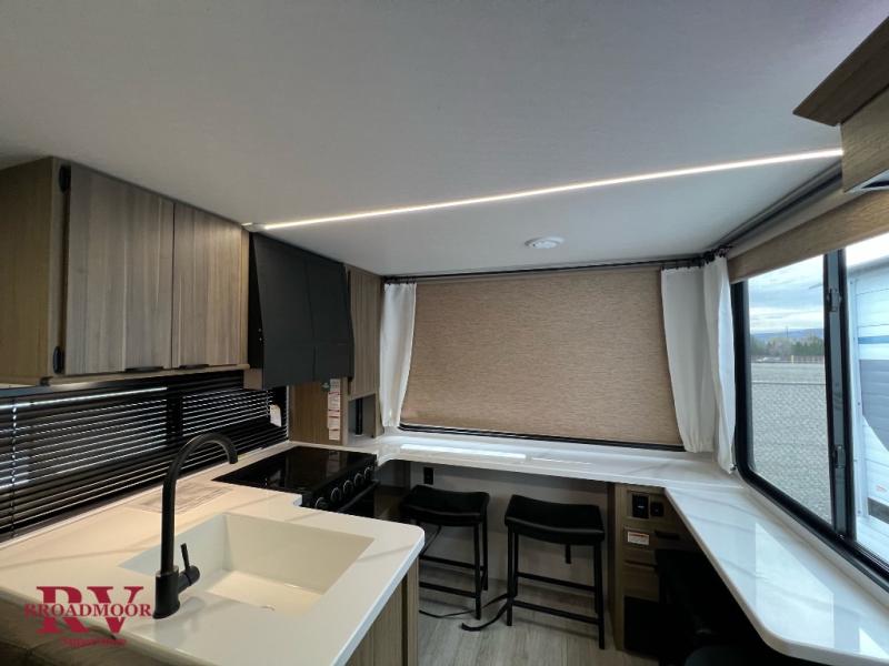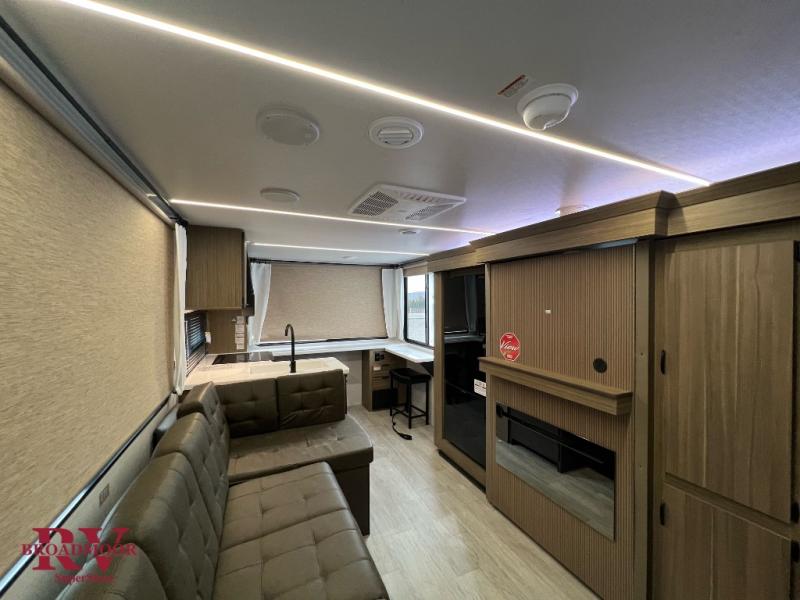 Camping trips in this spacious travel trailer are sure to leave memories. You will love the amount of counter space you have in the rear kitchen since there is wrap-around counter space with a flip-up table and two stools. The main living area will be a favorite place to visit, especially with its L-shaped sofa plus swiveling entertainment center with a fireplace. Behind the TV, you'll find a hinged mattress with a mattress below, storage cubbies, and a desk, making this hidden bunkhouse perfect for guests or an office. A spacious full bath with a radius shower will let you clean up each day, and a Versa-Tilt custom king bed in the front bedroom is sure to bring a great night's rest. There are also dual bedroom wardrobes to keep your clothes wrinkle-free!
