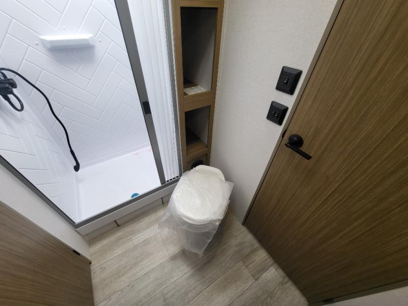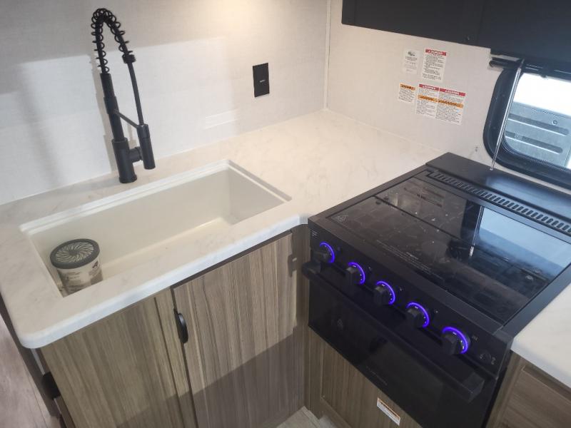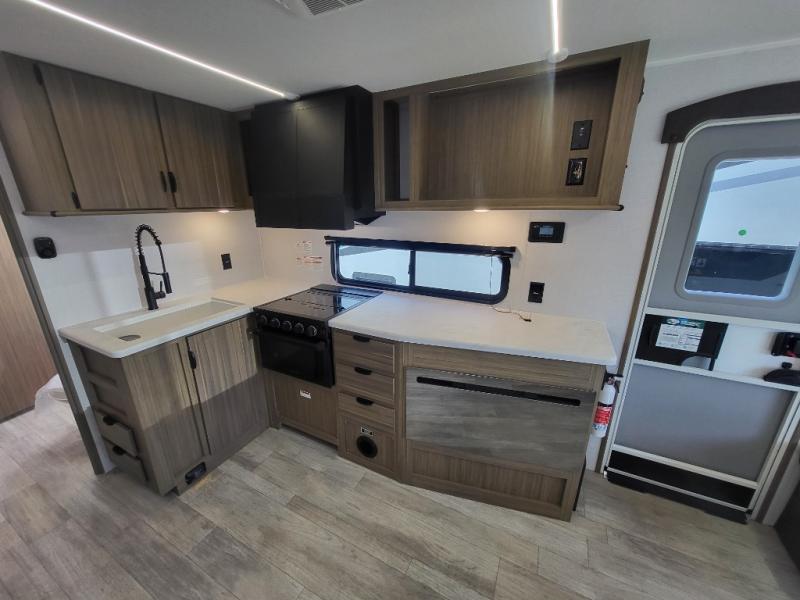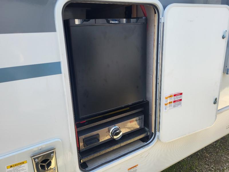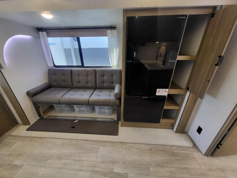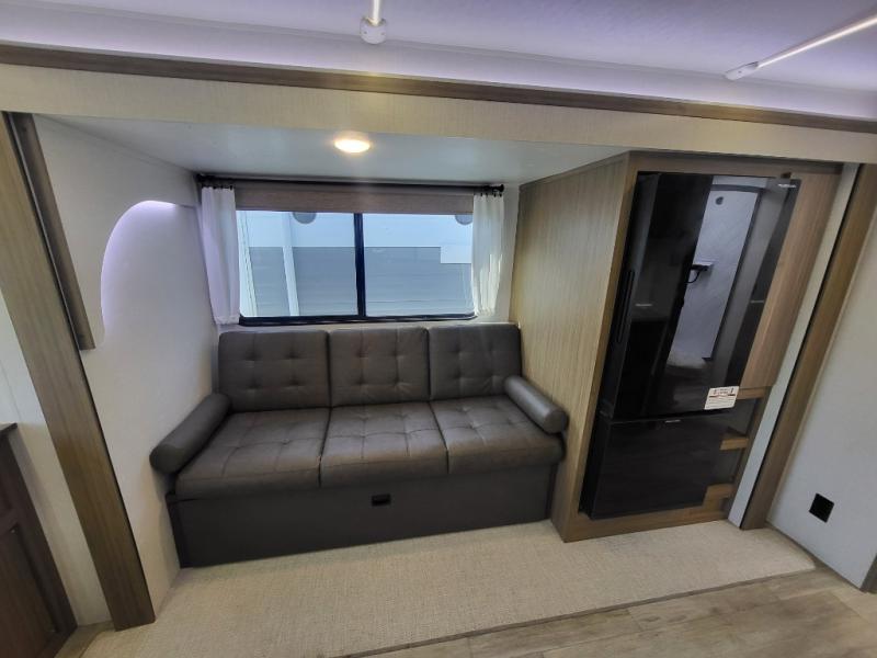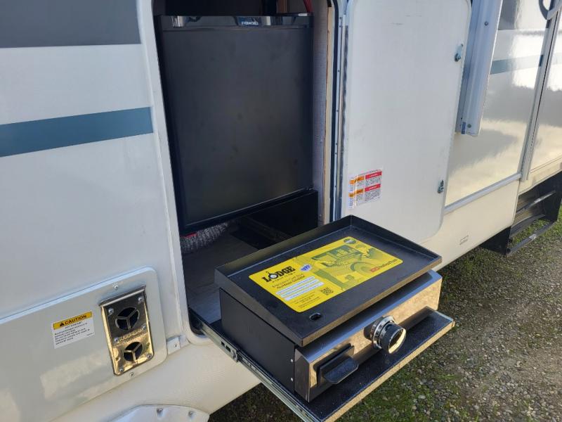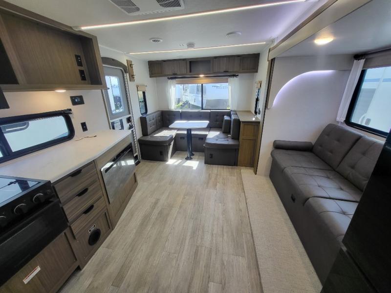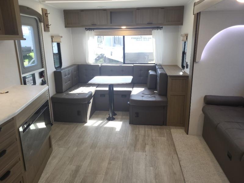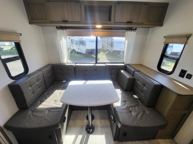 It won't be hard to find comfort in this spacious travel trailer for six! The rear U-shaped dinette includes storage space above and beside it for valuables, and the sofa within the slide out is right across from the fireplace for a cozy evening! There is also generous counter space in the full kitchen, plus an exterior camp kitchen the chef if sure to enjoy. The front master bedroom will have you feeling right at home with a custom king bed, dual wardrobes and nightstands, plus a closet for even more storage space!