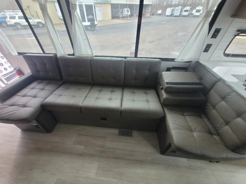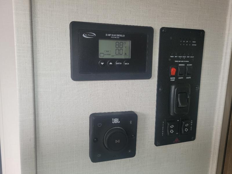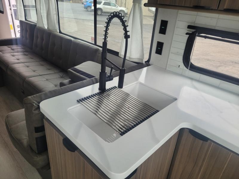 This VIEW travel trailer is just what you've been looking for! The rear kitchen features wrap-around countertops with stools and a rear window to let the outdoor views in! A sectional sofa is directly across from the entertainment center and fireplace, and behind here, you'll find the hidden bunkhouse! There is a flip-up mattress with a mattress pad below, storage space, plus a flip-down desk with a bar stool. The full bath includes a walk-in shower to easily get ready in the morning, and the front private bedroom is sure to make your space feel more like home. You'll sleep soundly on the custom king bed with Versa Tilt, and there is a wardrobe to store you clothes. Head outdoors to enjoy the 22' awning and outside camp kitchen!