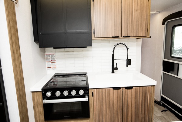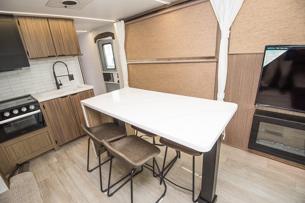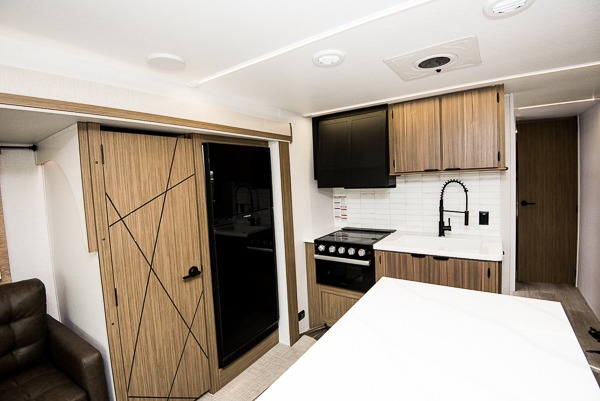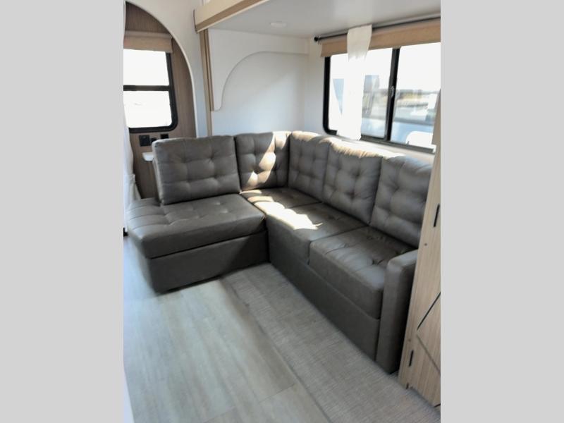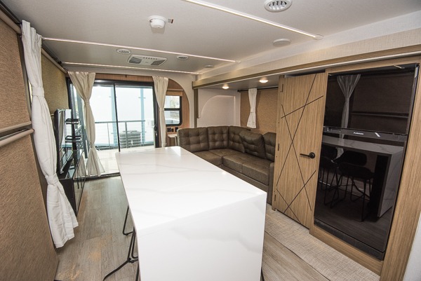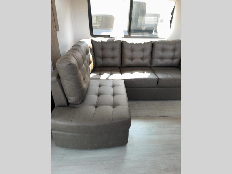 This travel trailer will feel more like home with its rear veranda/porch, dual entry doors, and front private bedroom! There is an outdoor kitchen on the back porch so you can make lunch in the fresh air, and the patio doors lead right into the main living area. Your crew can relax on the L-shaped sofa across from the fireplace, which will make your space more cozy. A kitchen island with four chairs will provide a place to dine at, and there is a spacious pantry and refrigerator for food storage. You will love having your own space in the private bedroom, and the Versa-Tilt custom king bed will let you sit up in bed to read your book at night.