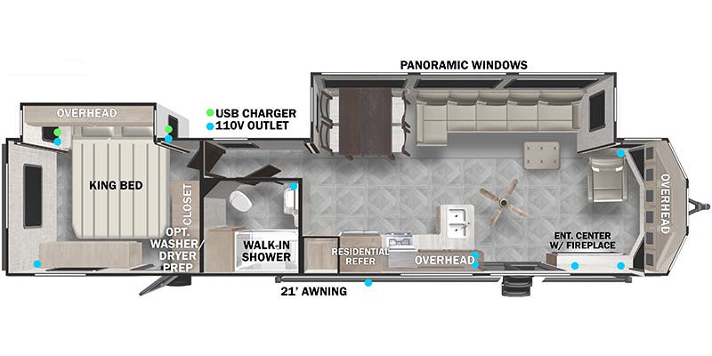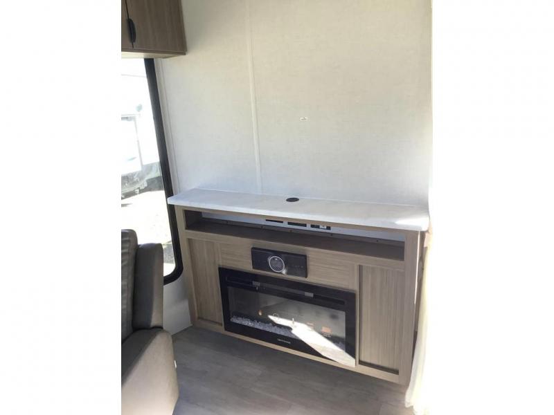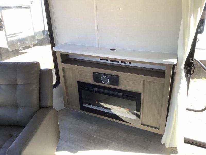 Why not stay a little longer the next time you are at your favorite spot in this Salem Villa Series destination trailer! You can sleep in late on your own king bed with Versa Tilt slide and have plenty of storage for your things. There is also the option to add washer and dryer prep if you want the option to make laundry day easier at the campground. You can also gaze out the many windows looking at the scenery before getting up, or head outside the second entry door for a walk or to sit under the 21' awning. The cook will love the kitchen layout with an L-shaped countertop, a pantry, and all the appliances needed for warm or cold meals. The huge slide in the living area gives you more floor space, and the panoramic windows add more natural light and great views. The ceiling fan will keep everyone cool on warm days, and the cozy fireplace with entertainment center can be used to take off a chill on cool evenings or to add a bit of ambiance to the room.