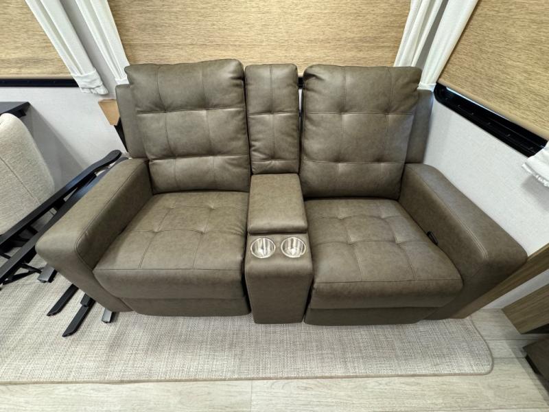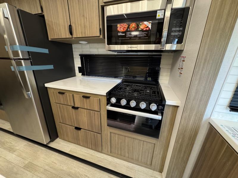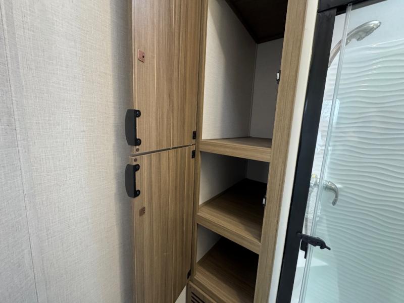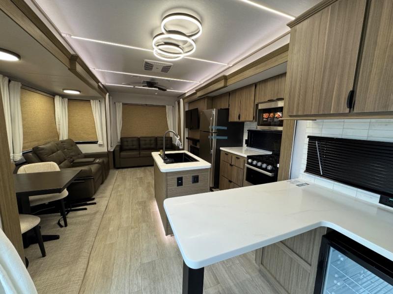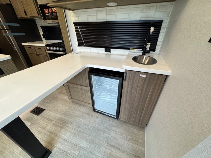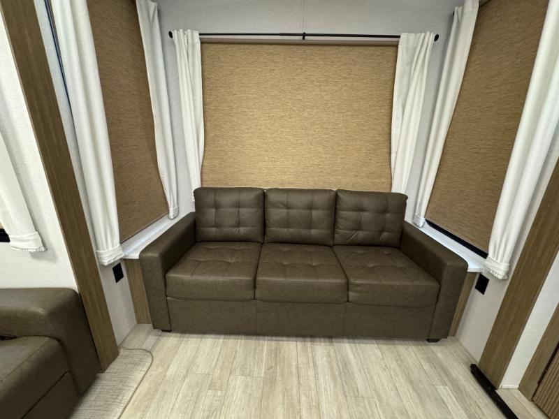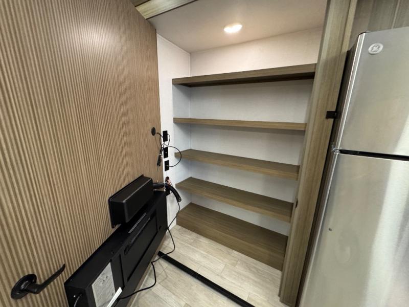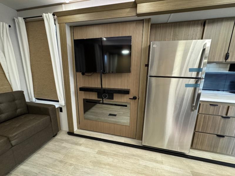 Head to your favorite place for a long weekend, or for the summer with this Salem Villa destination trailer. You are going to love the L-shaped bar area with two bar height chairs plus a sink and mini refrigerator for beverages. The rest of the kitchen area is wide open with dual opposing slides featuring stainless steel appliances, a kitchen island with a double sink, and a dining table with four chairs. The living area, which is combined here, features a sofa and theater seating for movie night or just relaxing. Enjoy the added ambiance from the fireplace with a entertainment center. Head to your right as you enter the main patio door and find a full bath with walk-in shower, toilet, plus a vanity with sink and medicine cabinet overhead. There is also a walk-in pantry for all of your storage needs. Continue on to the front master bedroom where you will enjoy a great night's rest on a king bed with Versa Tilt. There is also a nice closet with optional washer and dryer prep if you want the option to make laundry day easier.