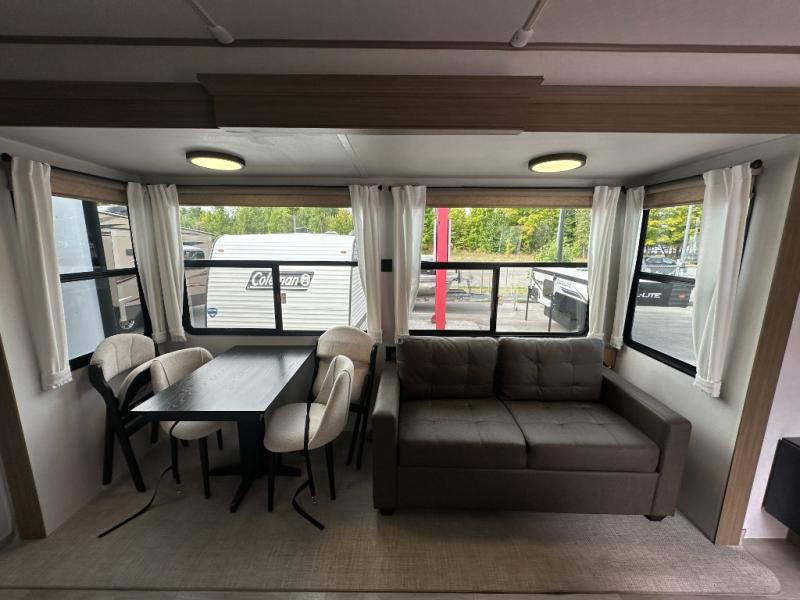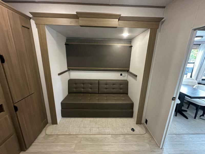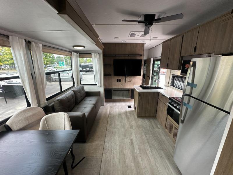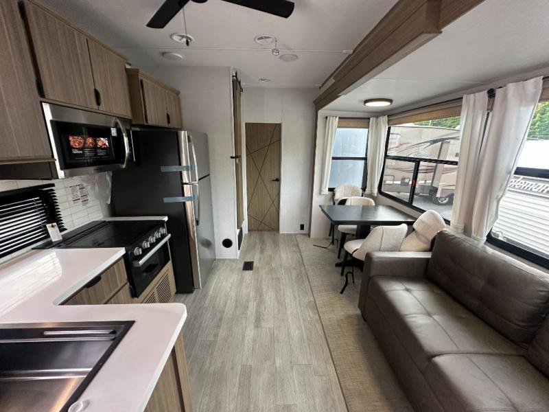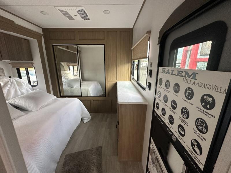 The Forest River Salem Villa Series destination trailer offers you an excellent space to relax in and rejuvenate your adventurous spirit! The 7' interior height is going to provide you with an open and spacious living area, and the heated and enclosed accessi-belly will protect your trailer from the elements. The Salem Villa Series comes loaded with upgraded designer furniture, a modern headboard redesign, stainless steel kitchen appliances, adjustable texture roller shades , and central vacuum with sweep attachment for a spotless home. There is also a few new features, including JBL speakers in the interior/exterior, a 4K blade lighting, a 60K tankless water heater, and more comforts!