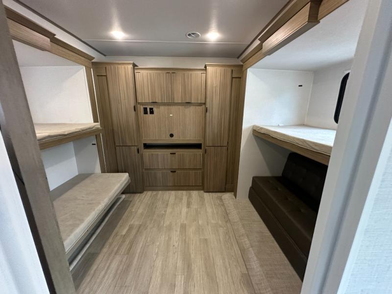 Spend your weekends sleeping on your own queen-size bed in the private bedroom while your guests or children spend their time in their very own bunkhouse suite that has opposing bunk bed slides and its own half bathroom with a private exterior entry door. The kitchen provides the necessary amenities such as a burner stove, a 1.6 cu. ft. oversized residential microwave, and a double-basin undermount sink. The residential refrigerator will store all your leftovers as well. You can dine and play games. On top of all of that, you will also be able to unwind in front of a cozy fireplace each night before you head to bed and drift off dreaming of the new day of adventure coming!