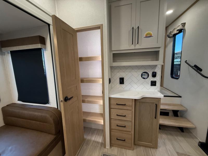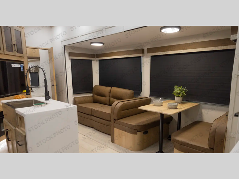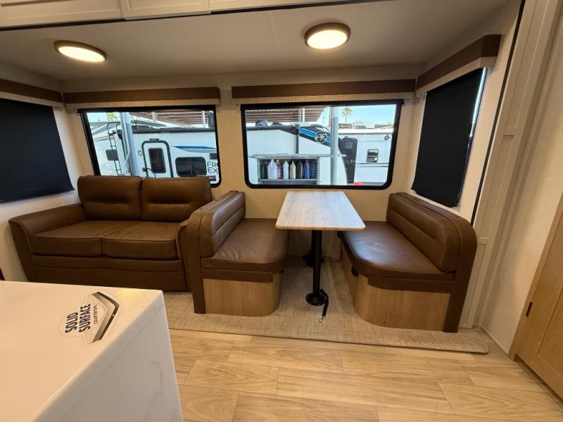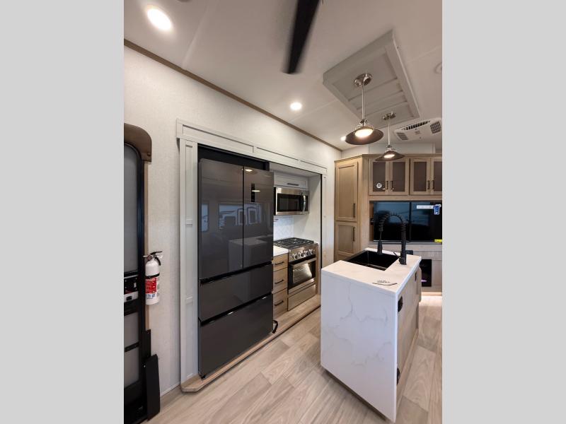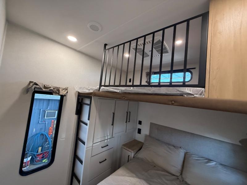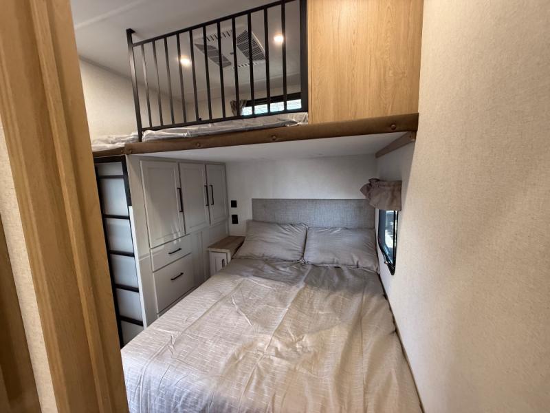 This fifth wheel is perfect for those who like to camp with a whole group, whether it be with family or friends! There is a rear private suite with a lower RV queen bed and 54" x 74" loft bed, a half bath, and your own private entrance. The front private bedroom includes a king bed slide out with a large front wardrobe and quick access into the spacious full bath. Everyone can meet in the main living area that includes dual opposing slides, a tri-fold hide-a-bed sofa and a booth dinette, plus a 50" TV for movie night. There is also a pantry for snacks, and a ceiling fan to keep the air moving. You will also love the exterior flat top cooktop for breakfast outdoors, and the two power awnings with LED lights will provide shade during the day and ambience at night!