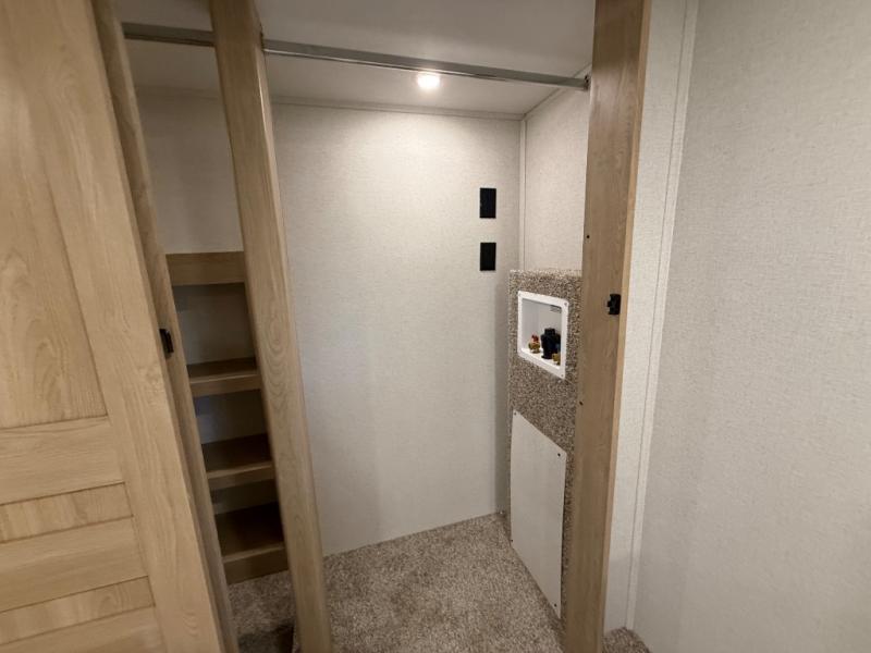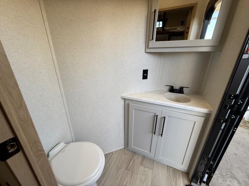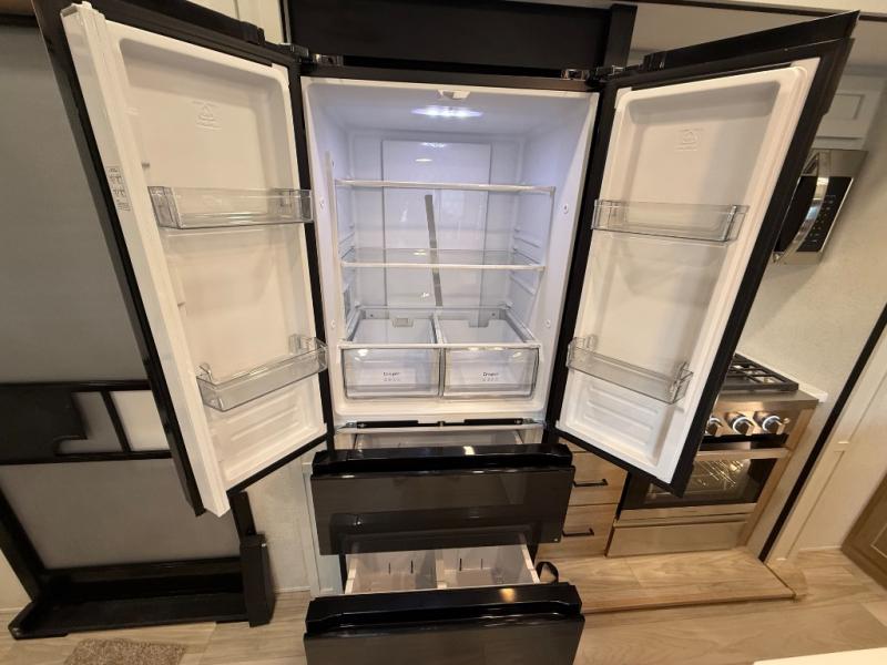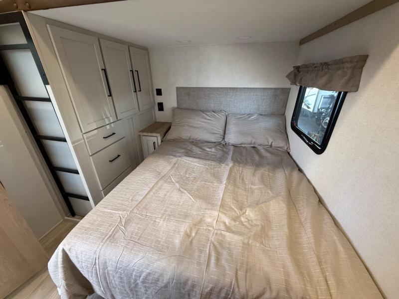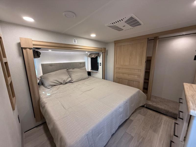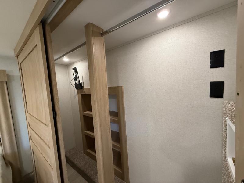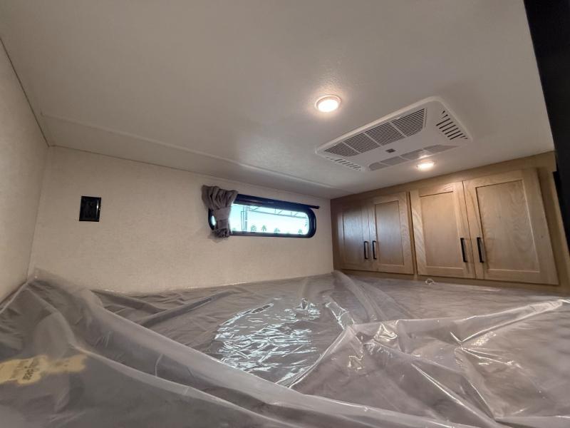 This fifth wheel is perfect for those who like to camp with a whole group, whether it be with family or friends! There is a rear private suite with a lower RV queen bed and 54" x 74" loft bed, a half bath, and your own private entrance. The front private bedroom includes a king bed slide out with a large front wardrobe and quick access into the spacious full bath. Everyone can meet in the main living area that includes dual opposing slides, a tri-fold hide-a-bed sofa and a booth dinette, plus a 50" TV for movie night. There is also a pantry for snacks, and a ceiling fan to keep the air moving. You will also love the exterior flat top cooktop for breakfast outdoors, and the two power awnings with LED lights will provide shade during the day and ambience at night!