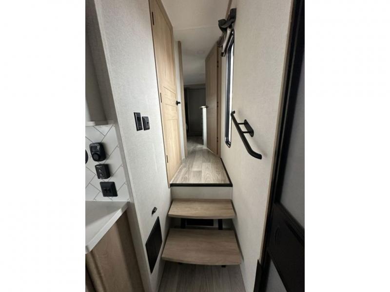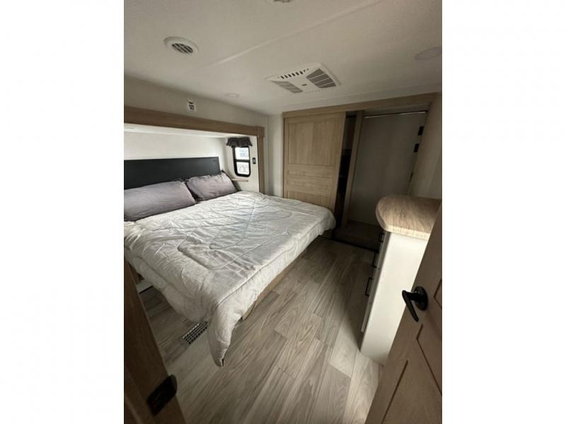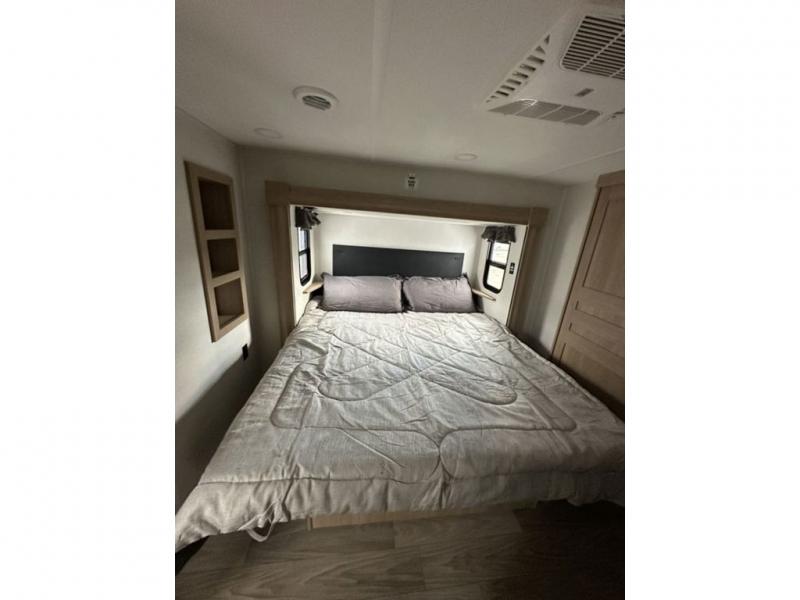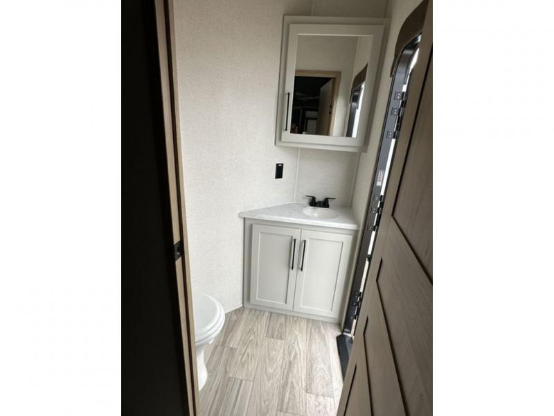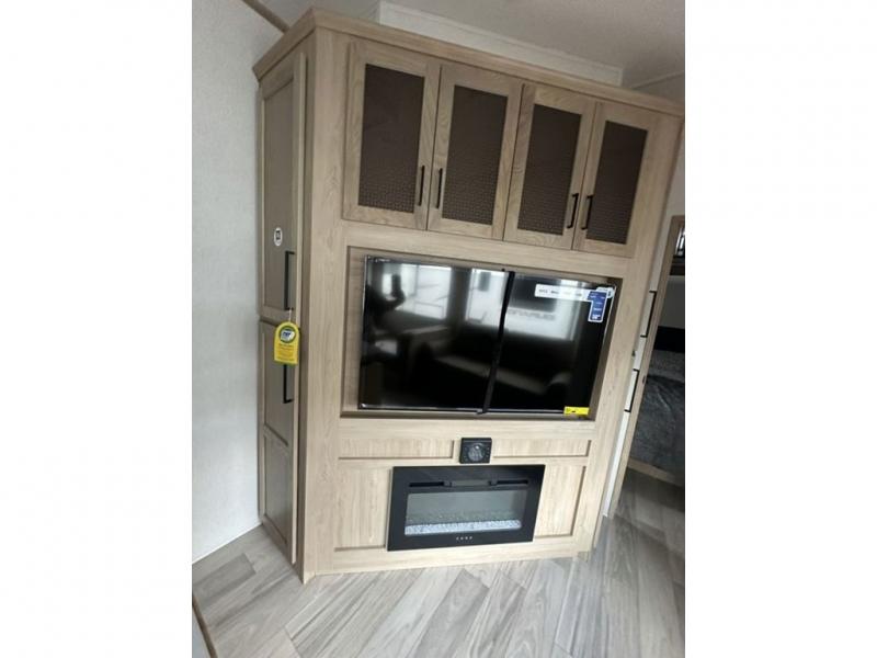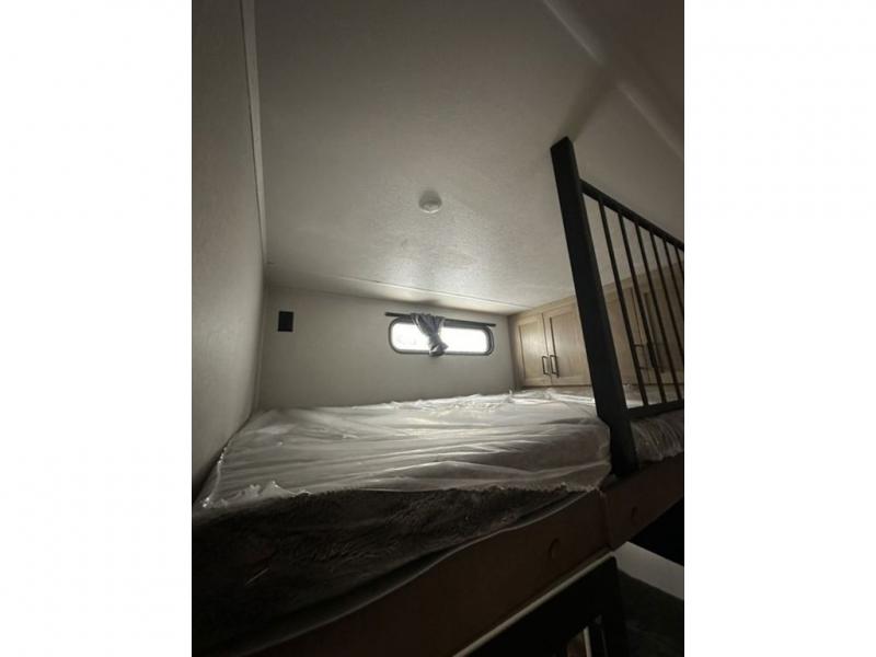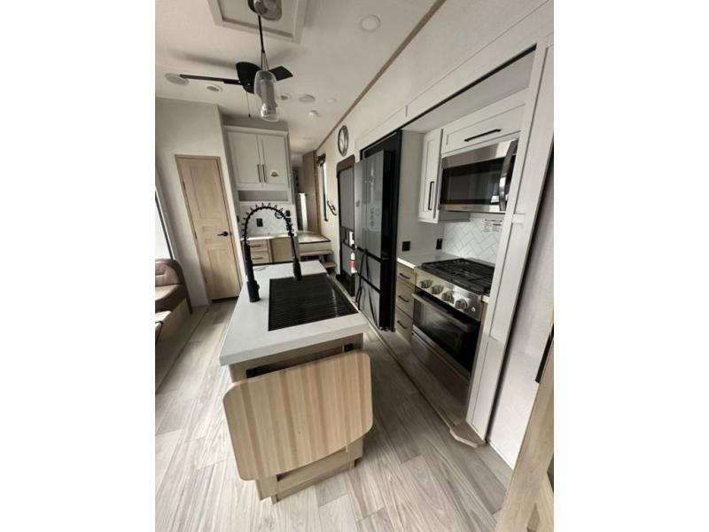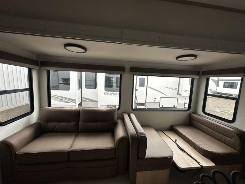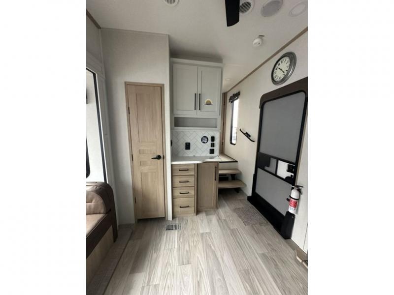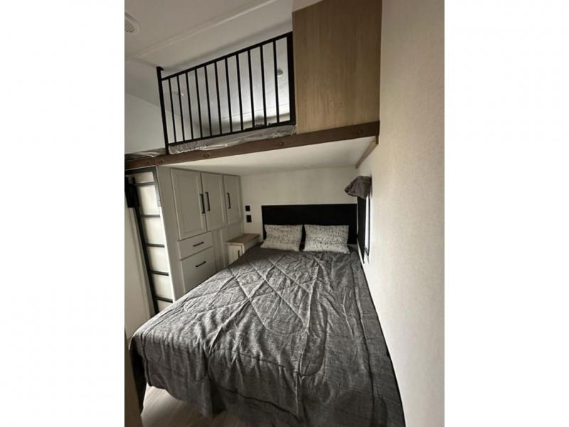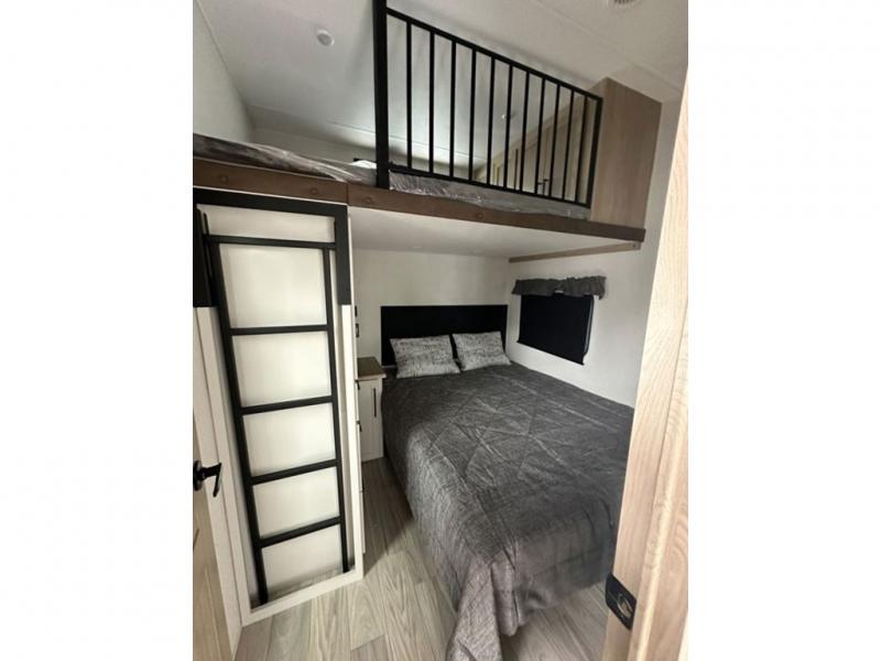 This fifth wheel is perfect for those who like to camp with a whole group, whether it be with family or friends! There is a rear private suite with a lower RV queen bed and 54" x 74" loft bed, a half bath, and your own private entrance. The front private bedroom includes a king bed slide out with a large front wardrobe and quick access into the spacious full bath. Everyone can meet in the main living area that includes dual opposing slides, a tri-fold hide-a-bed sofa and a booth dinette, plus a 50" TV for movie night. There is also a pantry for snacks, and a ceiling fan to keep the air moving. You will also love the exterior flat top cooktop for breakfast outdoors, and the two power awnings with LED lights will provide shade during the day and ambience at night!