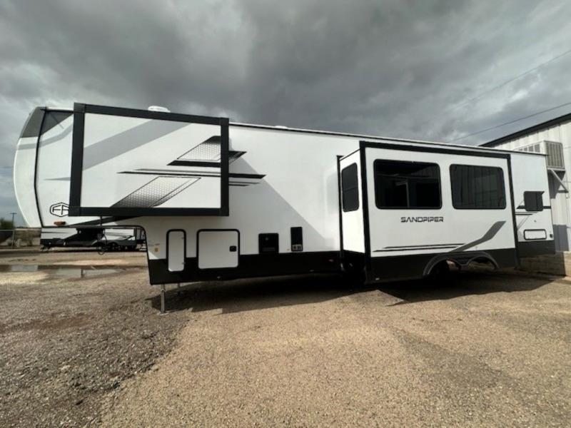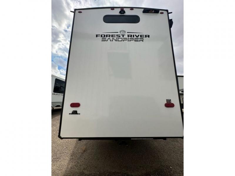 You will find the perfect balance of size, space, features, and luxury with any one of these Forest River Sandpiper fifth wheels! They are constructed with a welded aluminum framed vacuum bonded laminated superstructure, a cambered powder coated frame with rust prohibitor, and a fully enclosed underbelly for added protection against the elements. The large tinted windows come with a 80/20 UV prohibitor or you can choose the optional dual pane windows. Some hassle-free amenities include a 60k BTU on-demand water heater, full coach water filter system, tire pressure monitor system, and an electric leveling system! Inside, you'll enjoy stainless steel appliances, solid surface countertops, Beachside Sundance linoleum, recessed residential lighting, and many more comforts!