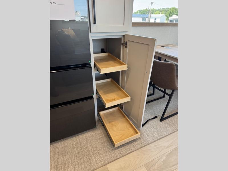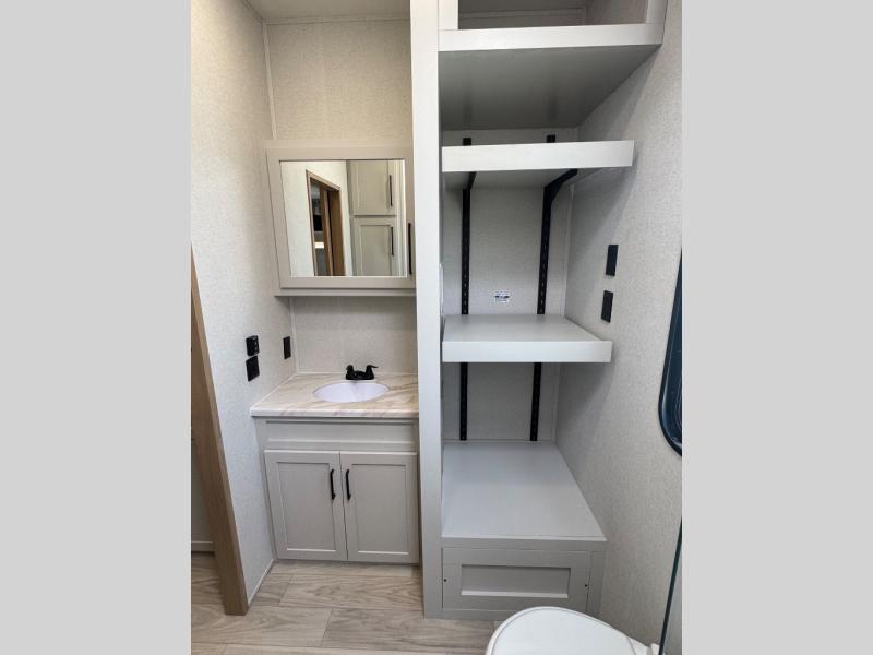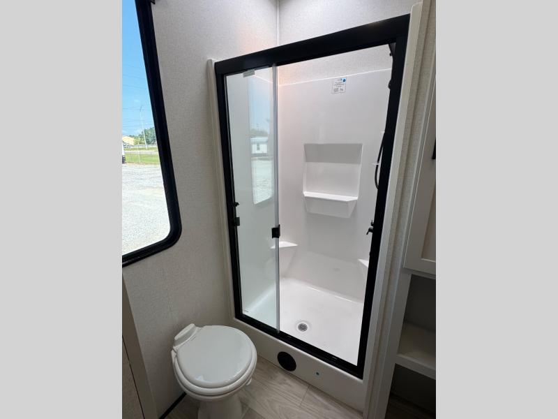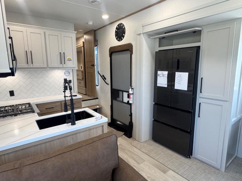 This fifth wheel is thoughtfully designed for comfort and convenience, starting with a spacious front bunkhouse perfect for accommodating guests. It features two flip-up bunks, 28" x 74" and 32" x 74" and a 60" x 74" fold-out lounge, along with a wardrobe, dresser, and additional storage to keep essentials organized. A nearby half bath adds easy access and extra convenience. At the center of the unit, the kitchen offers everything you need to prepare meals, including a stainless-steel sink, three-burner cooktop, and a generous 16 cu. ft. refrigerator. Meals can be enjoyed at the free-standing dinette, or you can unwind on the sectional sofa while enjoying the fireplace or entertainment center. At the rear, you'll find the private main bedroom with a roomy 66" x 80" RV king bed, plus its own wardrobe and dresser. Just steps away is the full bathroom featuring a one-piece fiberglass shower, sink with medicine cabinet, linen storage, and even washer/dryer prep for extended stays.