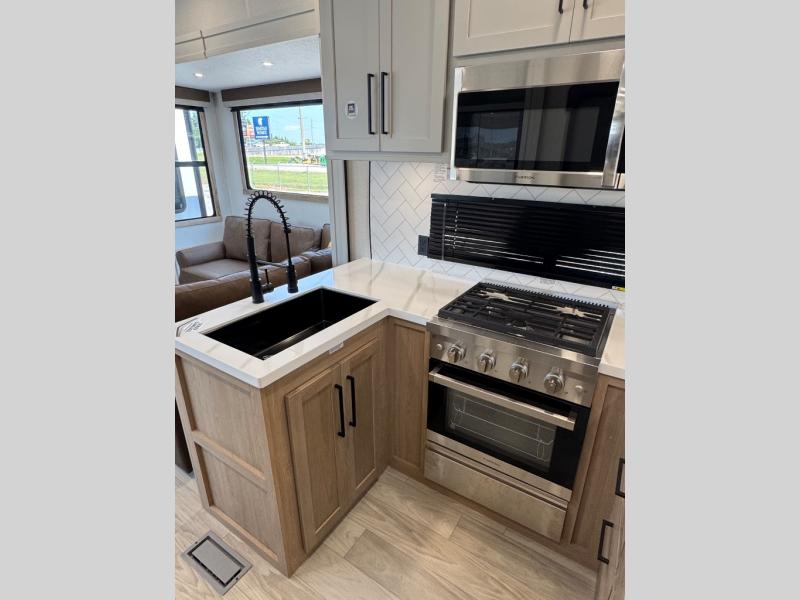 You will find the perfect balance of size, space, features, and luxury with any one of these Forest River Sandpiper fifth wheels! They have a cambered powder coated frame with rust prohibitor, and a fully enclosed underbelly for added protection against the elements. Also, the power front jacks with spring-loaded pins enhance the convenience, speed, and safety. The large, tinted windows come with a 80/20 UV prohibitors. Some hassle-free amenities include a 60k BTU on-demand water heater, porcelain foot flush toilet(s), tire pressure monitor system, and an electric leveling system! Inside, you'll enjoy stainless steel kitchen package, solid surface kitchen countertops, Beachside Sundance Congoleum linoleum, recessed residential lighting, and many more comforts!