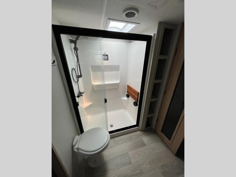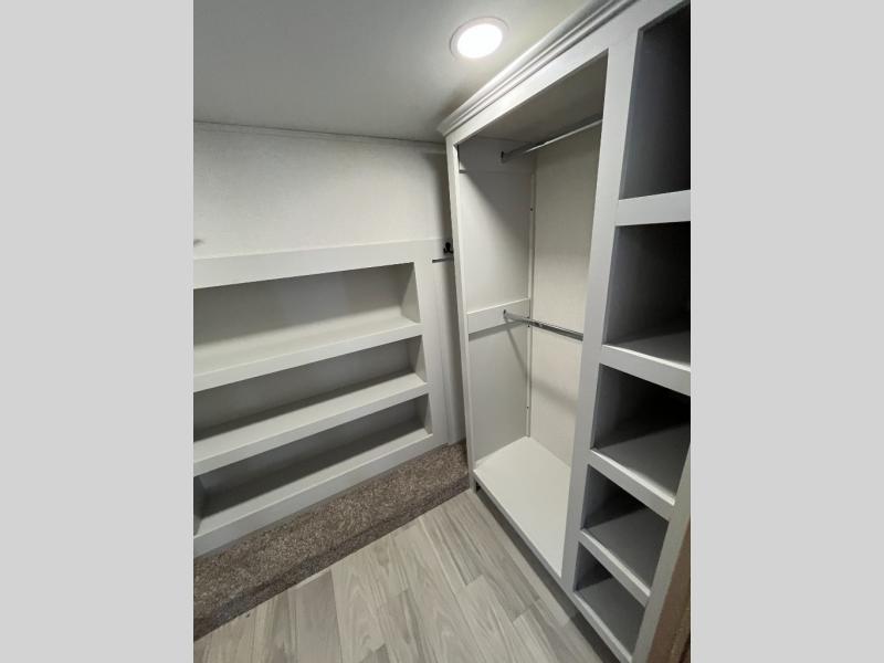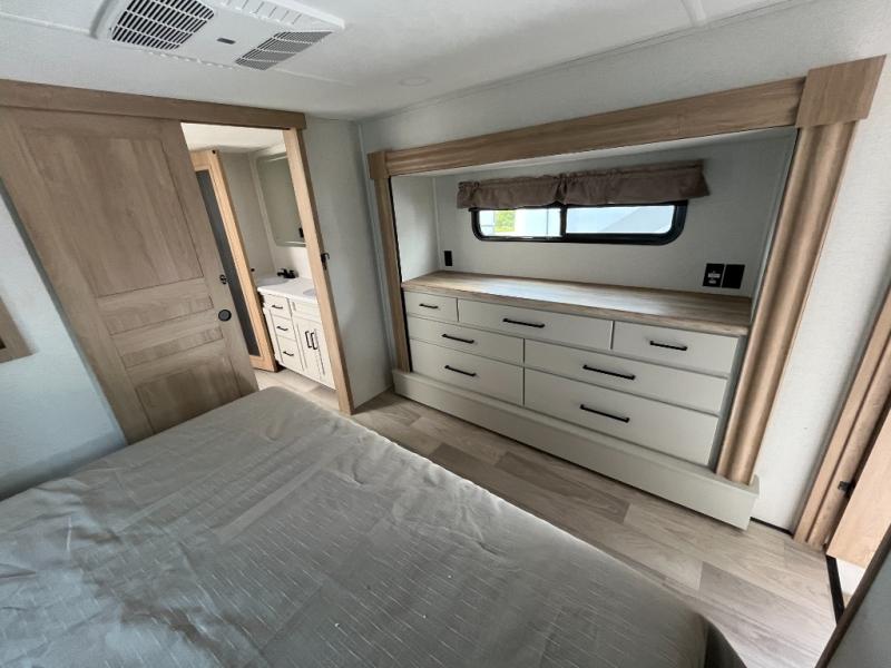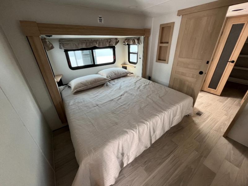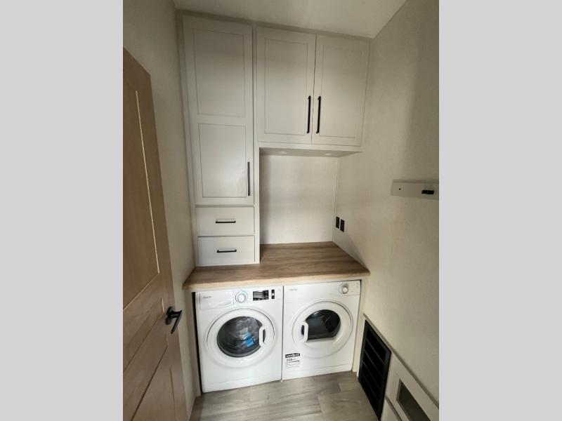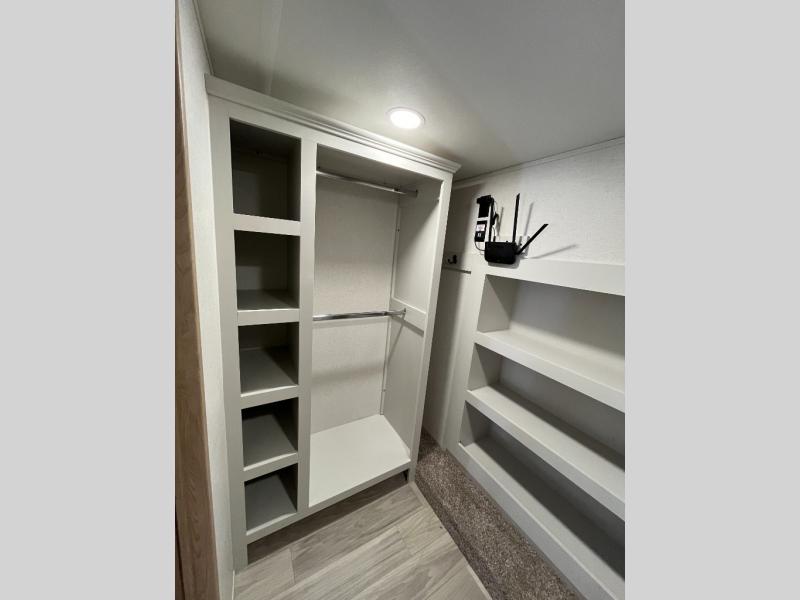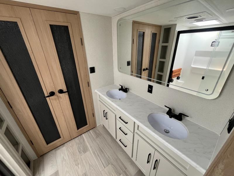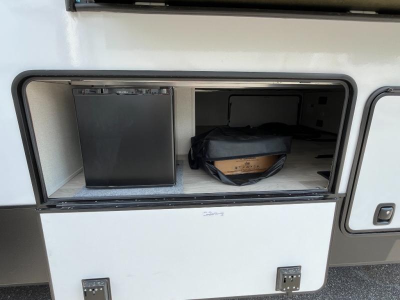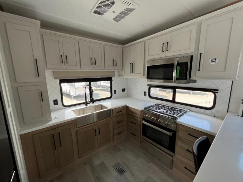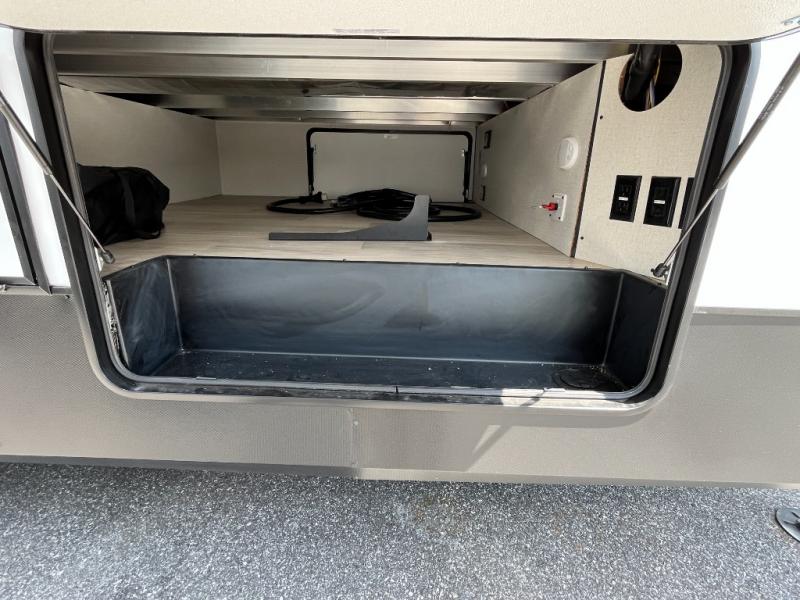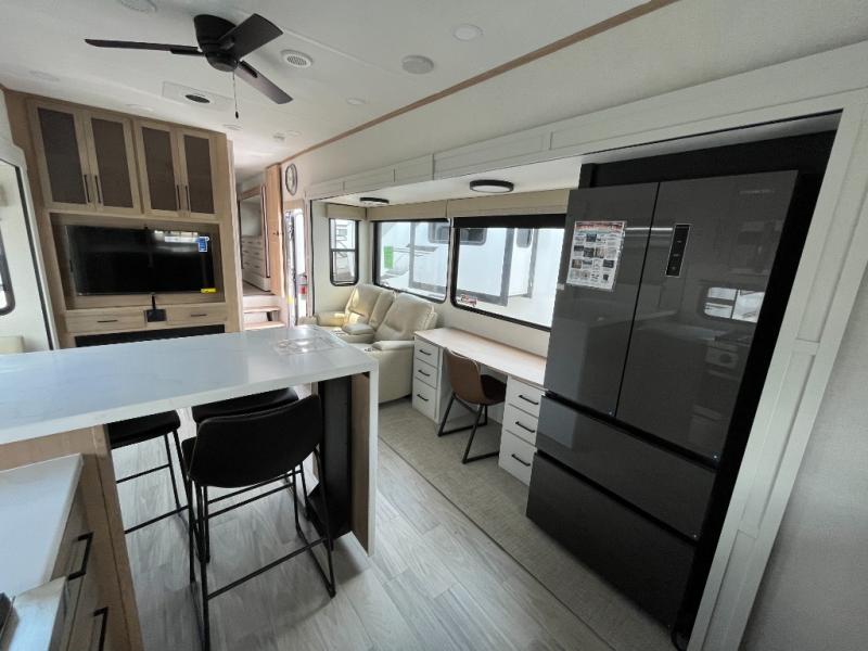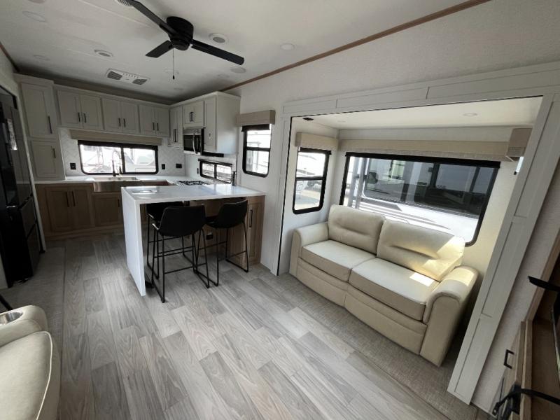 If you're looking to go full-time RVing, this fifth wheel is packed with convenient features! The master bedroom includes a king bed slide out with USB ports on either side of the bed so you both can charge your phones, and there is a dresser for your folded clothes. You will love the front bathroom with dual bath sinks, a shower with a seat, plus a walk-in closet with shelves! There is a unique middle utility room with washer and dryer prep and a counter that will make a perfect laundry room, or you can utilize this space for storage! Head to the main living area to relax on the theater seating or hide-a-bed sofa, and if you have guests stay over, they can sleep here. There is also an entertainment center with a 50" flat screen TV, but you might just leave that off if you're working at the desk with a chair that is provided. We've saved the best part for last; the kitchen! Here, you'll find ample counter space to prep home-cooked meals, a three burner range with a 24" oven, plus a large counter with barstools where you can enjoy breakfast at each morning. Choosing this fifth wheel is a no-brainer!