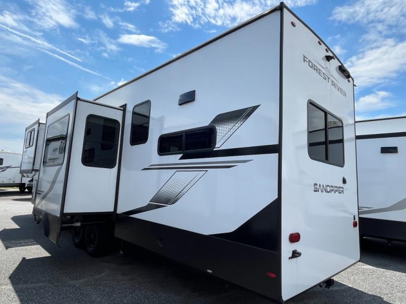 You will find the perfect balance of size, space, features, and luxury with any one of these Forest River Sandpiper fifth wheels! They are constructed with a welded aluminum framed vacuum bonded laminated superstructure, a cambered powder coated frame with rust prohibitor, and a fully enclosed underbelly to protect the units vitals during any season. The large tinted windows come with a 80/20 UV prohibitor or you can choose the optional dual pane windows. Some hassle-free amenities include a 60k BTU on-demand water heater, full coach water filter system, tire pressure monitor system, and an electric leveling system! Inside, you'll enjoy stainless steel appliances, solid surface countertops, Beachside Sundance linoleum, recessed residential lighting, and many more comforts!