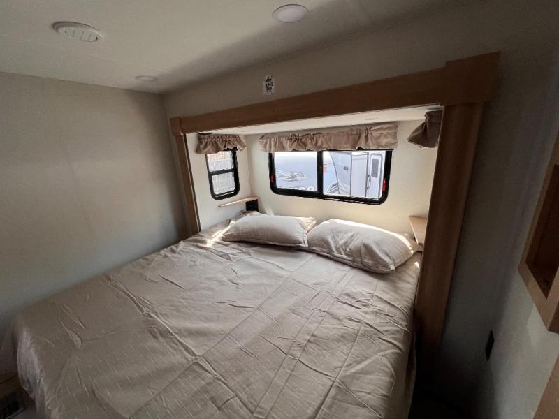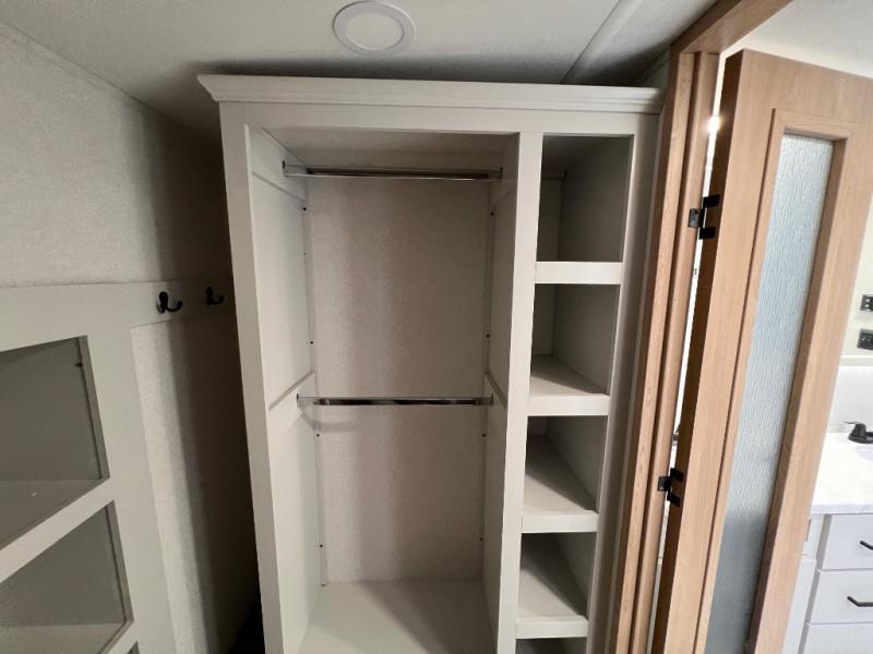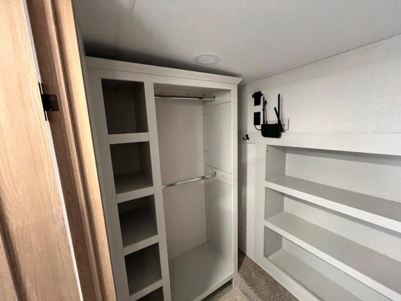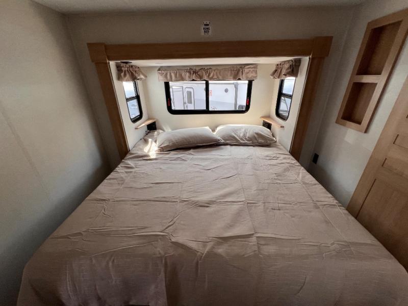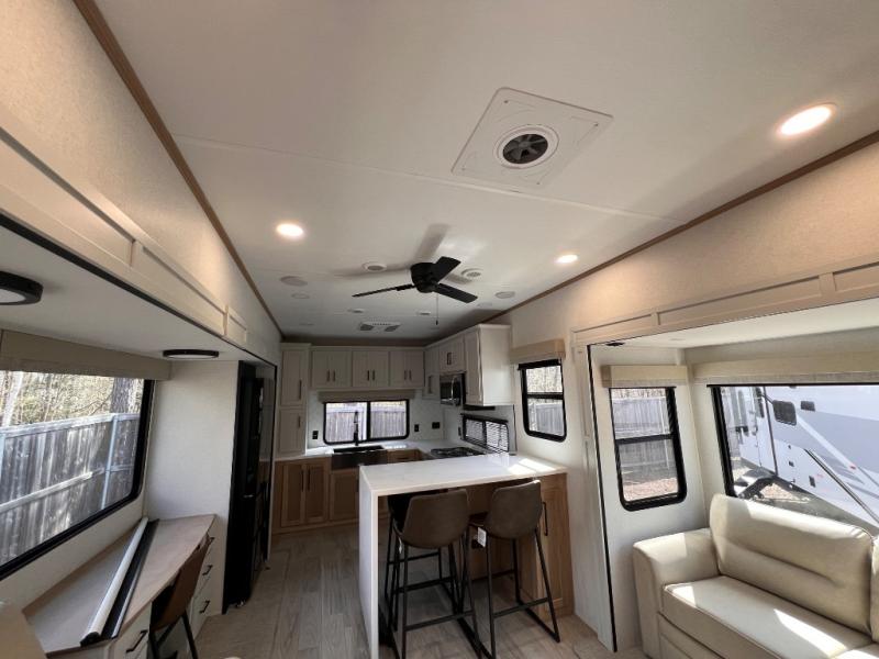 If you're looking to go full-time RVing, this fifth wheel is packed with convenient features! The master bedroom includes a king bed slide out with USB ports on either side of the bed so you both can charge your phones, and there is a dresser for your folded clothes. You will love the front bathroom with dual bath sinks, a shower with a seat, plus a walk-in closet with shelves! There is a unique middle utility room with washer and dryer prep and a counter that will make a perfect laundry room, or you can utilize this space for storage! Head to the main living area to relax on the theater seating or hide-a-bed sofa, and if you have guests stay over, they can sleep here. There is also an entertainment center with a 50" flat screen TV, but you might just leave that off if you're working at the desk with a chair that is provided. We've saved the best part for last; the kitchen! Here, you'll find ample counter space to prep home-cooked meals, a three burner range with a 24" oven, plus a large counter with barstools where you can enjoy breakfast at each morning. Choosing this fifth wheel is a no-brainer!