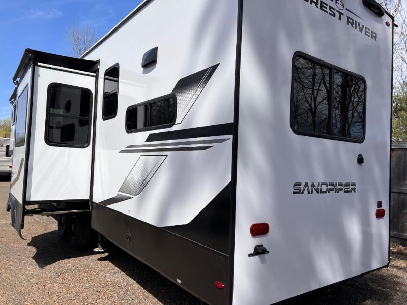 You will find the perfect balance of size, space, features, and luxury with any one of these Forest River Sandpiper fifth wheels! They are constructed with a welded aluminum framed vacuum bonded laminated superstructure, a cambered powder coated frame with rust prohibitor, and a fully enclosed underbelly for added protection against the elements. The large tinted windows come with a 80/20 UV prohibitor or you can choose the optional dual pane windows. Some hassle-free amenities include a 60k BTU on-demand water heater, full coach water filter system, tire pressure monitor system, and an electric leveling system! Inside, you'll enjoy stainless steel appliances, solid surface countertops, Beachside Sundance linoleum, recessed residential lighting, and many more comforts!